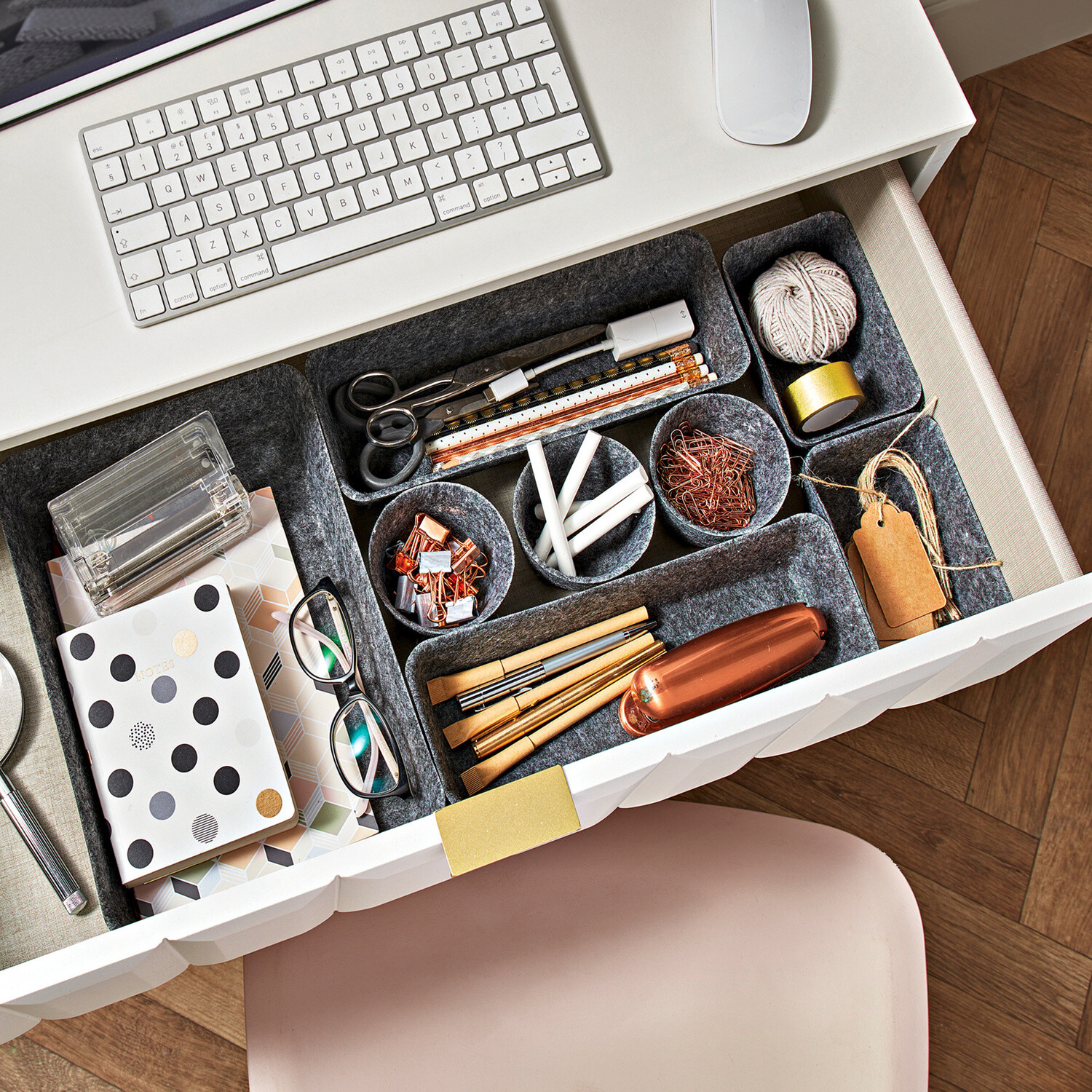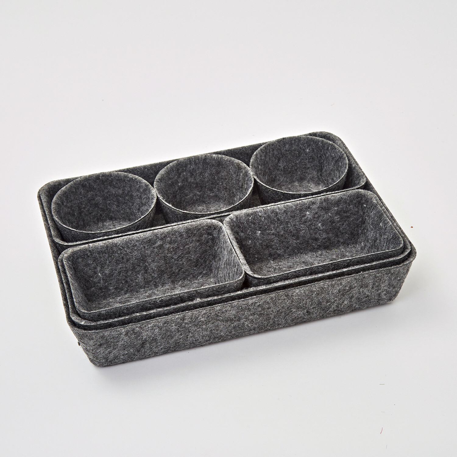 Ten zmienny 8-częściowy organizer zapewni porządek w szufladach każdej wielkości i wysokości, niezależnie od tego, czy chodzi o kosmetyki, przybory piśmienne czy drobiazgi. Wykonany jest z miękkiego i antypoślizgowego filcu, idealnego również np. na biżuterię i kosztowności. 8 przegródek o różnych rozmiarach. Zmienne zastosowanie. Nadaje się również do płytkich szuflad.