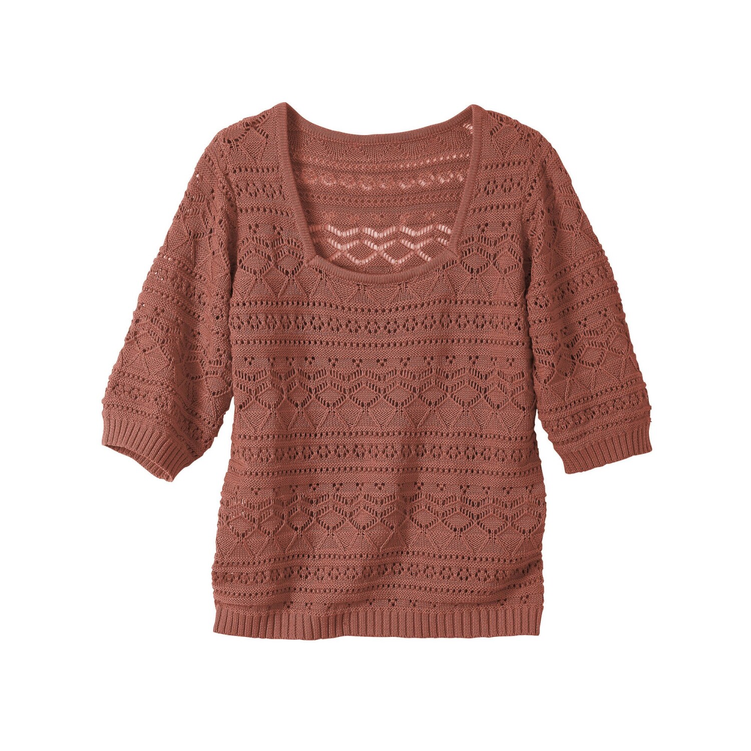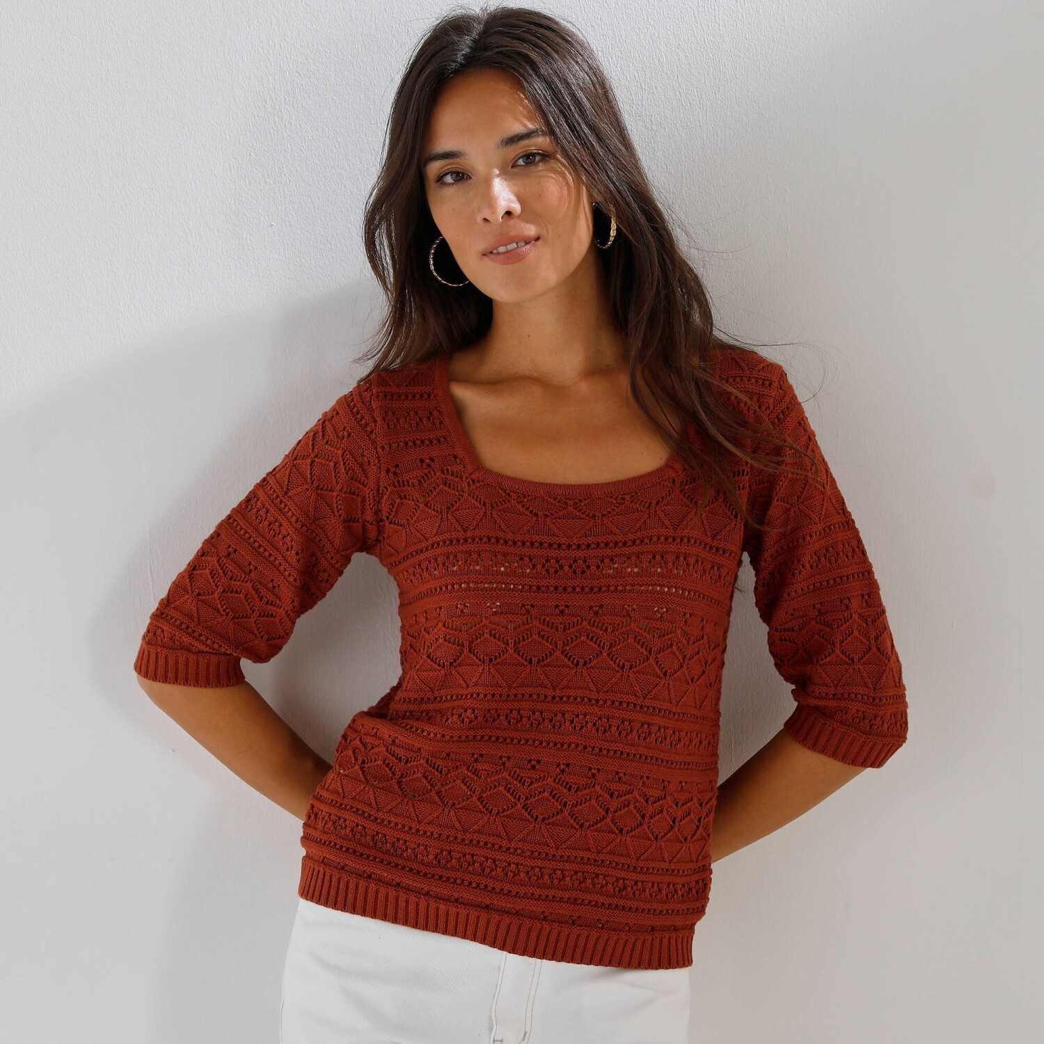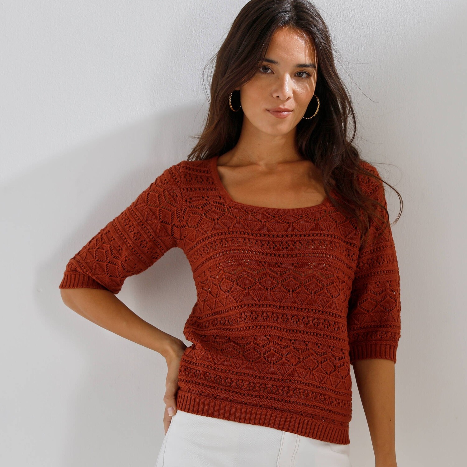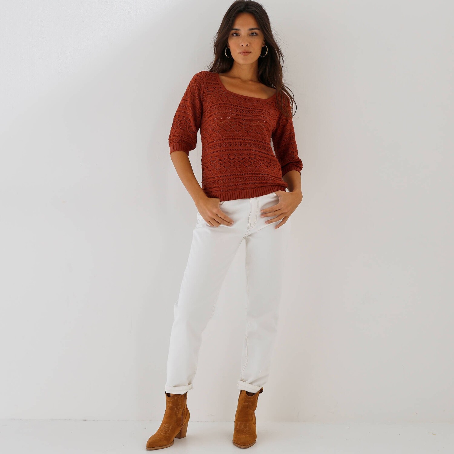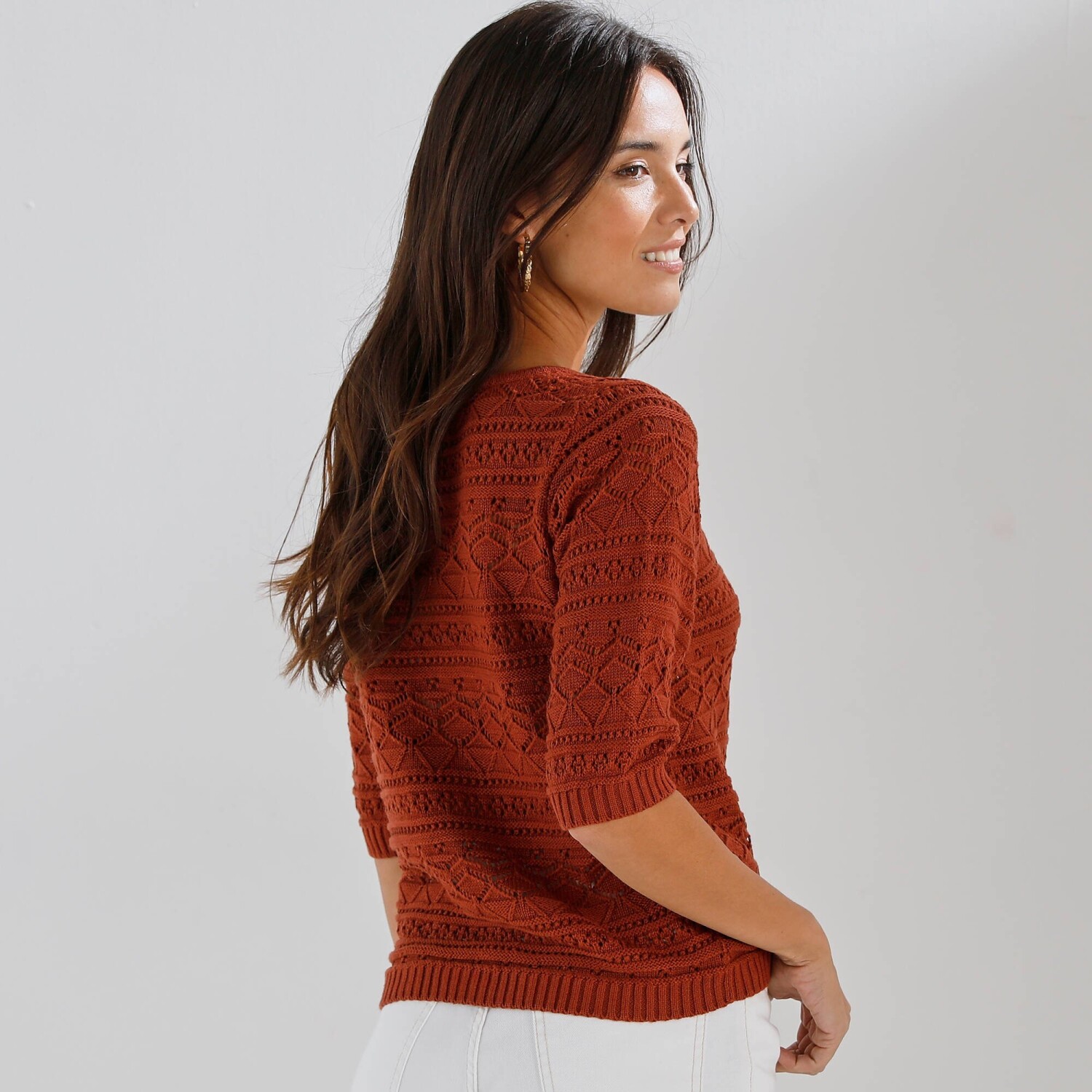 Modny sweter wyróżnia się wzorem w paski. Koszulka z nadrukiem odwróconym z efektem pionowych pasków. Stójka z falbanką. Długie rękawy bluzki z szerokimi, zwężanymi mankietami. Guziki z kryształkami i falbanka na końcach rękawów. Prosty, rozszerzany dół, zwężany ściągaczem. Można prać w pralce.