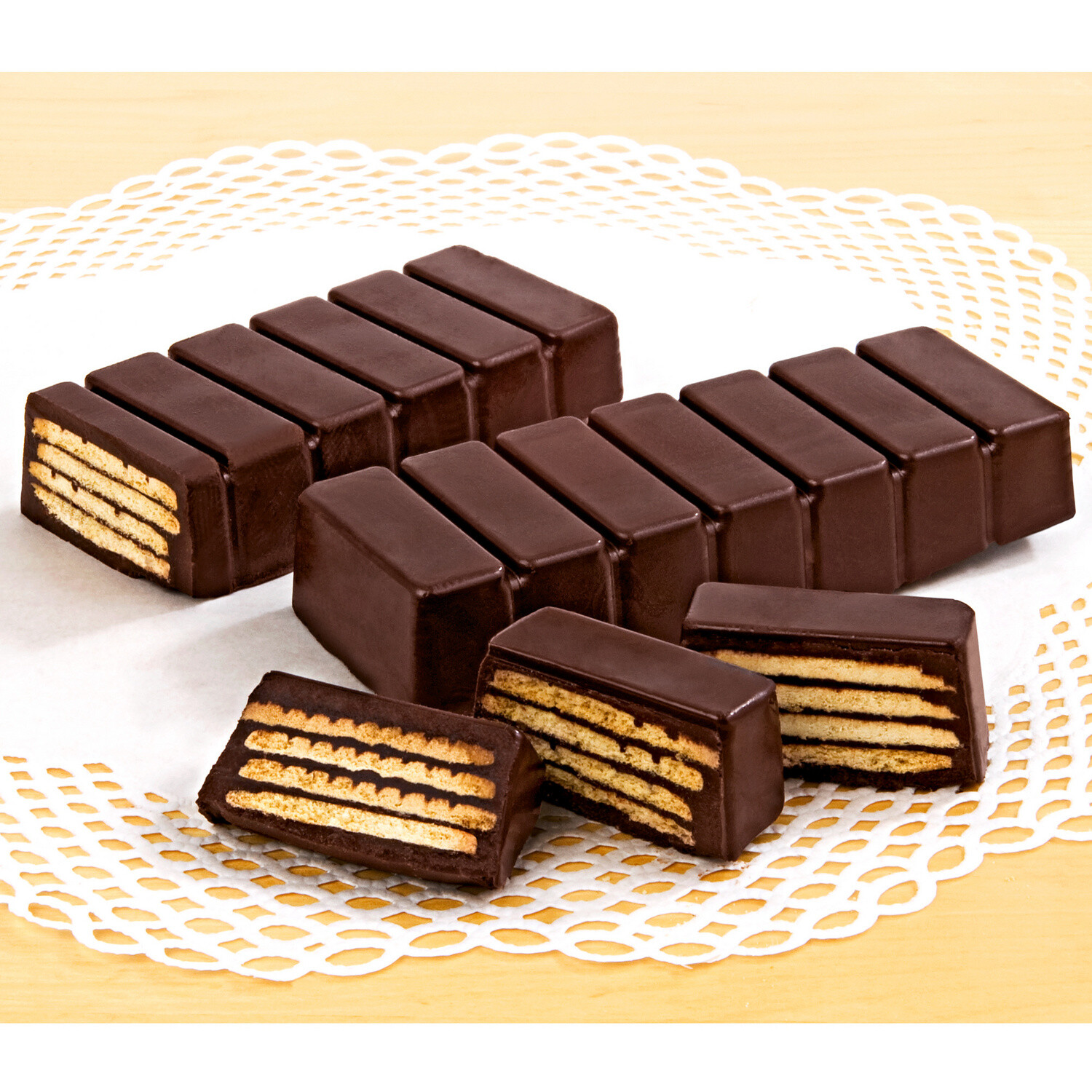 Delikatne rogaliki z kawałkami migdałów zanurzone w delikatnie rozpływającej się ciemnej czekoladzie. Osłódź sobie nimi zasłużone przerwy na kawę.