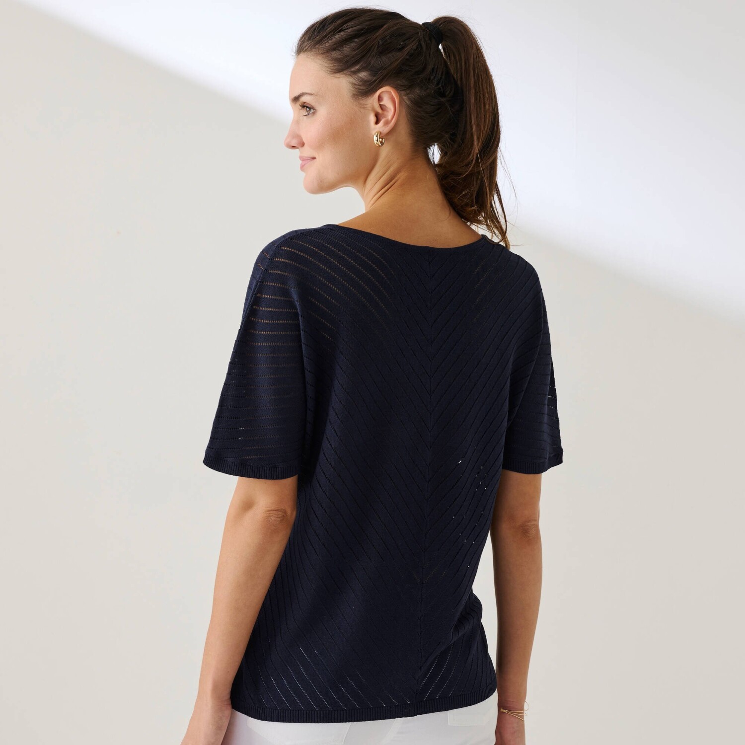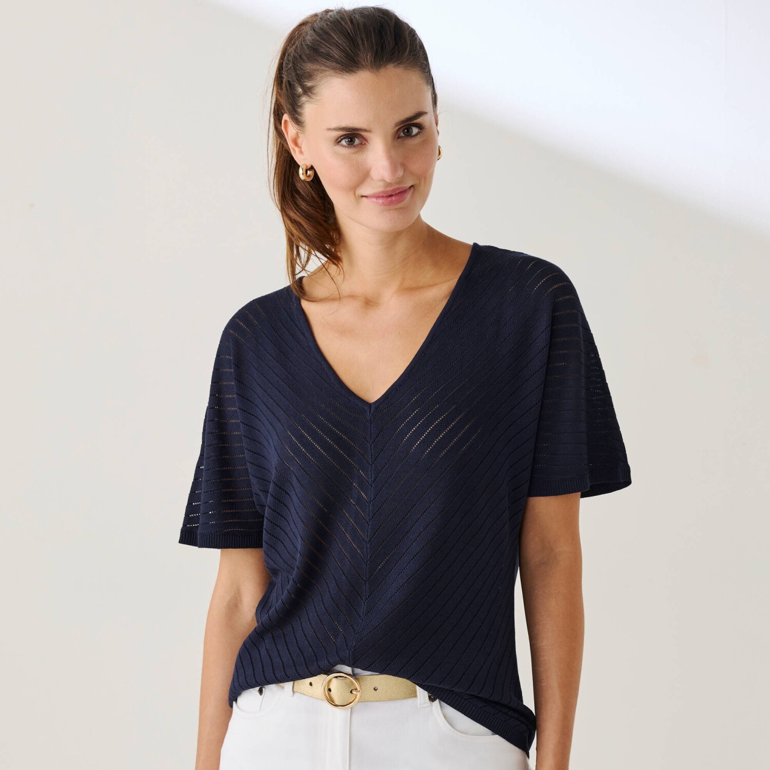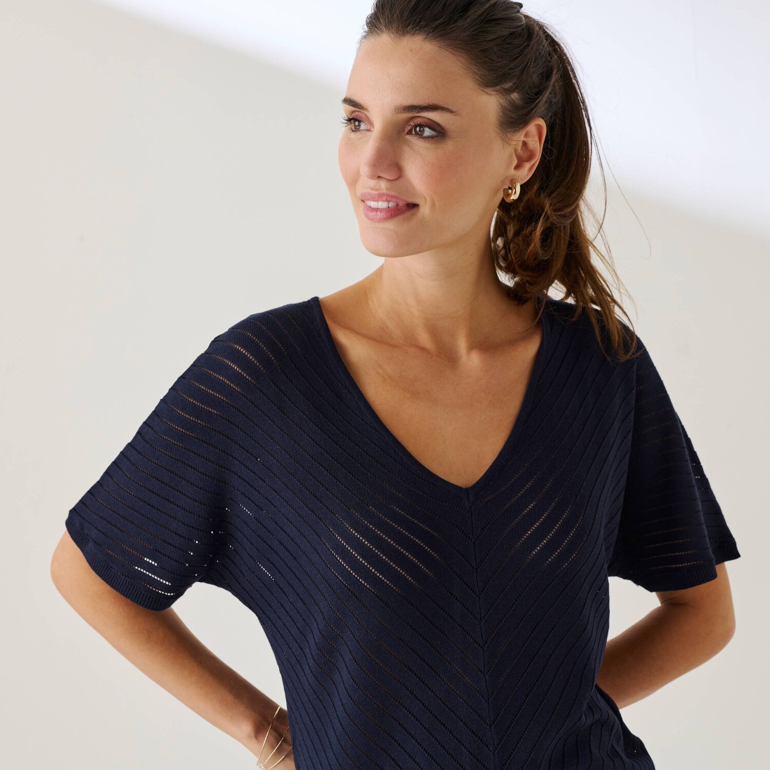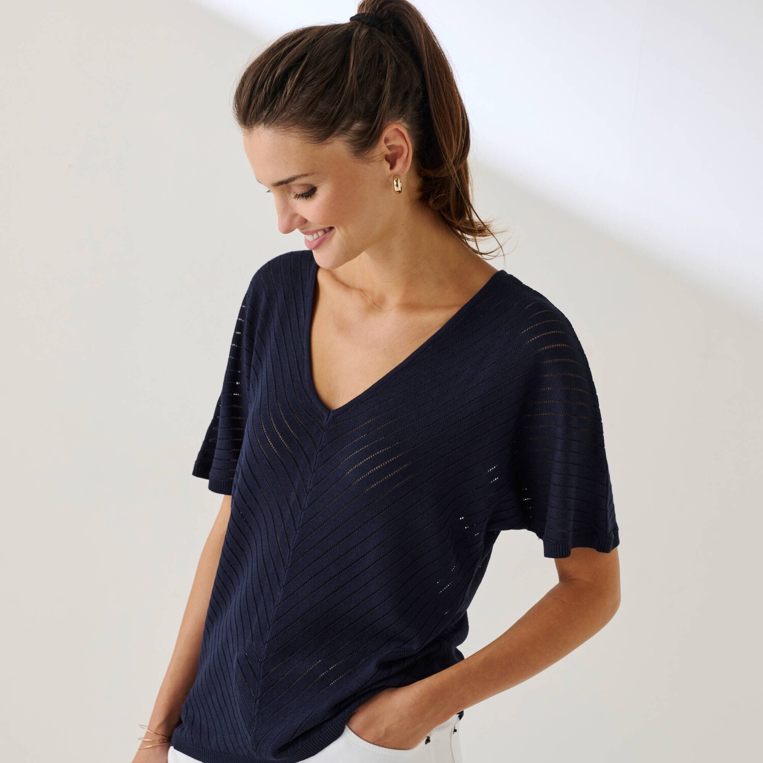 Bluzka z krepy z rękawami makramowymi i dekoltem w serek
