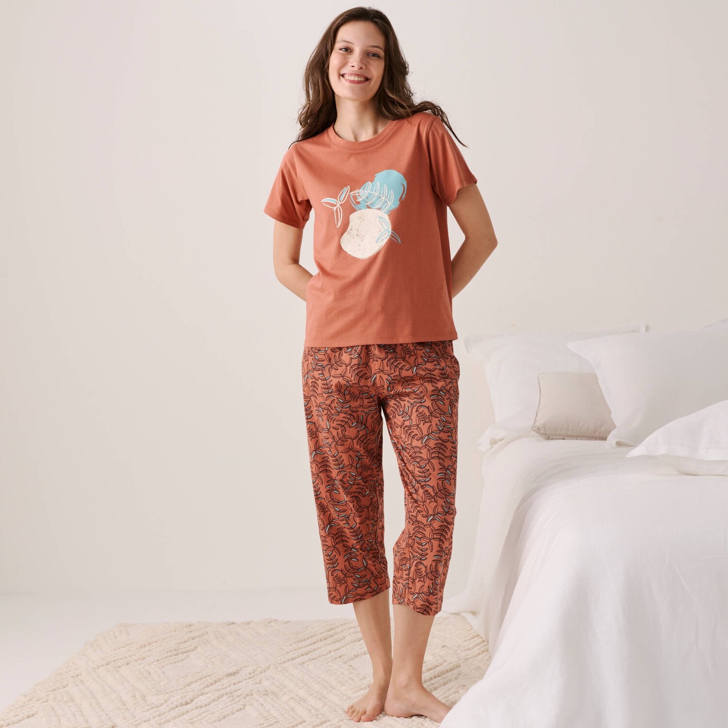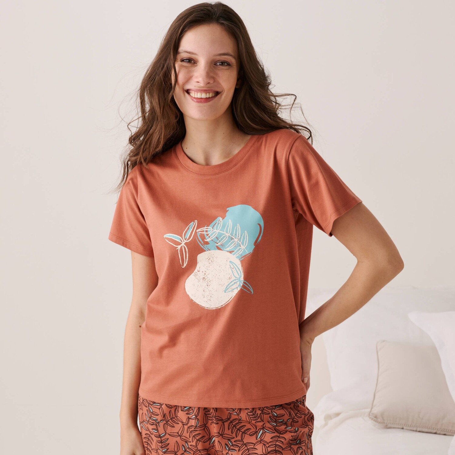 Stwórz swoją wymarzoną piżamę i zacznij od koszulki z krótkim rękawem z centralnym nadrukiem „Beautiful”. Dekolt w serek z lamówką w tym samym kolorze. Krótkie rękawy. Nadruk z przodu. Prosty dół. Elastyczna dzianina. Standard 100 według Oeko-Tex (nr CQ 1216 / 3 IFTH). Ten znak identyfikuje produkty tekstylne poddane testom laboratoryjnym na obecność szerokiej gamy substancji szkodliwych, a produkt jest bezpieczny w stopniu wykraczającym poza obowiązujące normy. Można prać w pralce.