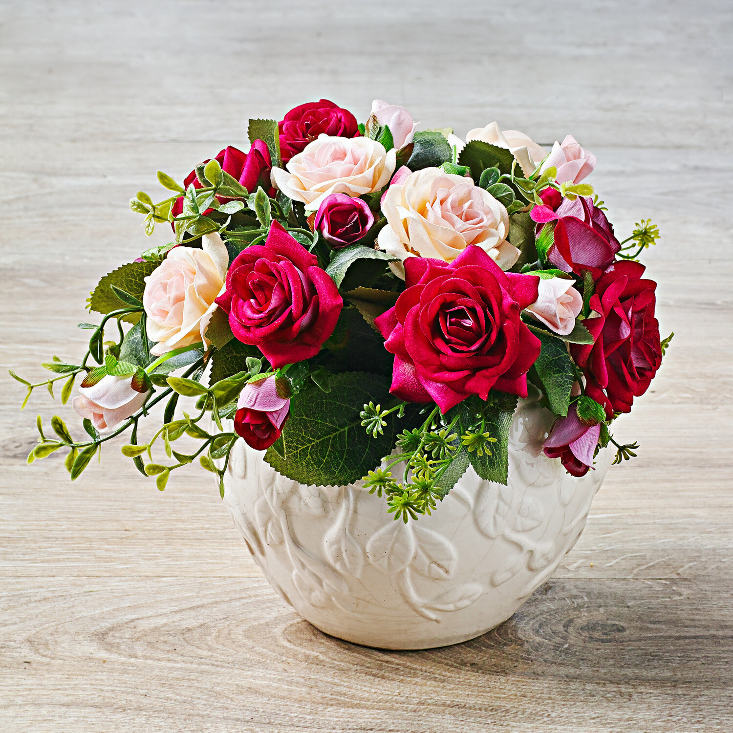 Czerwone róże i białe lilie połączone w bujny bukiet. Ozdobi on grób bliskiej Ci osoby o każdej porze roku i oszczędzi kłopotów związanych z jego pielęgnacją - bez podlewania i przycinania.