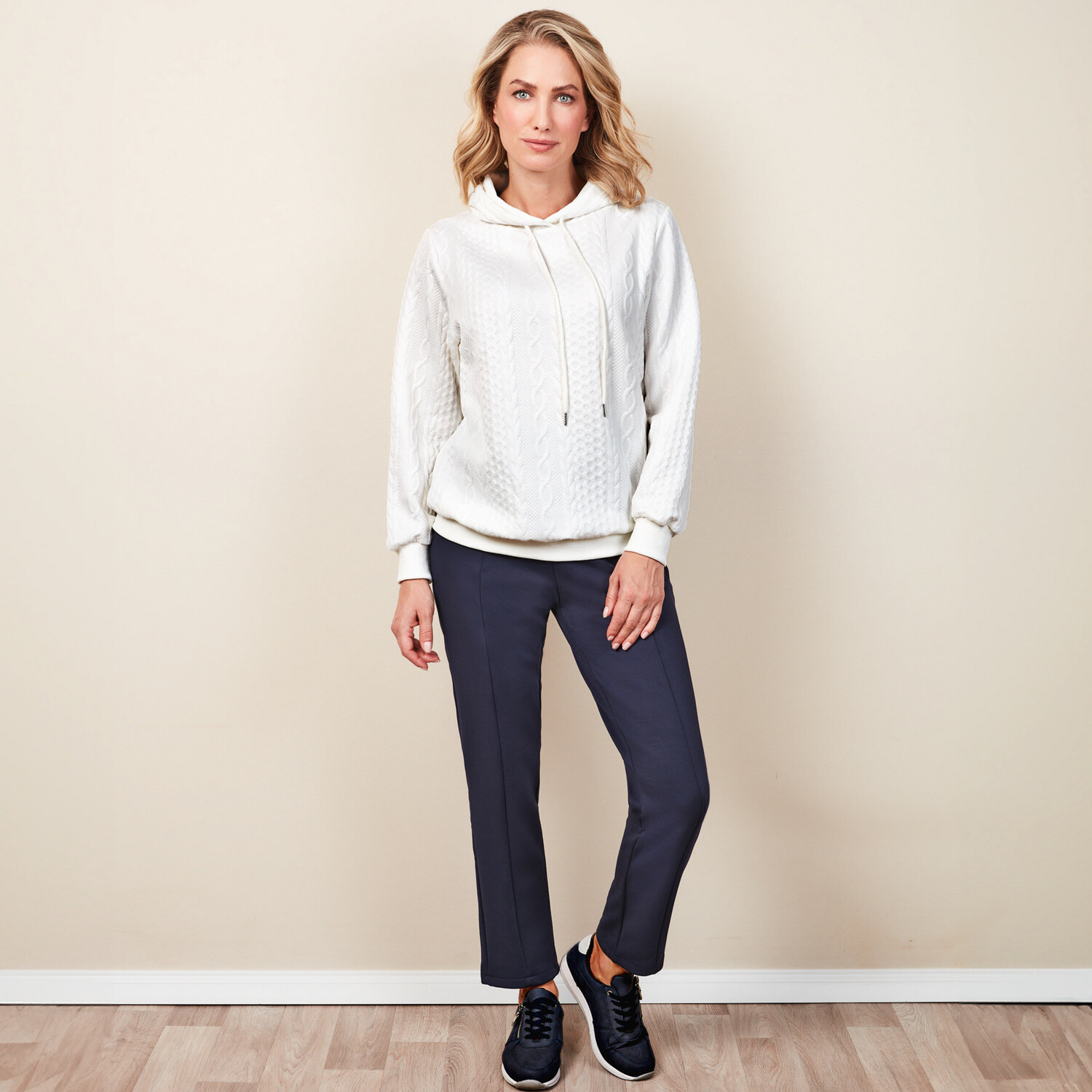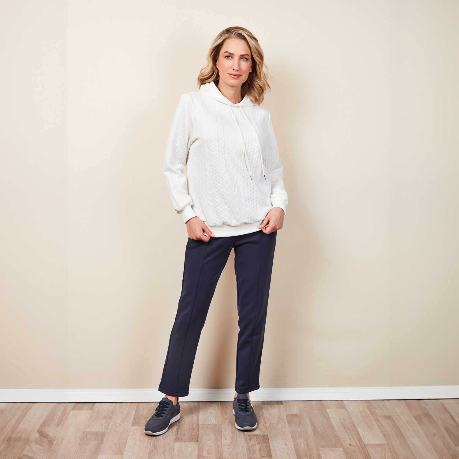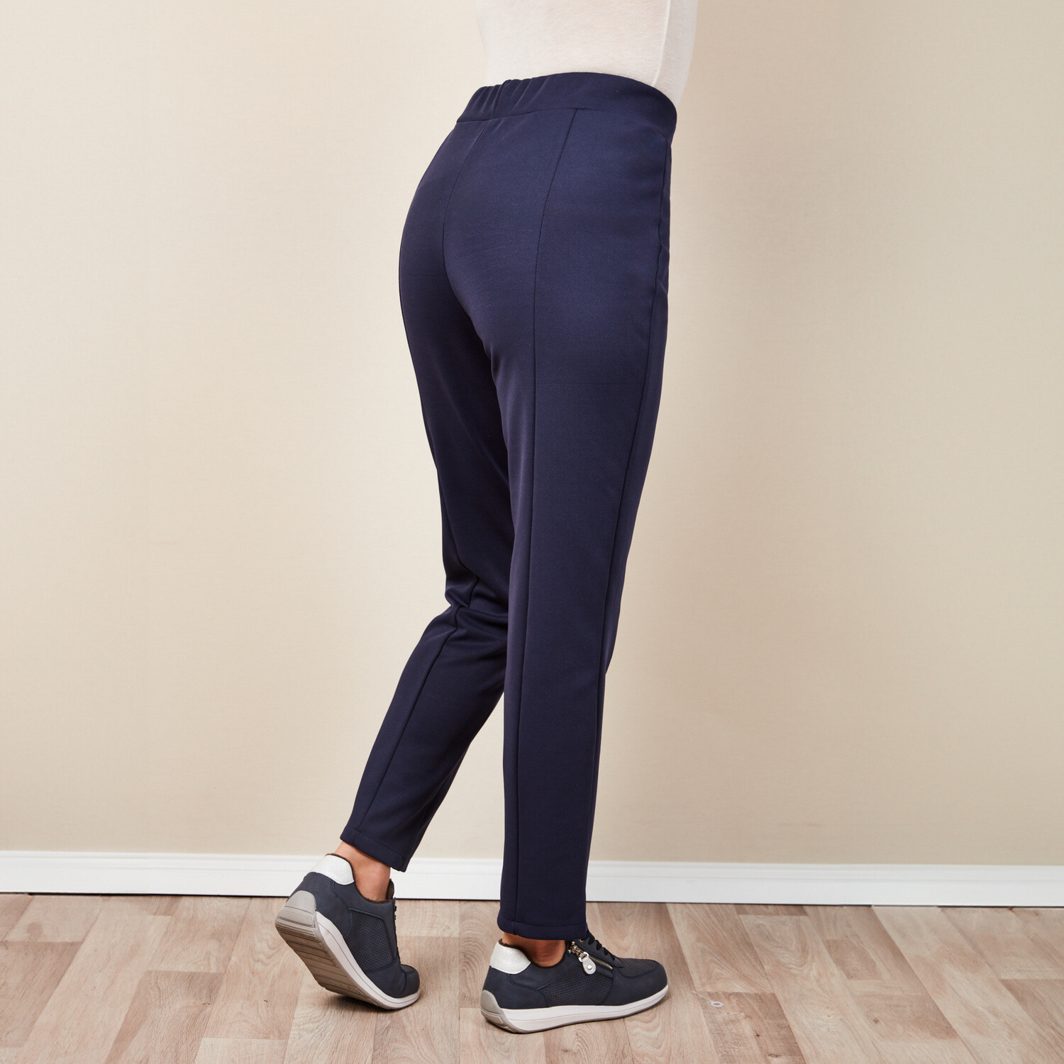 Idealne spodnie zimowe z elastycznego, wygodnego materiału Bengalin z szerokim elastycznym paskiem w talii: aksamitnie miękkie i miłe w dotyku od wewnątrz, ze szwami, które kształtują smukłą nogawkę. Szerokość nogawki ok. 32 cm.