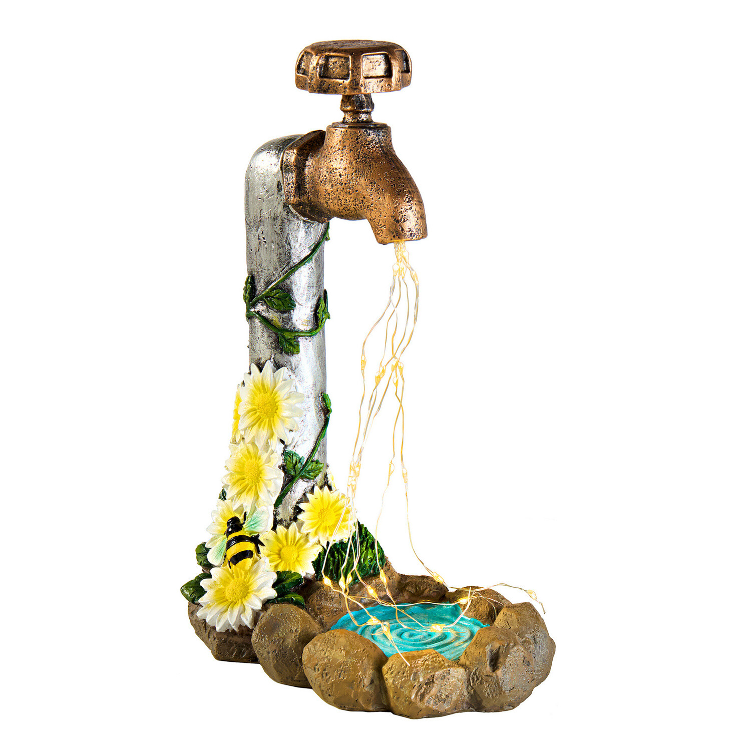 Spektakularna dekoracja w stylu retro: kran ze stokrotkami i pszczołą. Strumień światła jak krople wody. Fantastycznie piękna dekoracja bez kosztów energii elektrycznej. Dekoracja solarna. Łańcuch świetlny LED. Przyjazny dla środowiska. Odporny na warunki atmosferyczne.