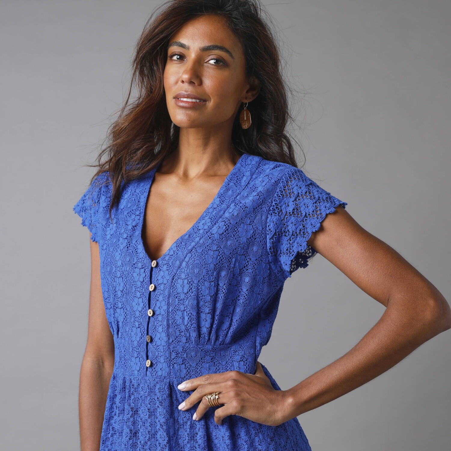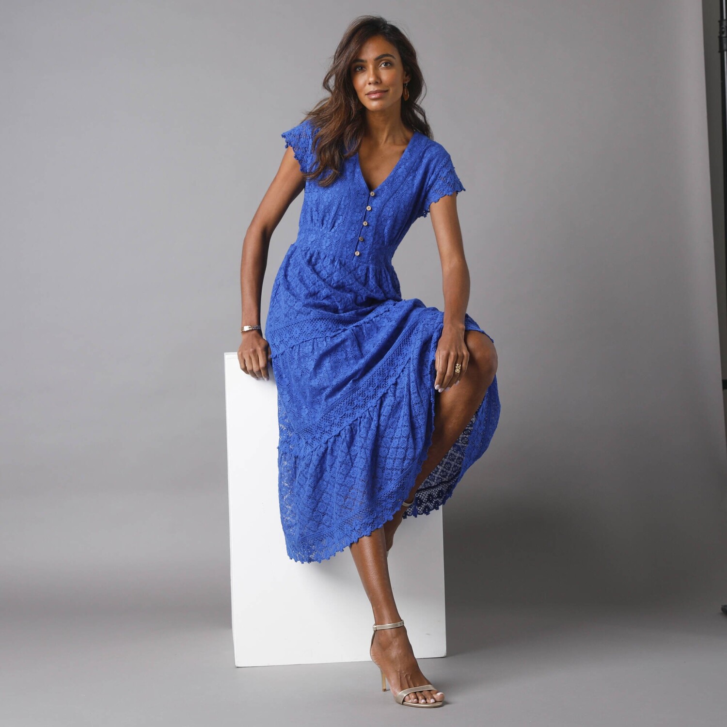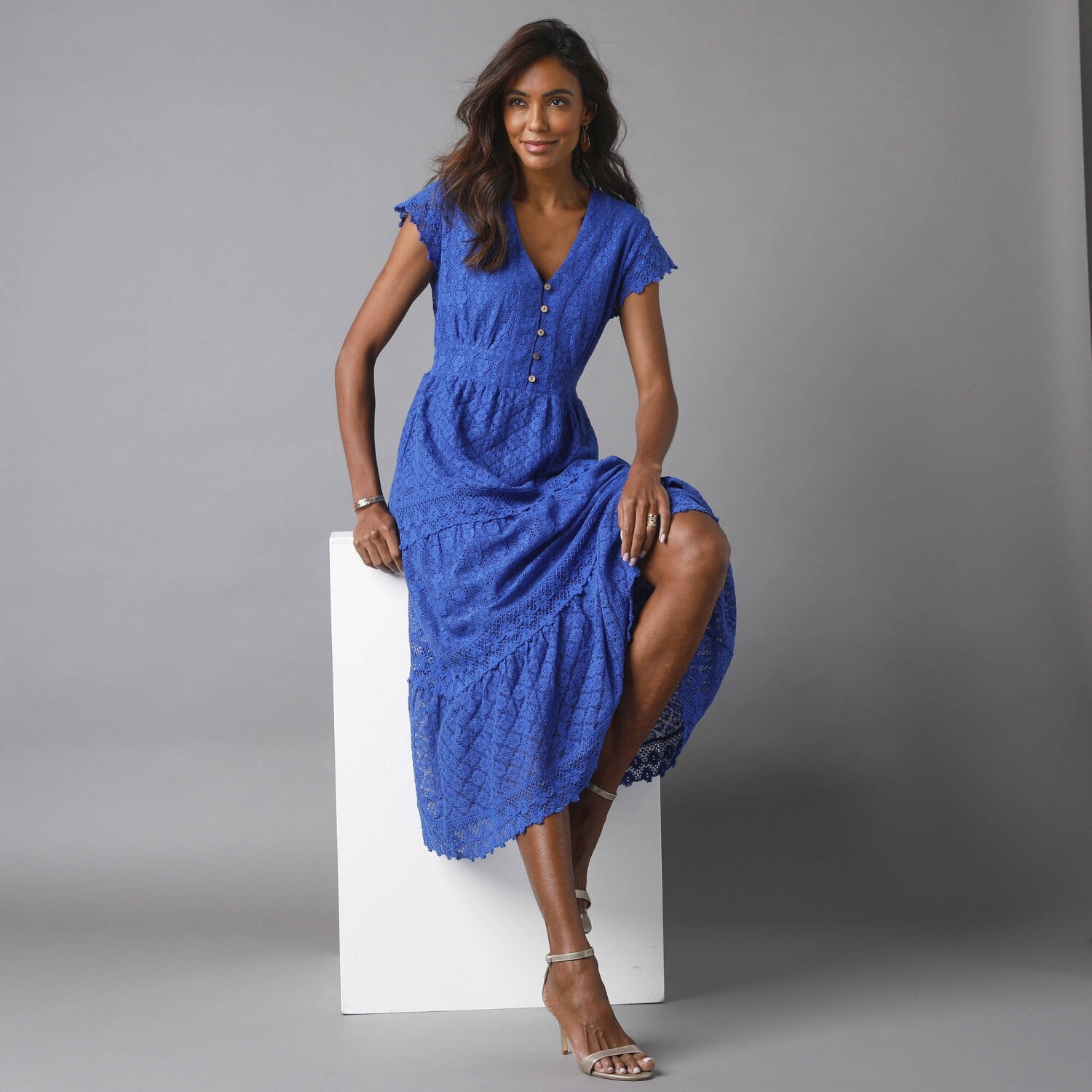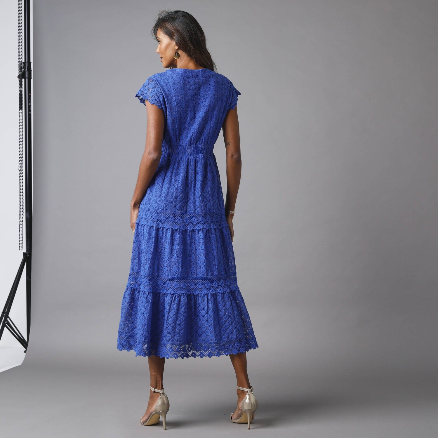 Długa sukienka z nadrukiem sięgającym kostek. Głęboki, krzyżowy dekolt. Marszczenie w talii z przodu. Niewielkie marszczenia powyżej talii. Elastyczna talia z tyłu dla lepszego dopasowania i ładnej sylwetki. Długie rękawy z elastycznymi mankietami i falbaną. Marszczenie na ramionach. Szeroka falbana u dołu. Poszerzony dół. Produkt wykonany z wiskozy Lenzing™ EcoVero™. Ekologiczna wiskoza to materiał wytwarzany z pulpy pochodzącej z lasów zarządzanych w sposób zrównoważony. Proces produkcji zużywa mniej wody i energii. Można prać w pralce.