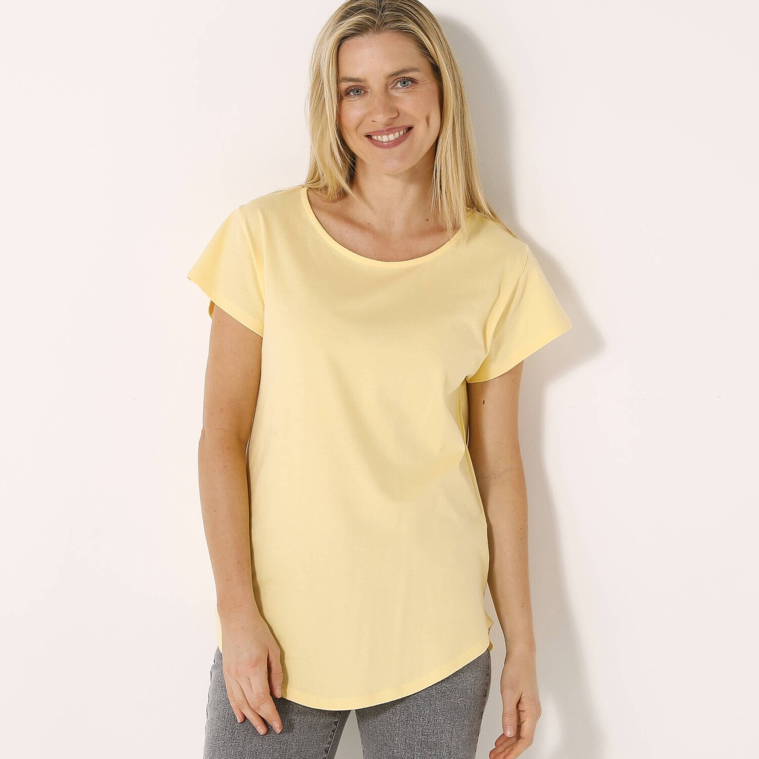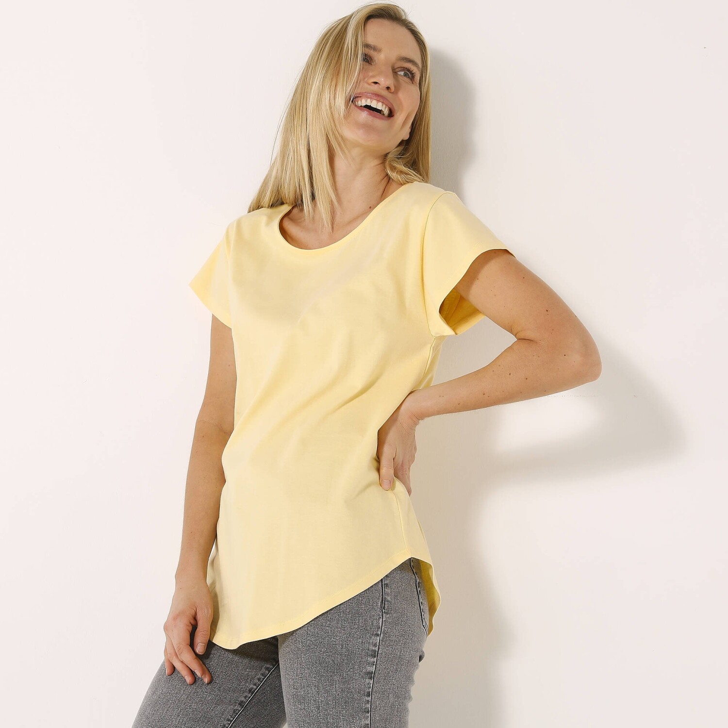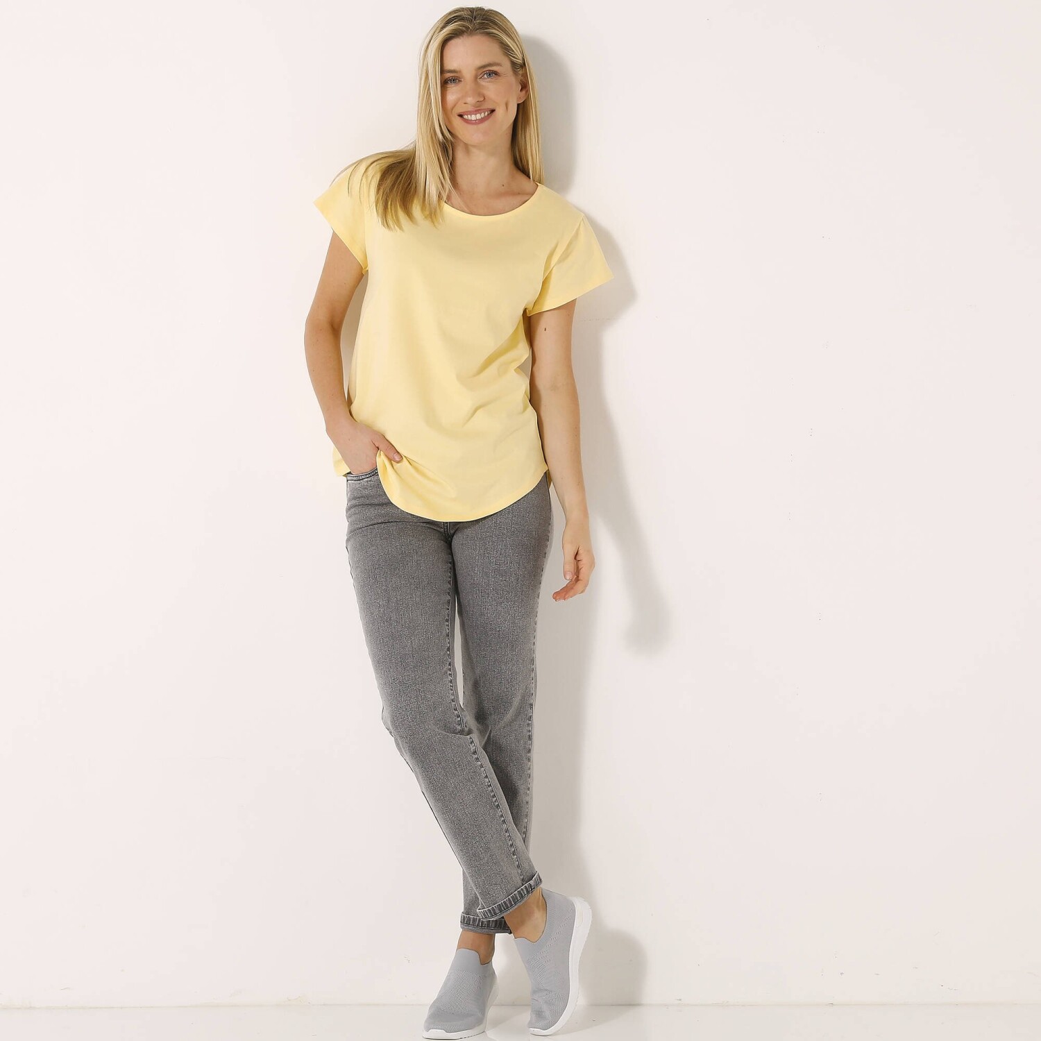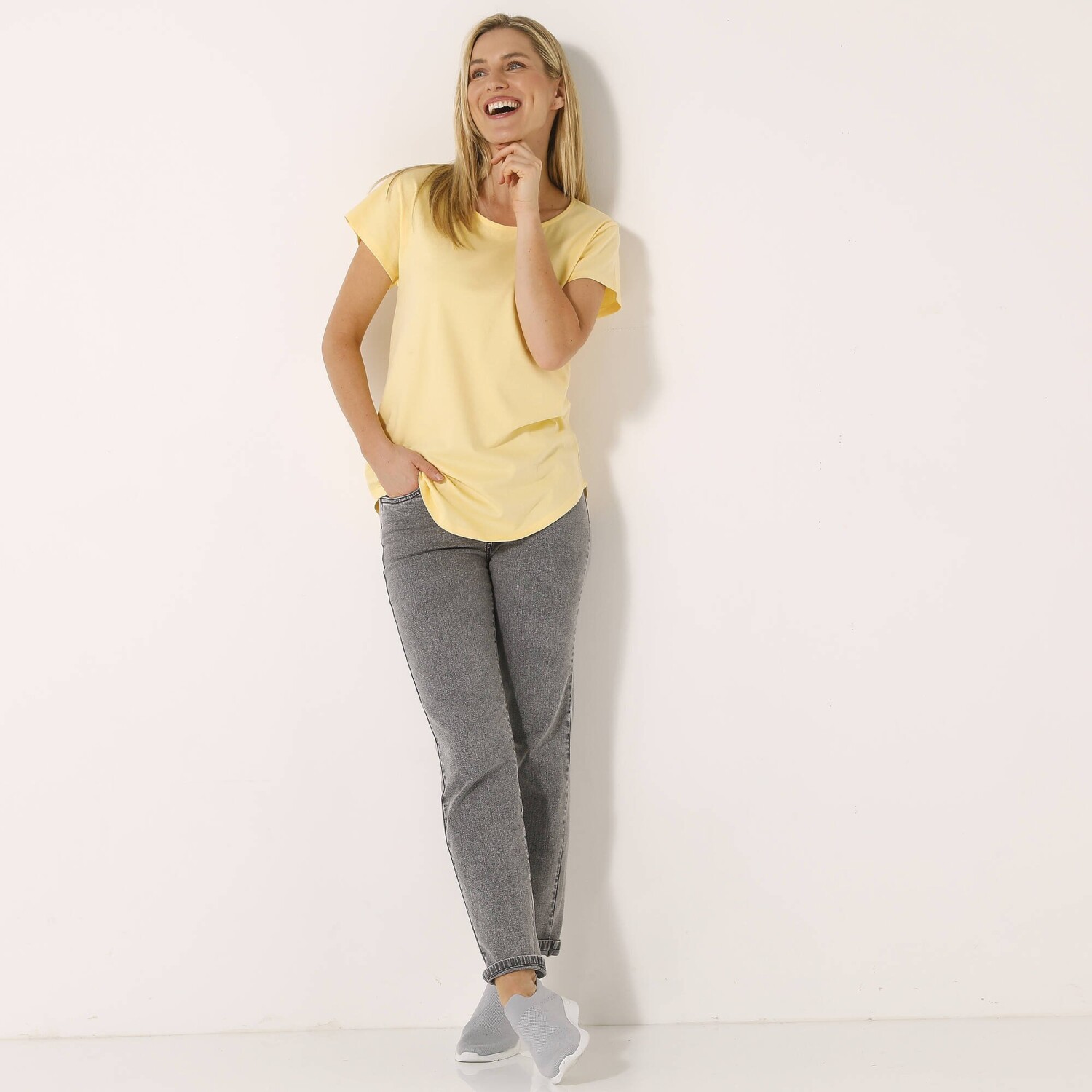Koszulka z krótkim rękawem, dzianinowa, z graficznym wzorem żakardowym. Okrągły dekolt. Krótkie rękawy. Ściągacz w jednolitym kolorze. Prosty dół. Można prać w pralce.