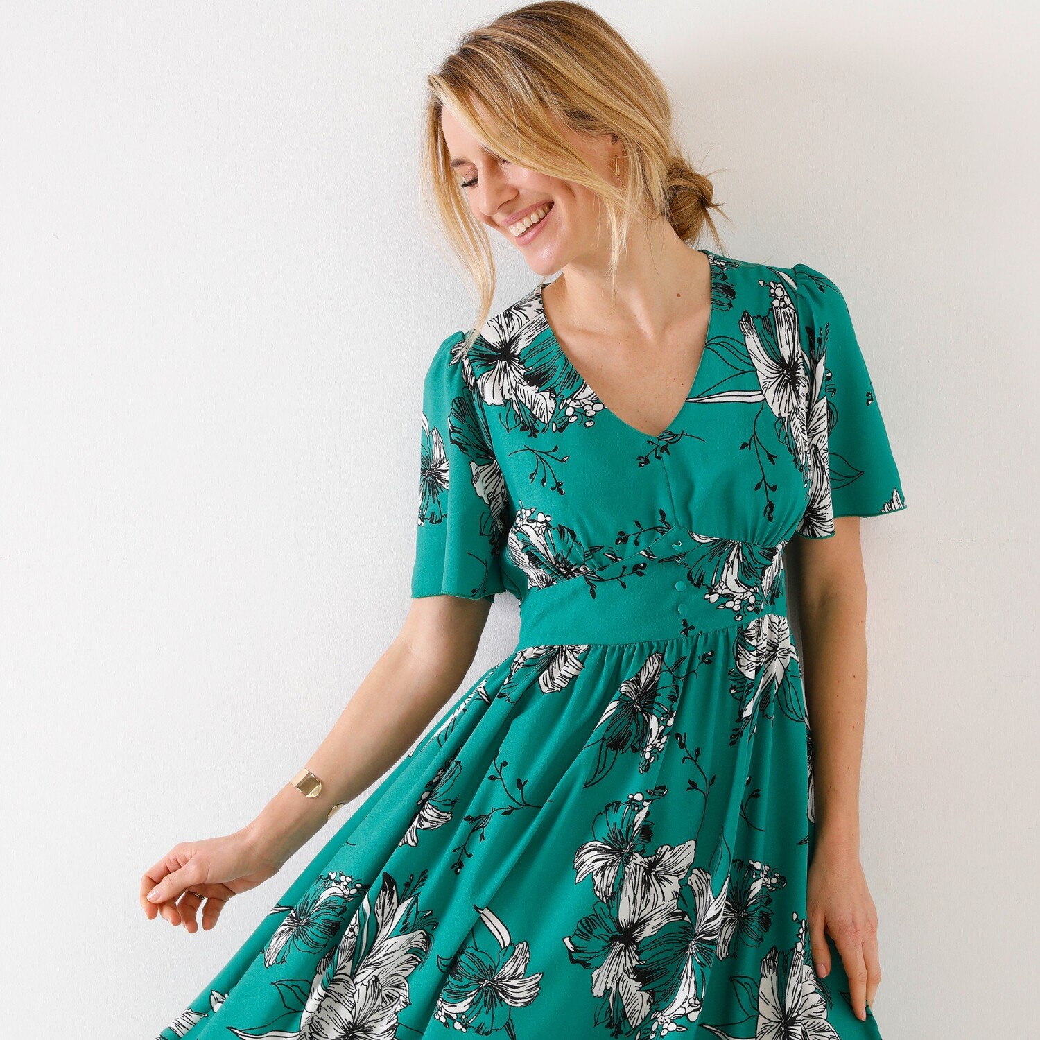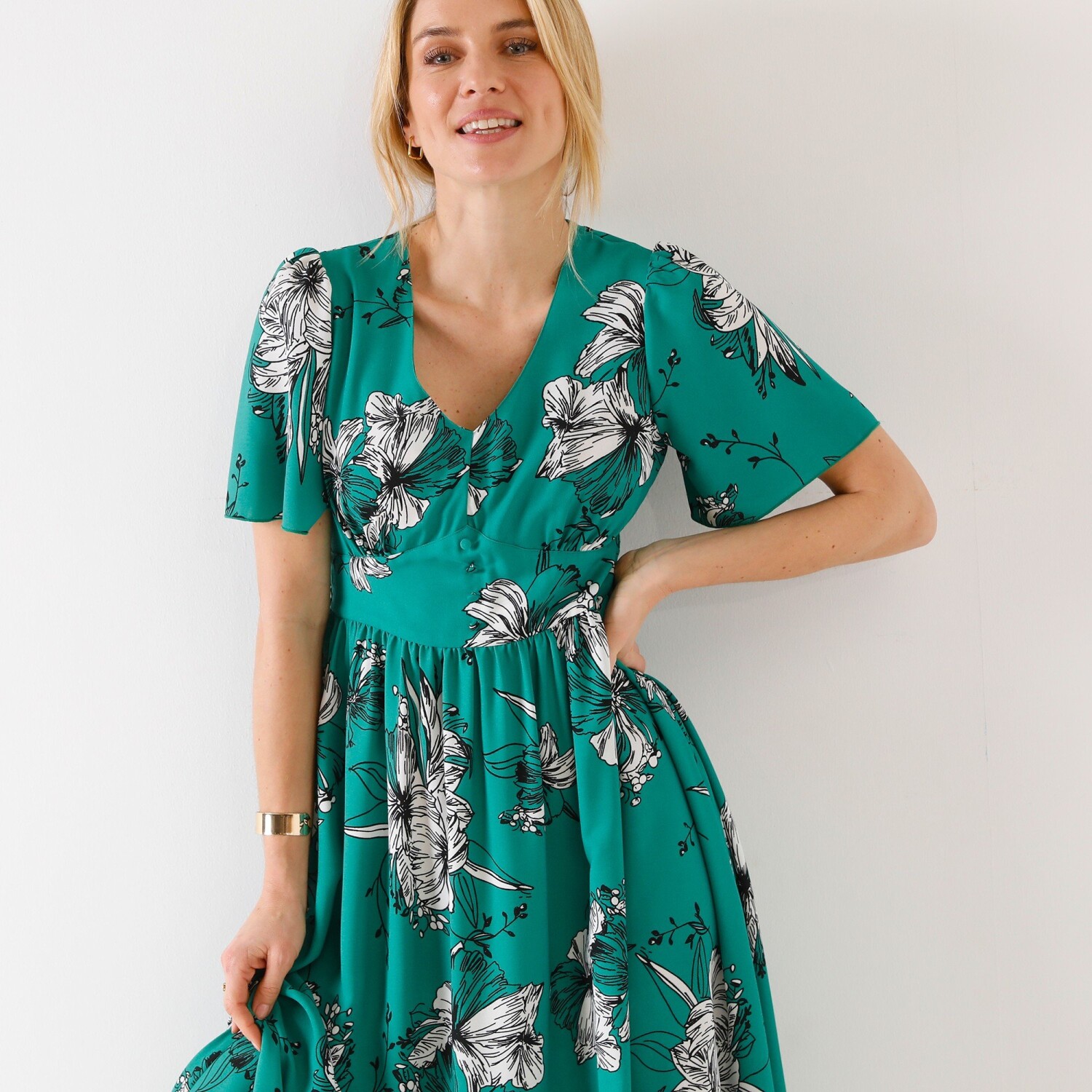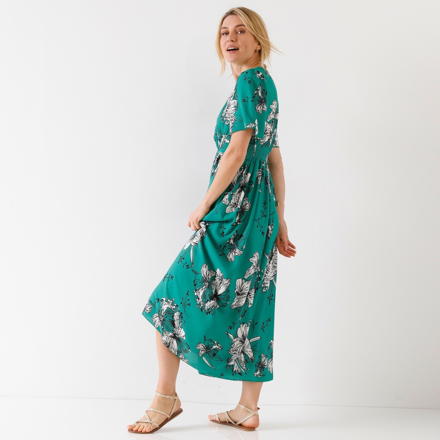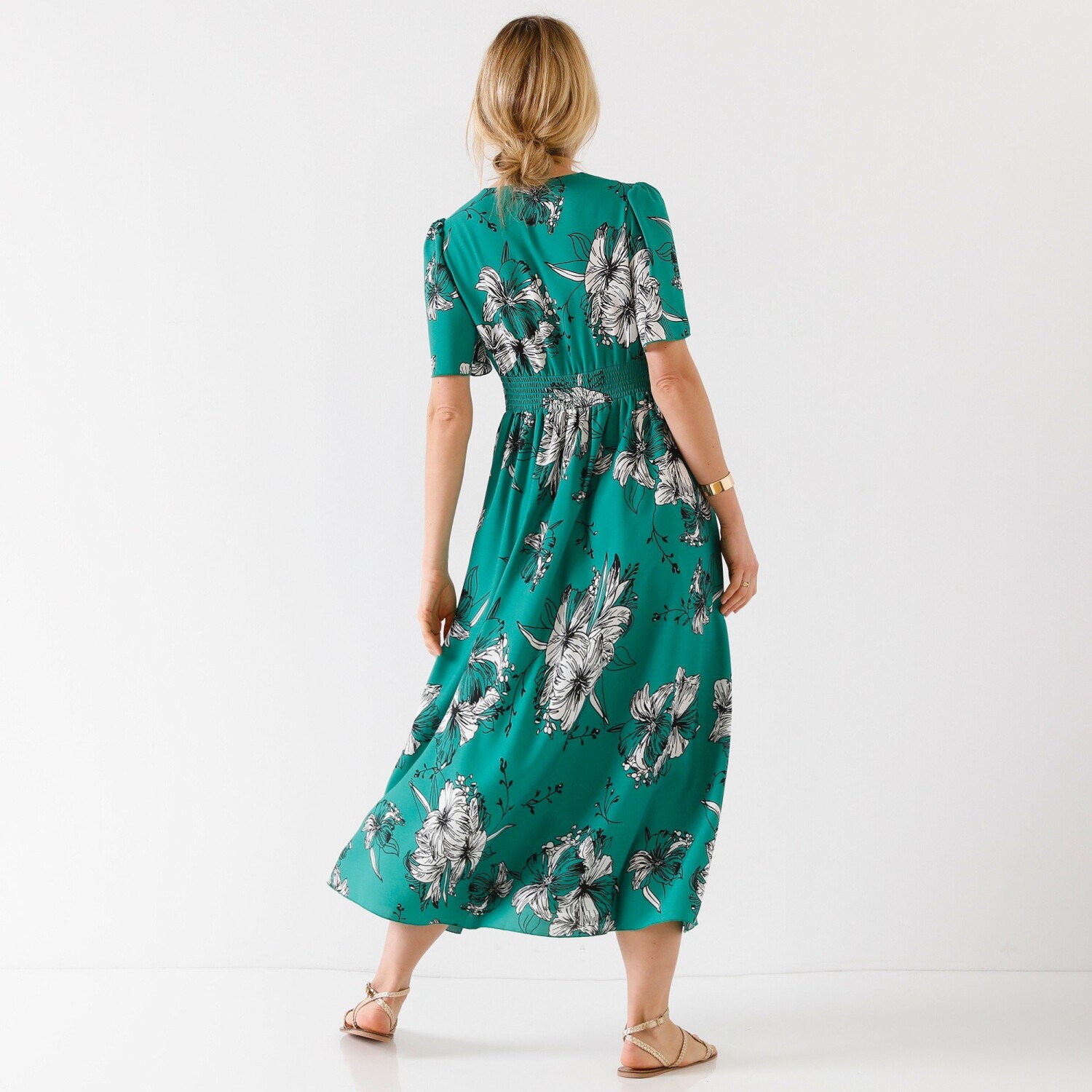 Elegancka długa sukienka z oryginalnym nadrukiem podkreśla kobiecą sylwetkę. Dekolt w kształcie litery V tworzący skrzyżowanie. Długie rękawy z mankietem zapinanym na guzik. Marszczenia na ramionach. Elastyczna talia z wiązanym paskiem. Szeroka rozkloszowana spódnica z marszczeniami. Można prać w pralce.