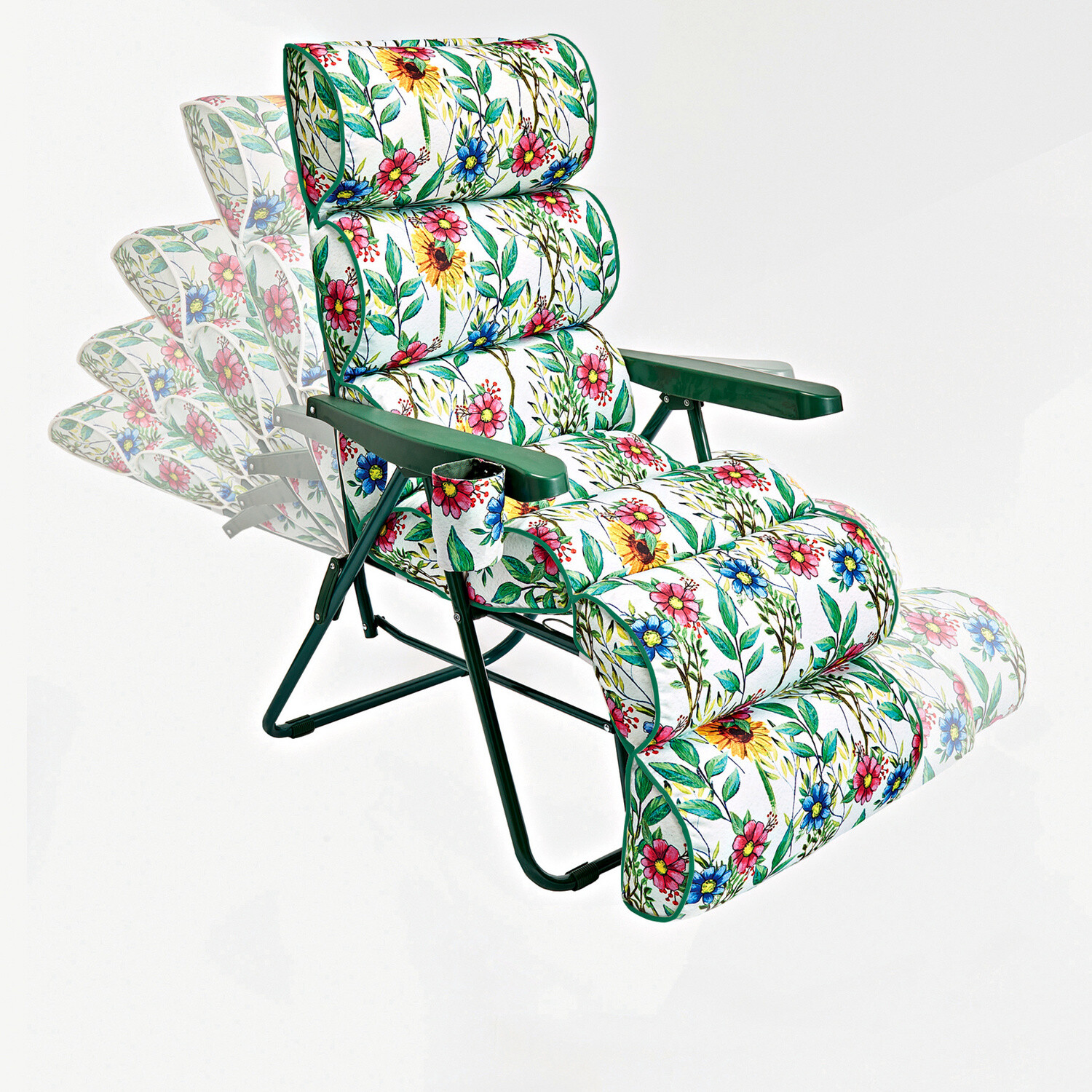 Oprzyj się wygodnie i poczuj się jak na wakacjach! Nasz wygodny leżak z miękko wyściełaną poduszka z pianki memory z podparciem głowy i lędźwi o grubości 15 cm zapewnia maksymalny komfort. Wytrzymała stalowa rama może być regulowana w 5 pozycjach: od pionowej do poziomej do opalania lub drzemki. Leżak można złożyć i schować, aby zaoszczędzić miejsce.