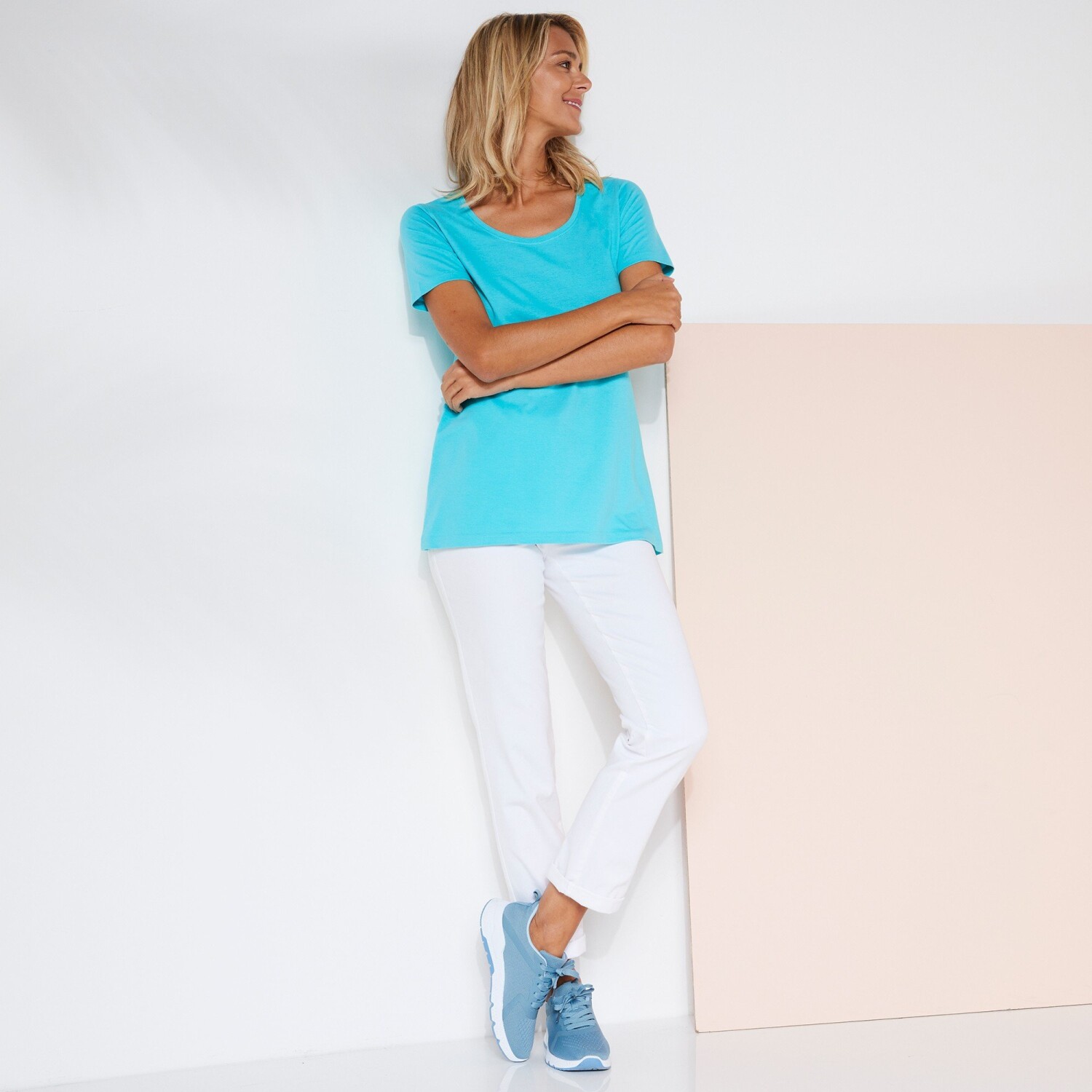 Wygodna koszulka z krótkim rękawem wykonana z bawełnianego dżerseju z certyfikatem Oeko-Tex. Okrągły, luźny dekolt. Krótkie rękawy. Lekko opadające ramiona. Zaokrąglony dół. Oddychająca koszulka, która jest wygodna w noszeniu. Standard 100 według Oeko-Tex (nr CQ 1216 / 3-IFTH). Ten znak identyfikuje produkty tekstylne, które zostały poddane testom laboratoryjnym pod kątem szerokiej gamy szkodliwych substancji, a produkt jest bezpieczny poza obowiązującymi normami. Można prać w pralce.