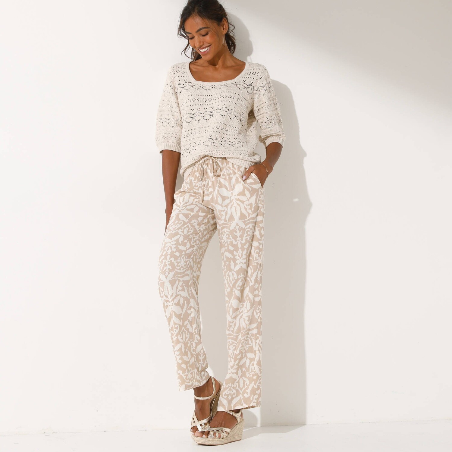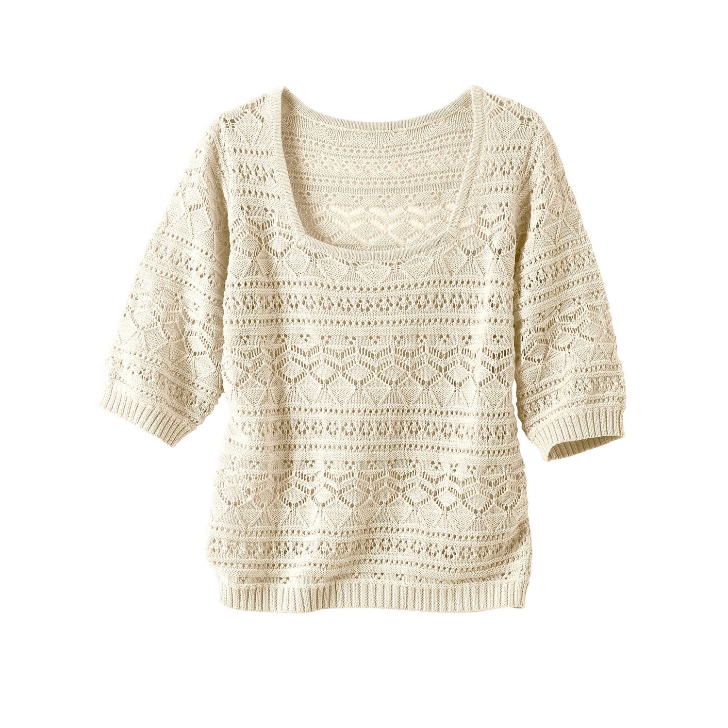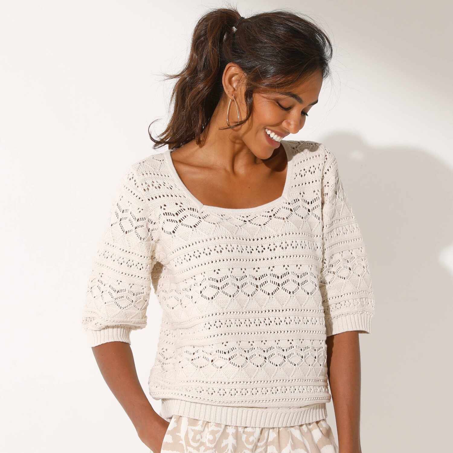 Kwadratowy dekolt, wygodny materiał i uroczy styl: koronkowy sweter to zawsze dobry wybór. Kwadratowy dekolt. Krótkie rękawy z prążkowanym wykończeniem. Prosty, prążkowany dół. Centralny wzór z przodu i z tyłu. Można prać w pralce.