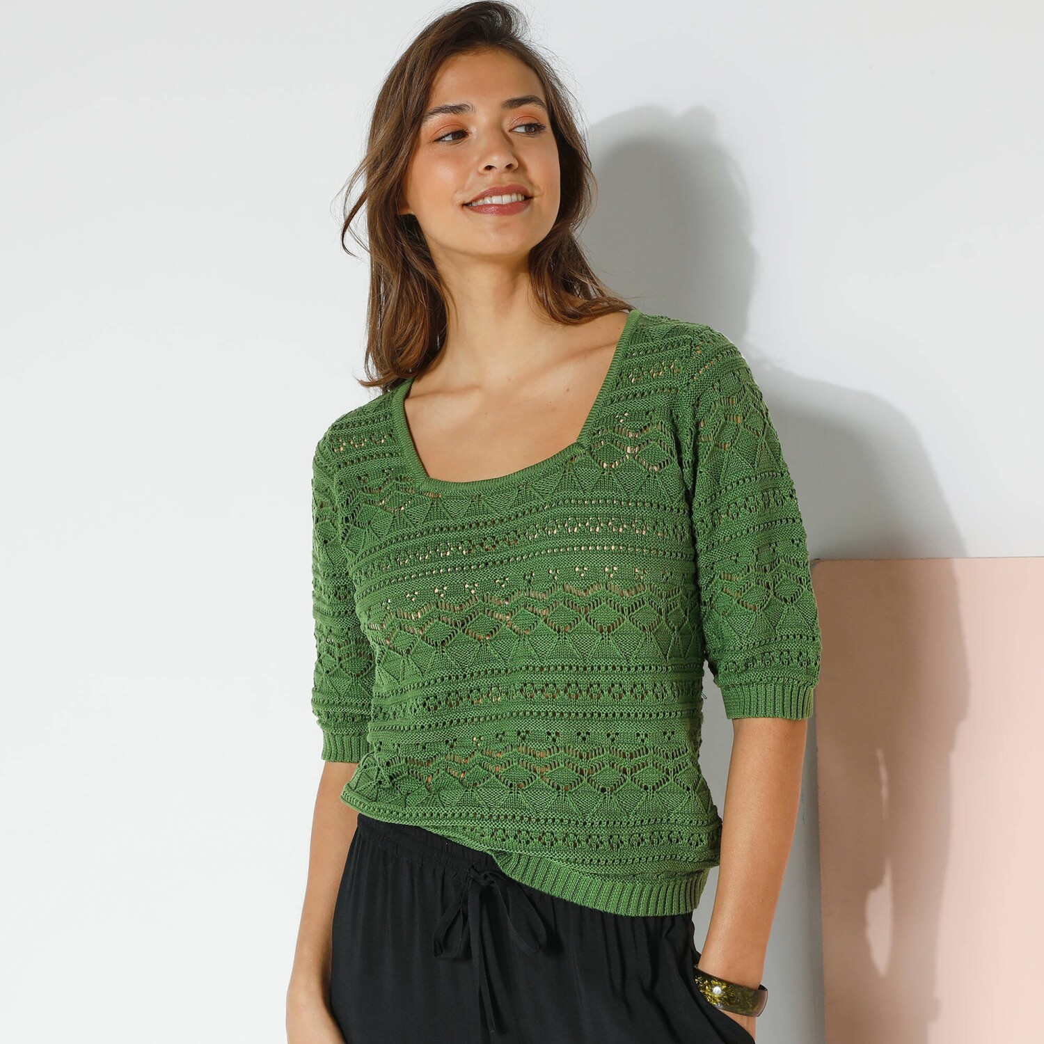 Jednokolorowy sweter z kwadratowym dekoltem i ażurowym wzorem