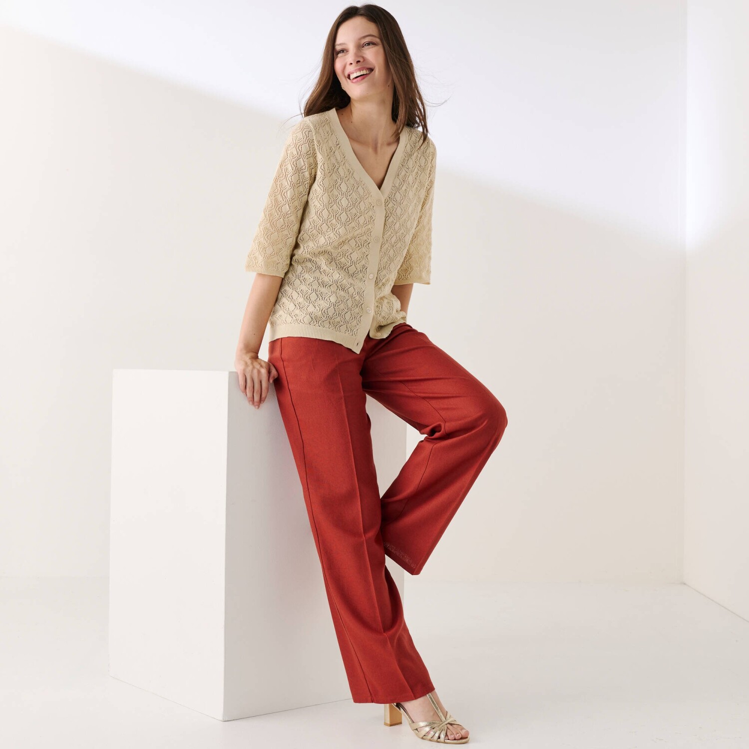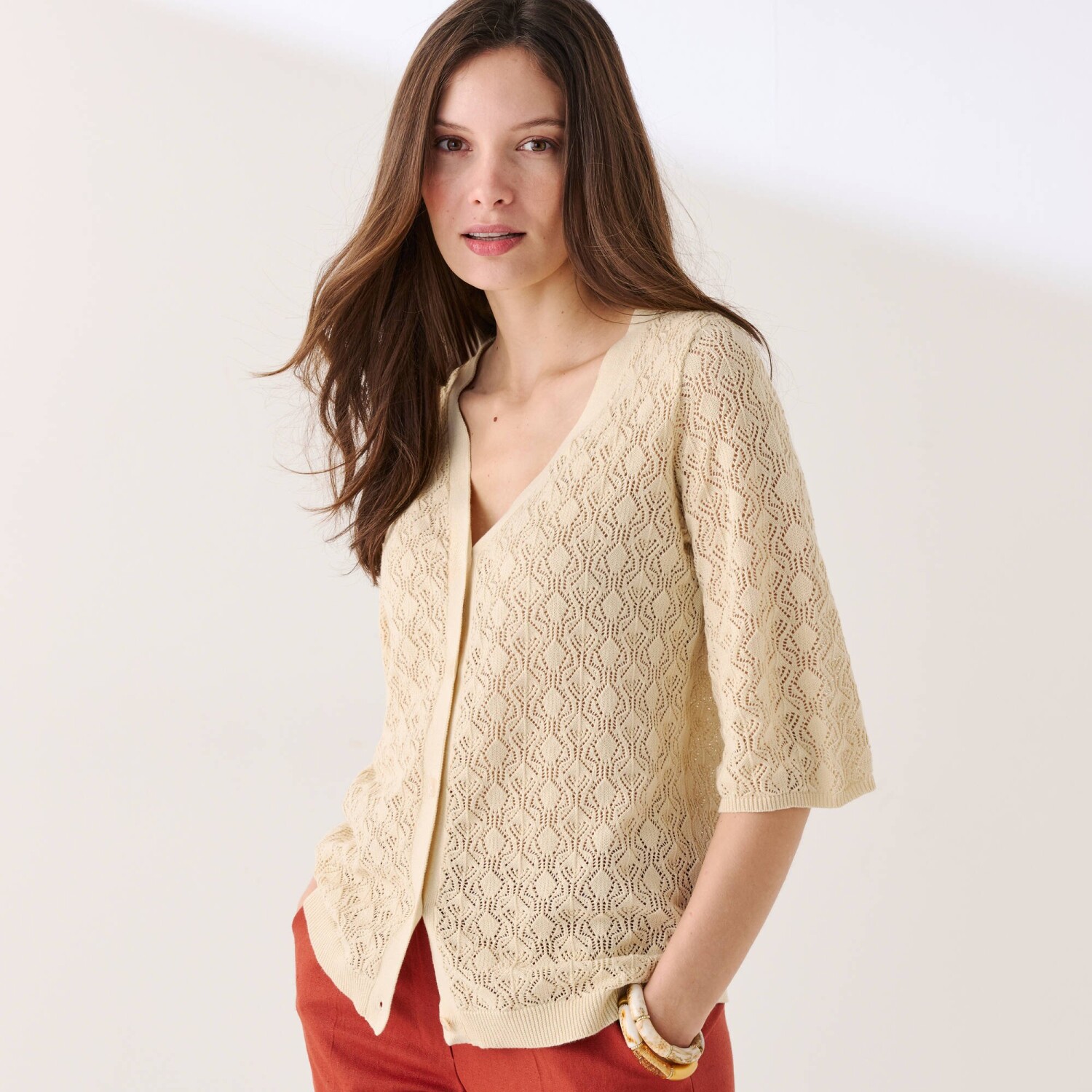 Świetnie sprawdzi się w połączeniu z białym T-shirtem lub koszulą-bluzką, a sweter typu pullover to zawsze dobry wybór. Gładki wzór, miękki w dotyku. Modny krój, obniżone ramiona. Okrągły dekolt. Długie rękawy. Bluza rozpinana z przodu. Prosty dół. Wykończenie ściągaczem. Można prać w pralce.