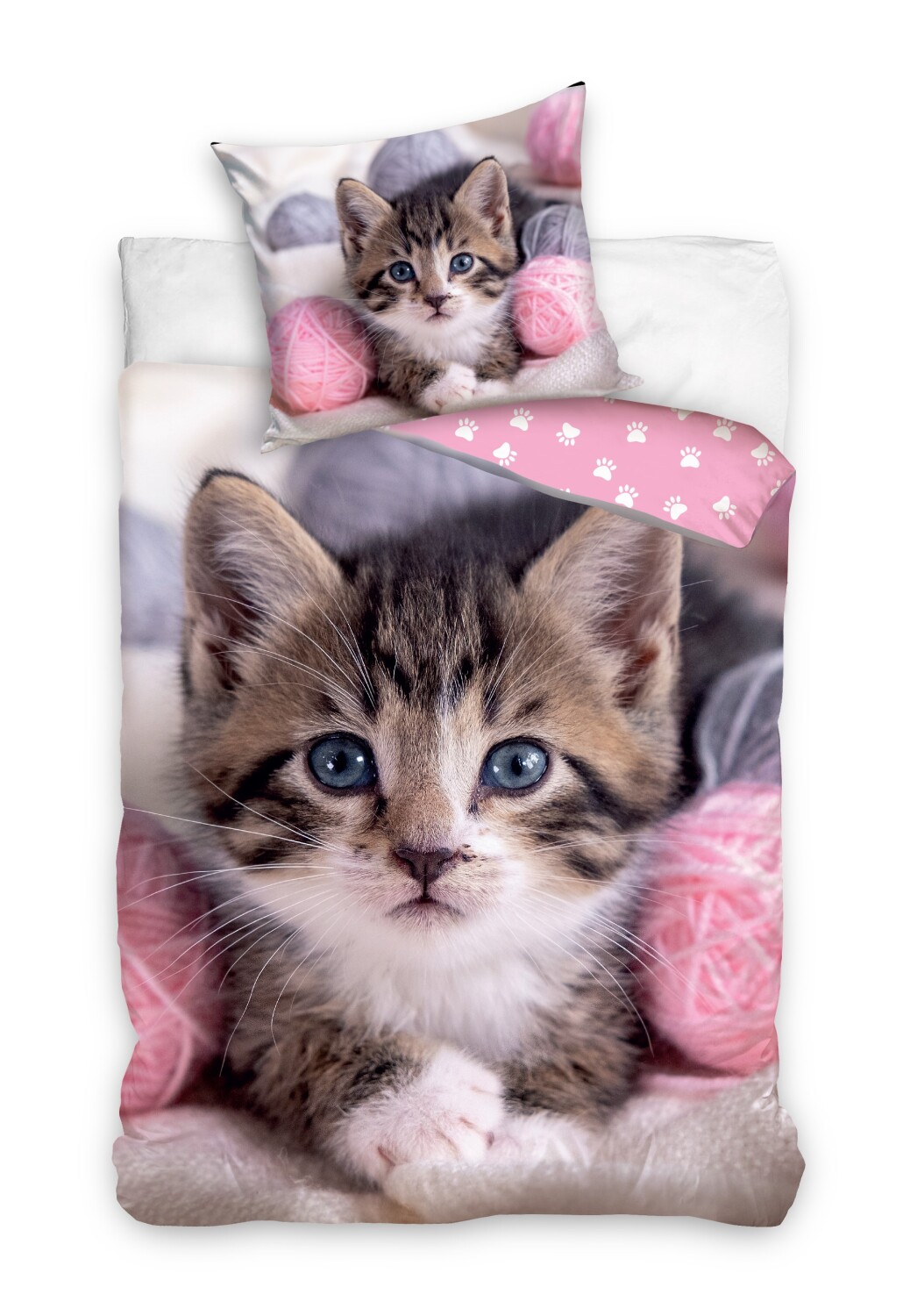 Bawełniana pościel z motywem pręgowanego kotka z kłębkami włóczki jest dwustronna – na odwrocie znajduje się wzór kocich łapek na różowym tle. Wykonana z mocnej i gładkiej tkaniny bawełnianej renforce, znanej ze swojej miękkości, przewiewności i chłonności, co zapewnia wysoki komfort snu. Cechuje się dużą odpornością na zużycie, częste pranie i długotrwałe użytkowanie. Pościel posiada certyfikat jakości Öeko-Tex Standard 100. Zestaw zawiera jedną poszwę na kołdrę o wymiarach 140 x 200 cm i jedną poszewkę na poduszkę 70 x 90 cm. Zapinanie na zamek błyskawiczny. Materiał: 100% bawełna.
