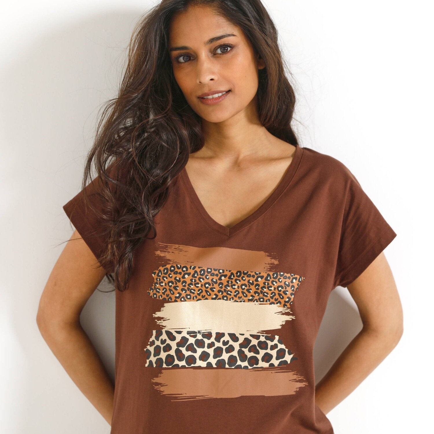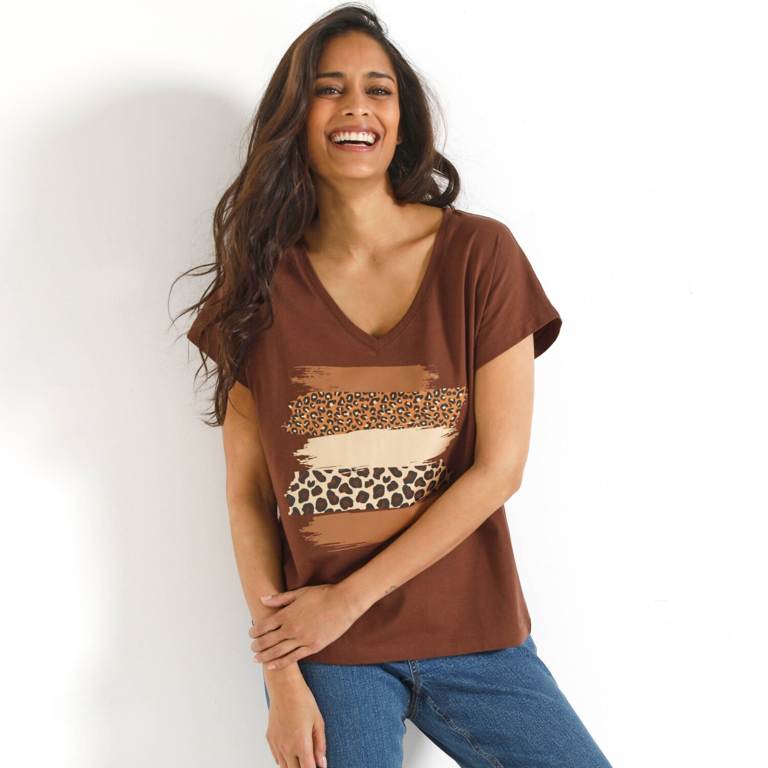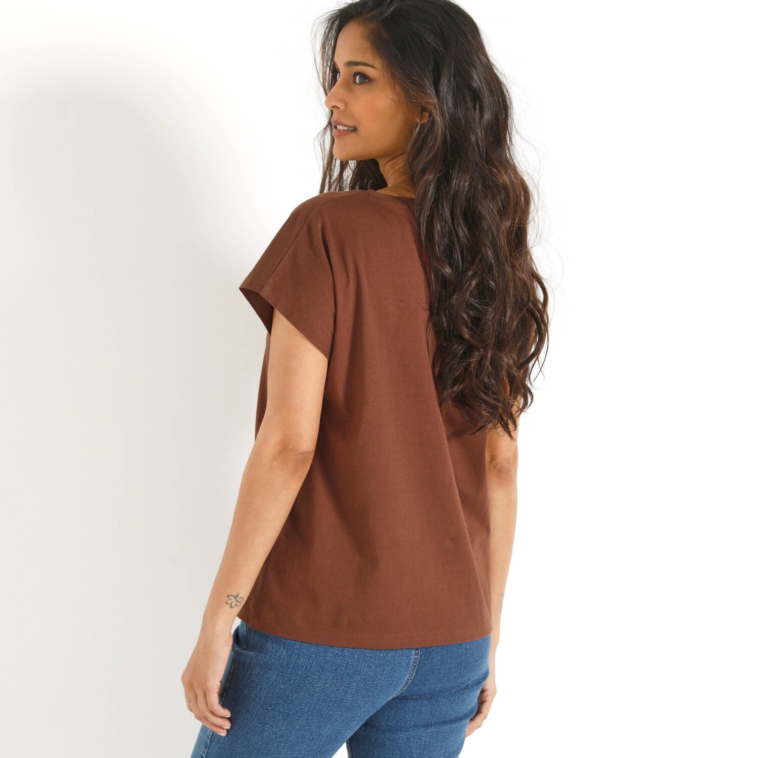 Ten letni T-shirt z oryginalnymi wiązaniami można łatwo połączyć z ulubioną bielizną. Luźny krój. Dekolt V. Opuszczone ramiona. Wiązanie z przodu. Prosty dół z tyłu. Oeko-Tex standard 100 (nr CQ 1216 / 3 IFTH). Ten znak identyfikuje produkty tekstylne, które zostały poddane testom laboratoryjnym pod kątem szerokiej gamy szkodliwych substancji, a produkt jest bezpieczny poza obowiązującymi normami. Można prać w pralce.