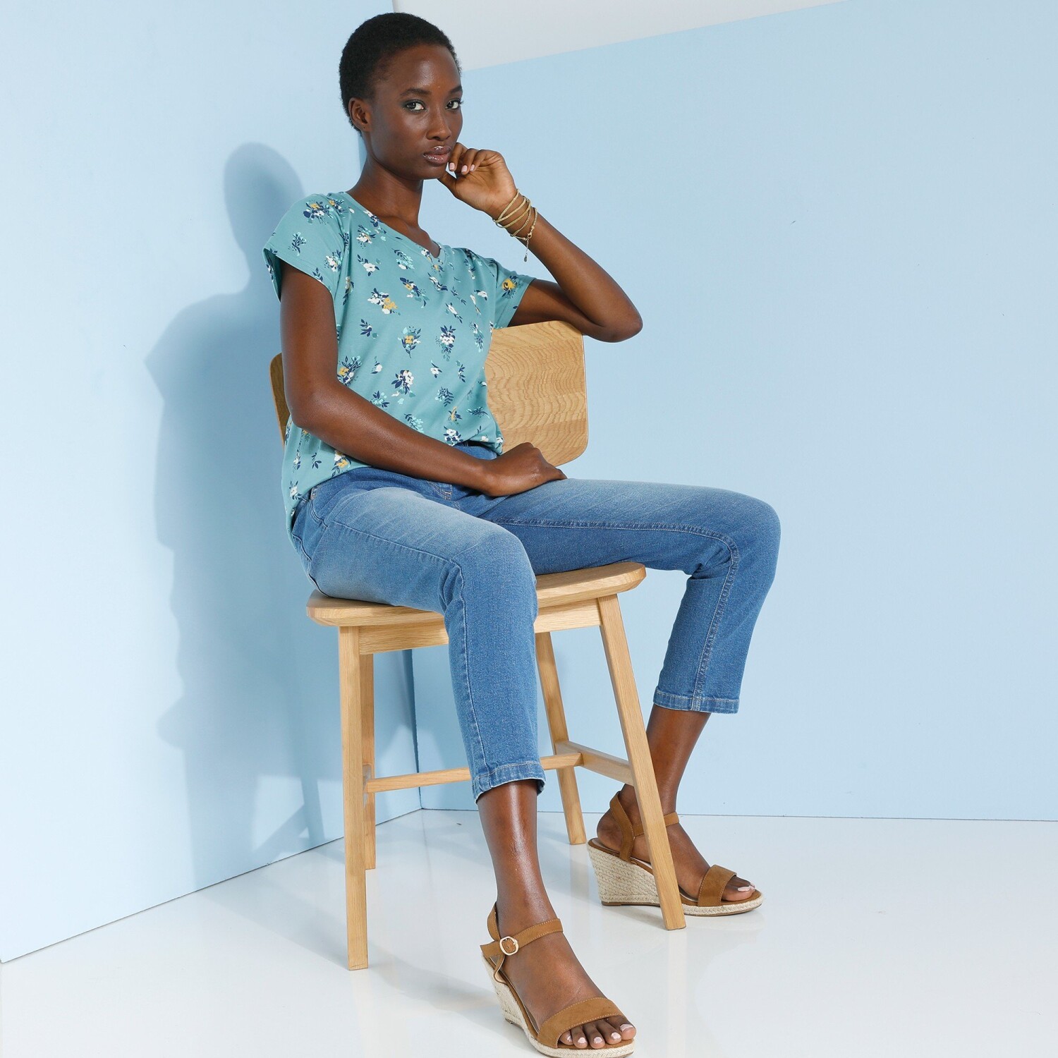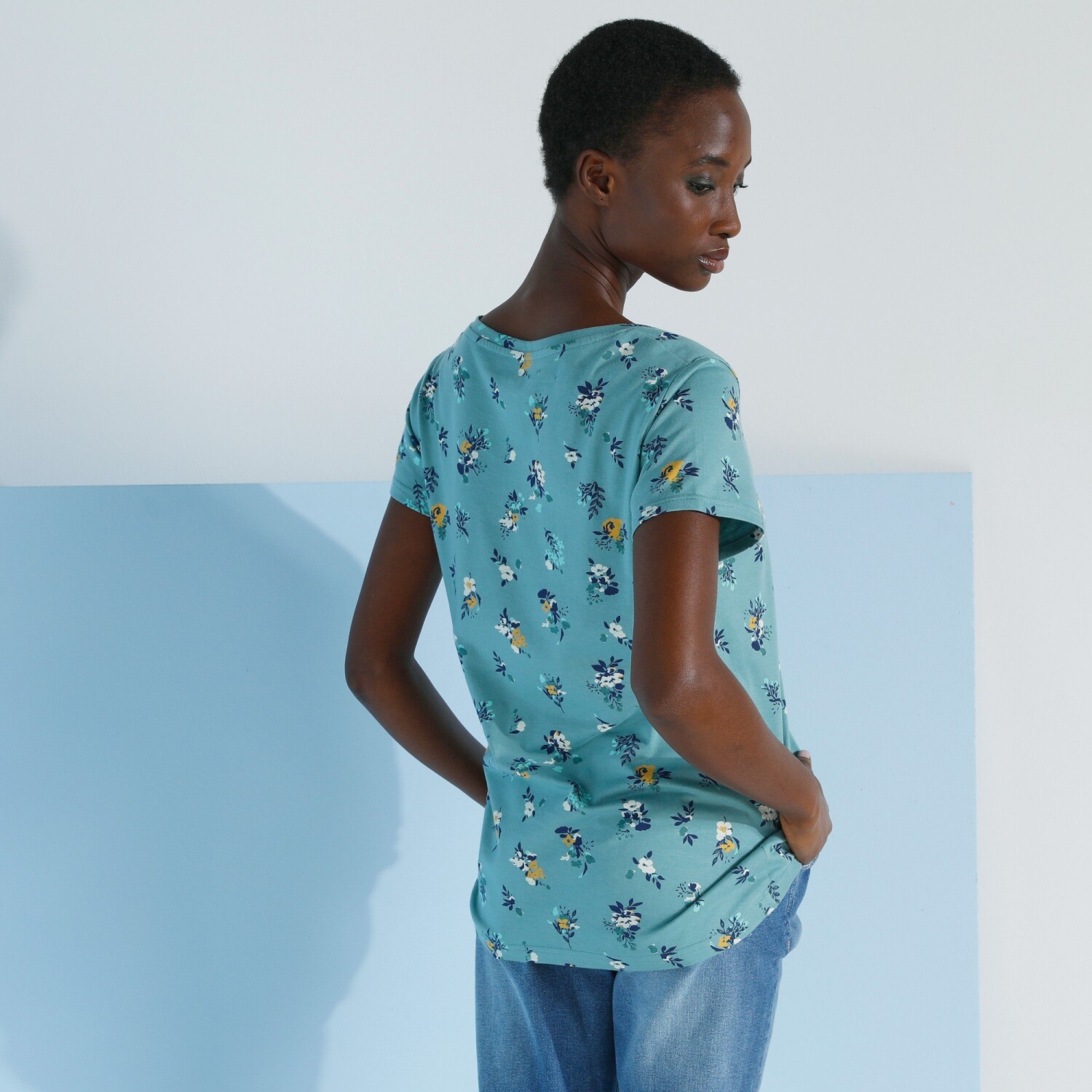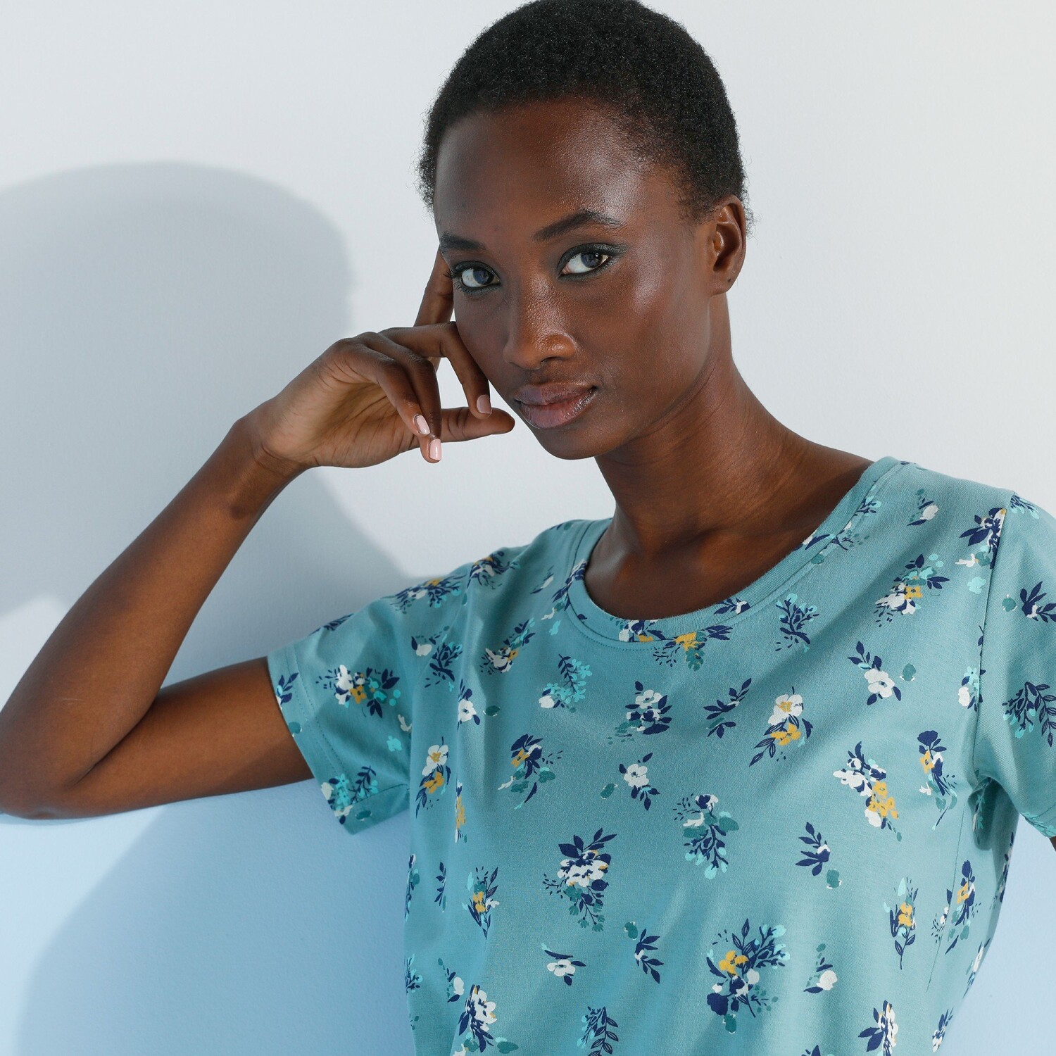 Dzięki koszulce ozdobionej kwiatowym haftem doświadczysz fantastycznego uczucia podczas jej noszenia. Wykonany z delikatnego dżerseju z kobiecym dekoltem - pluszowy i odporny na deformacje. Długość ok. 67 cm.