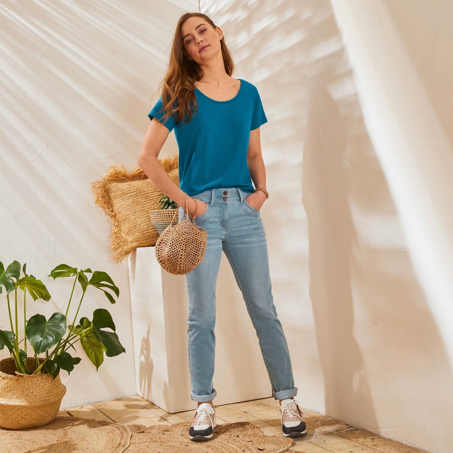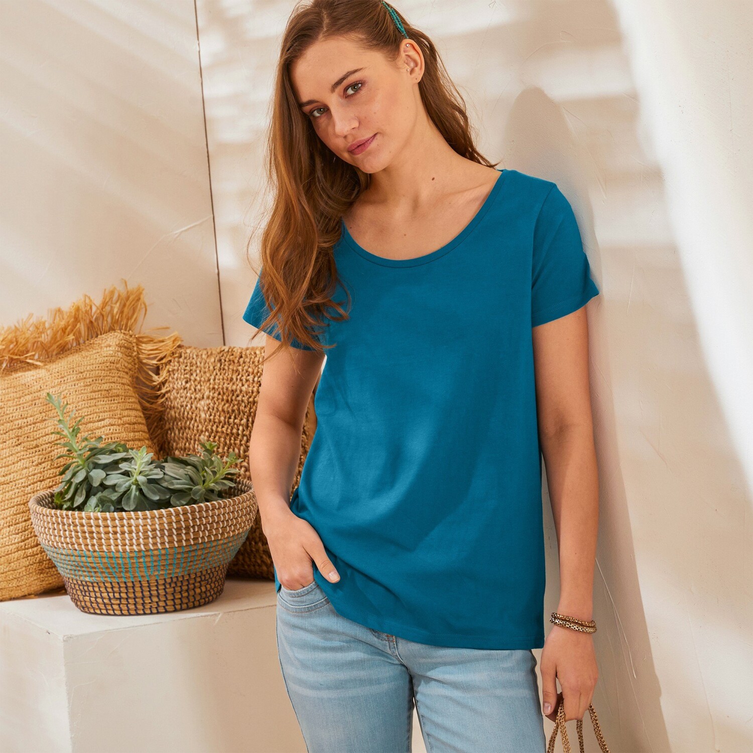 Plisowana koszula o długości tuniki dodaje oryginalnego wyglądu. Krój T. Długość tuniki. Plisowanie. Okrągły dekolt. Opuszczone ramiona. Centralny szew z przodu. 2 wiązania z przodu. 2 boczne rozcięcia. Prosty dół wykończony warkoczem. Można prać w pralce.