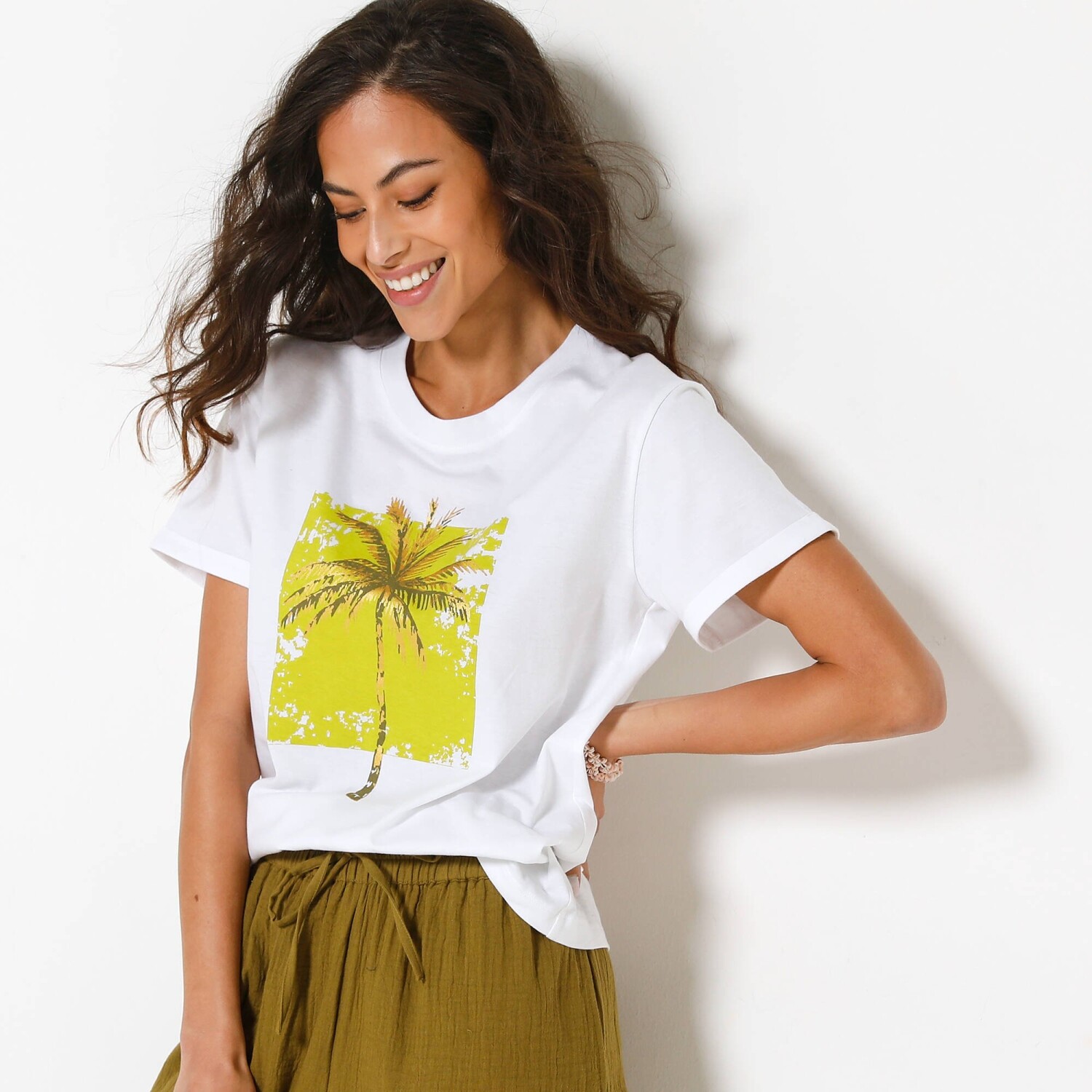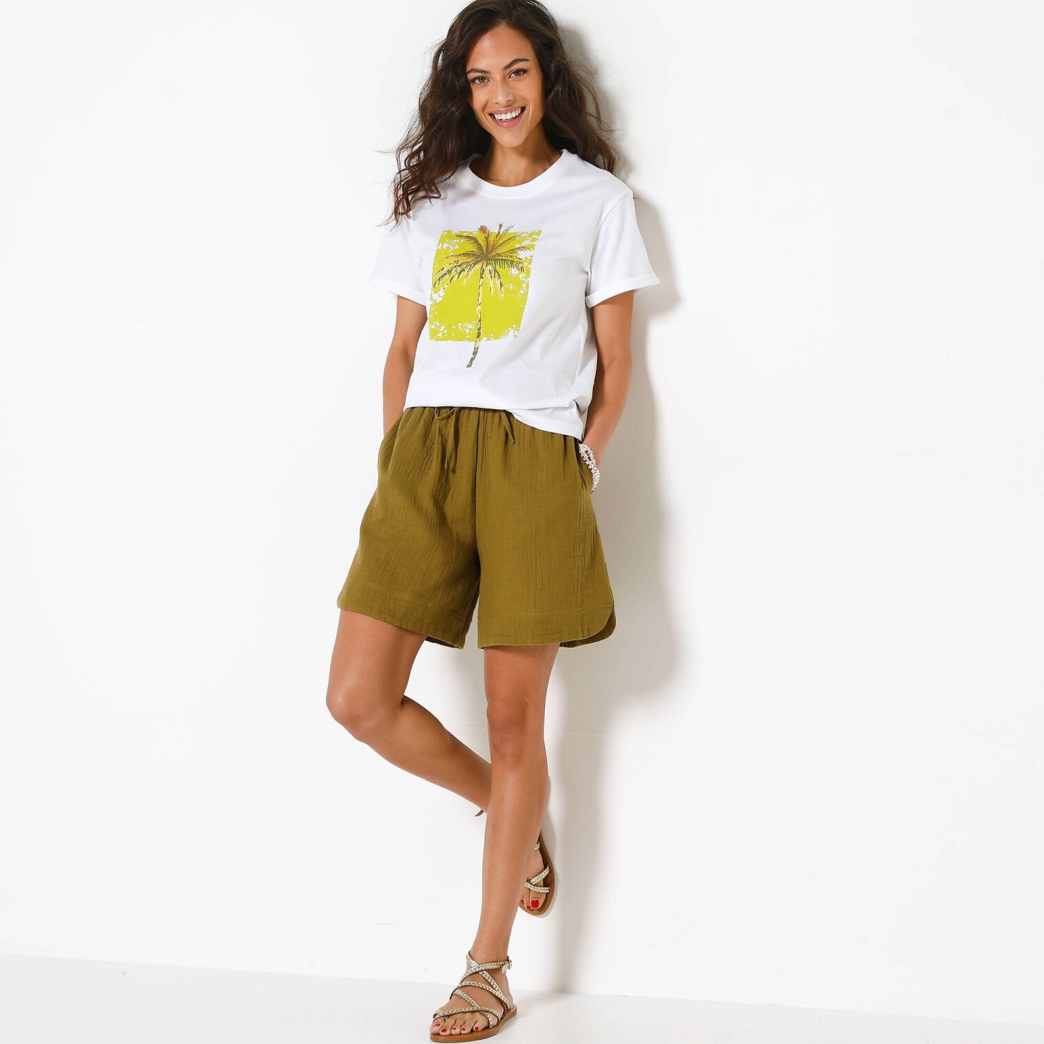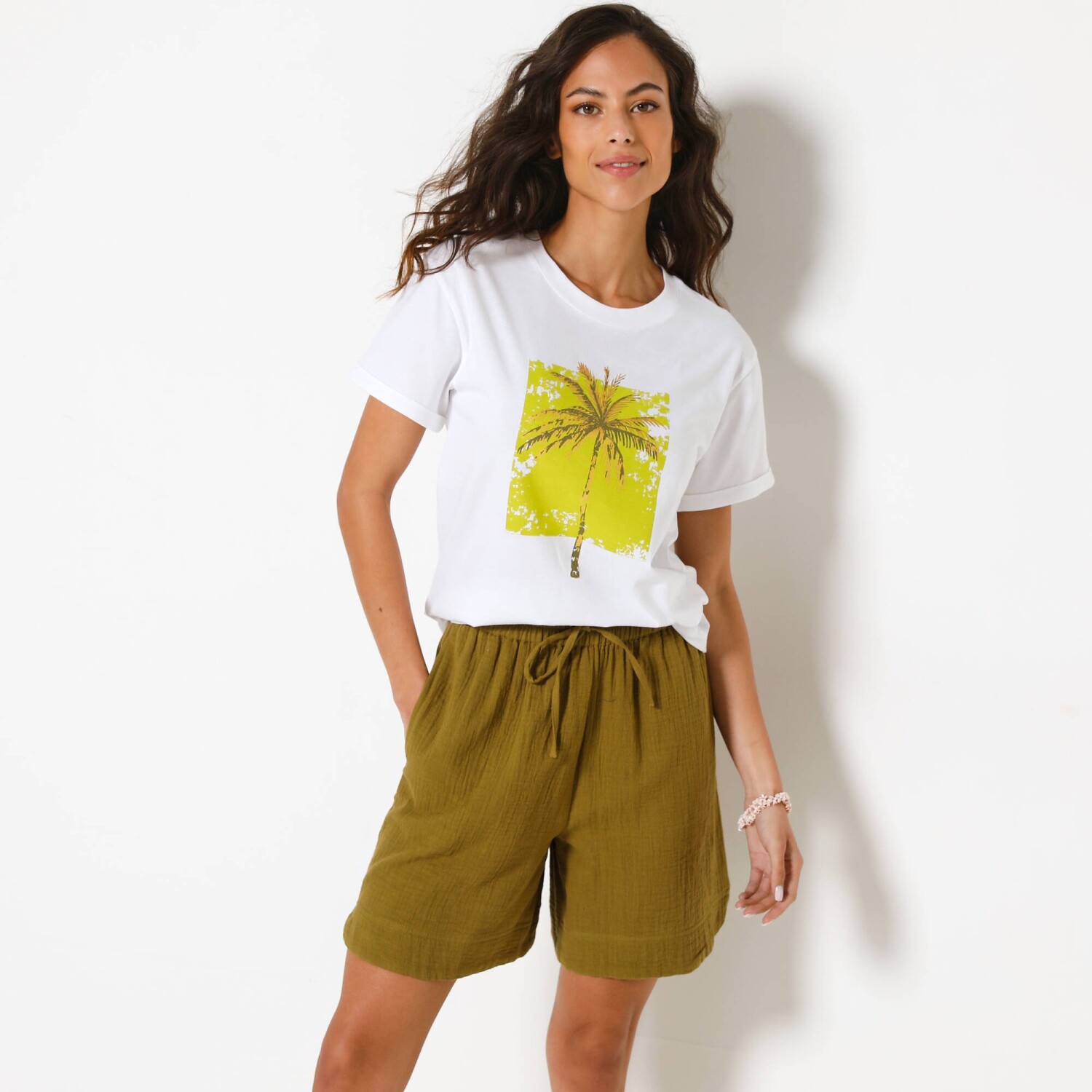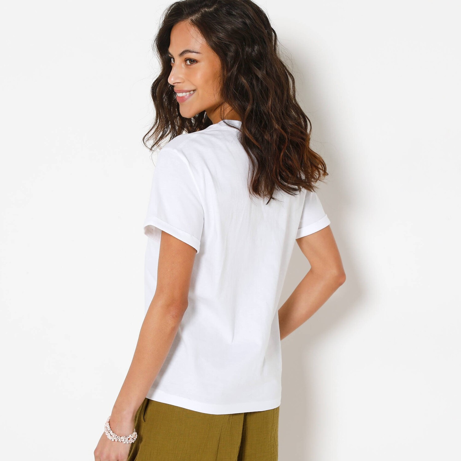 Jednokolorowa dzianinowa koszulka z guzikami na ramieniu i czesanym spodem, dla mniejszych sylwetek