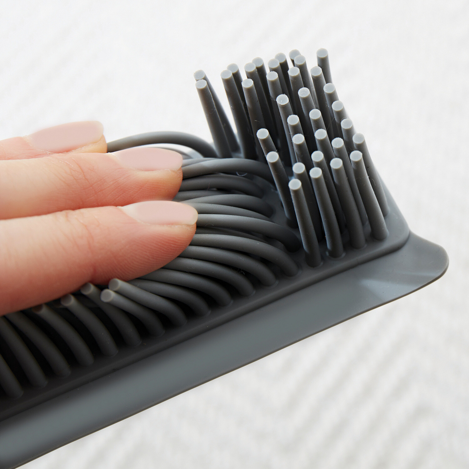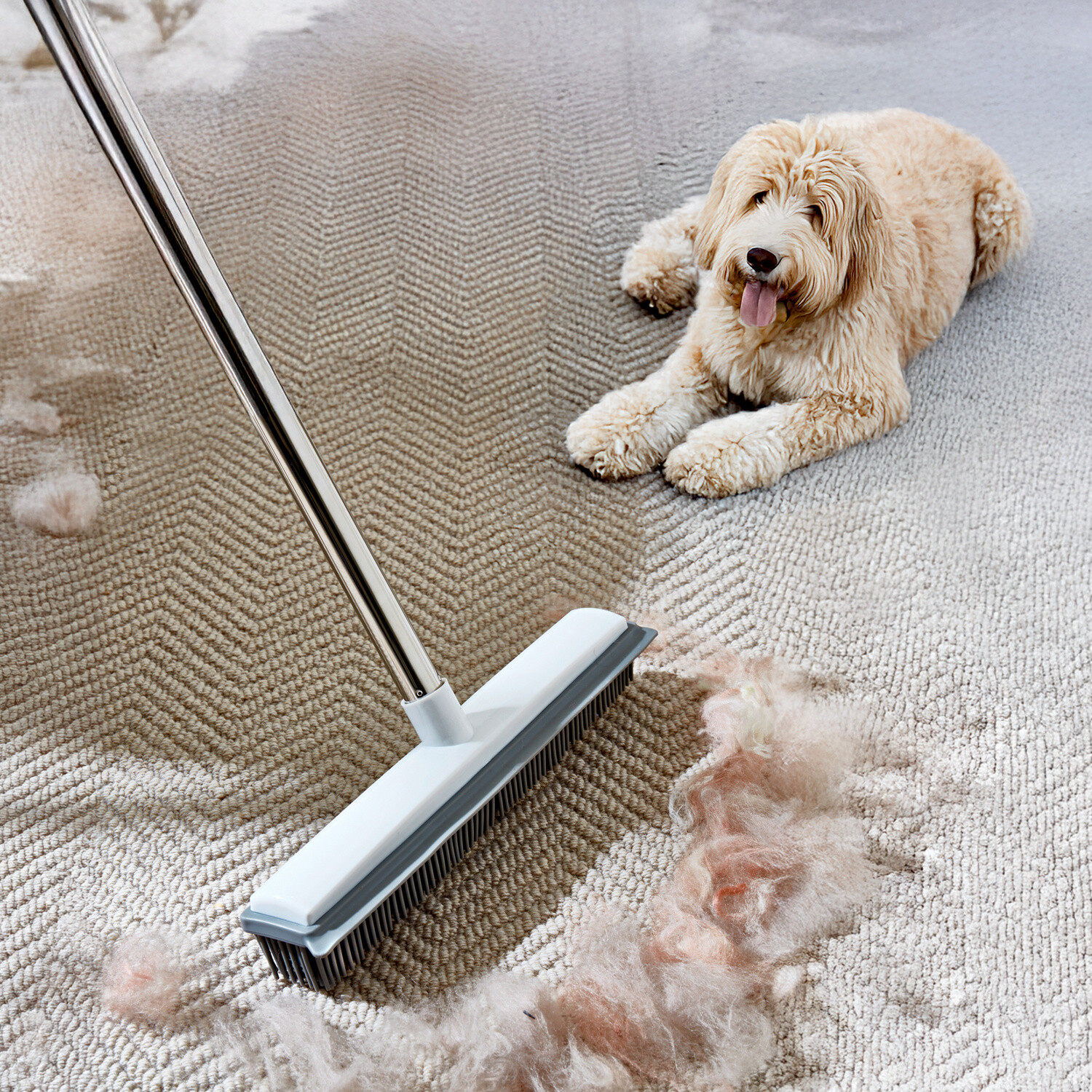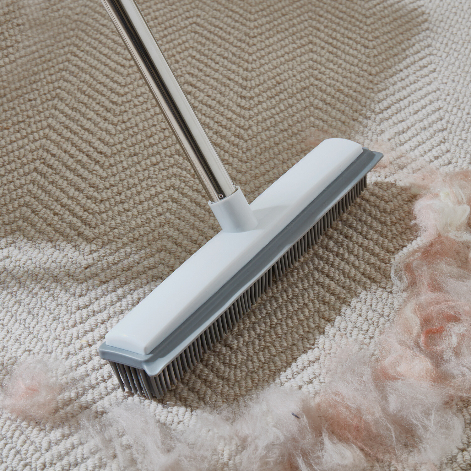 Miotła z miękkim, elektrostatycznym gumowym włosiem: przyciąga sierść zwierząt, kurz i nitki niczym magnes. Zintegrowana ściągaczka do płynów i odcisków łap na gładkich powierzchniach. Teleskopowa rączka rozciąga się do 120 cm.