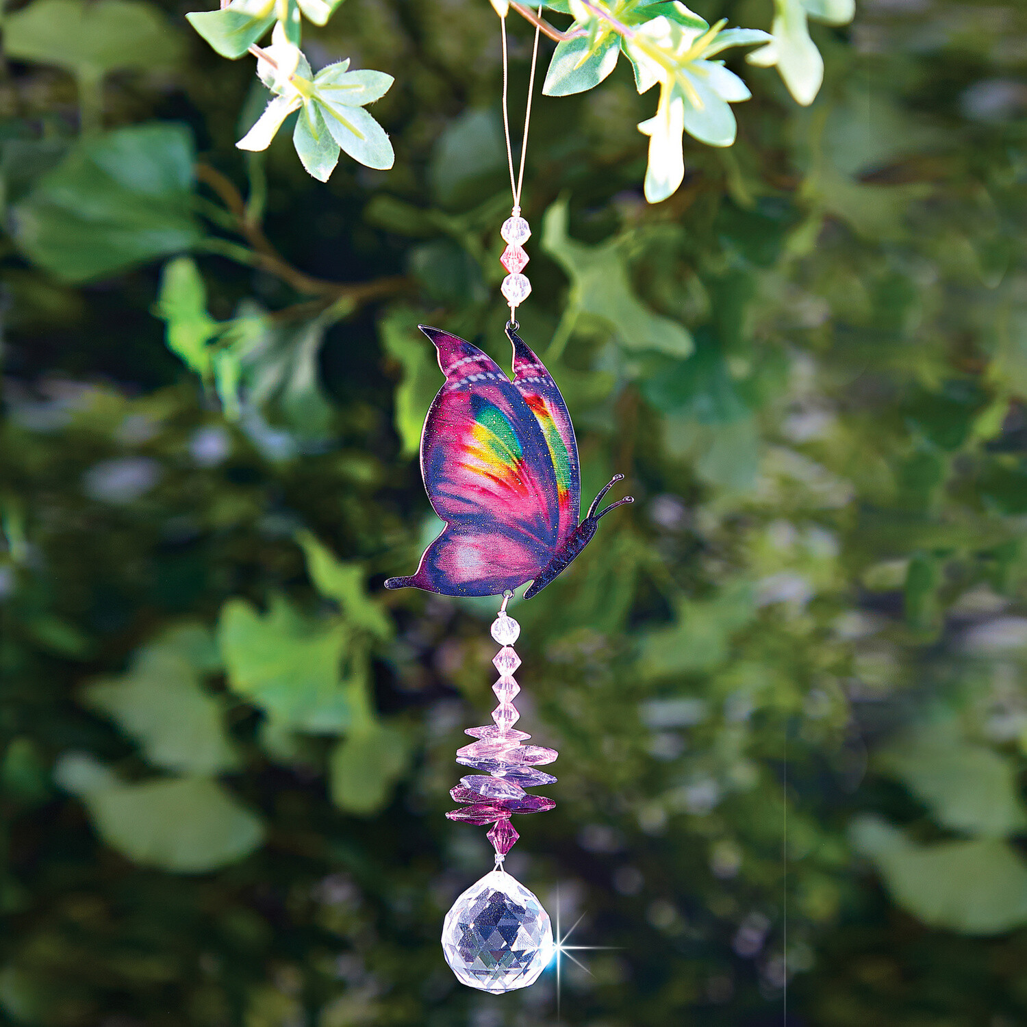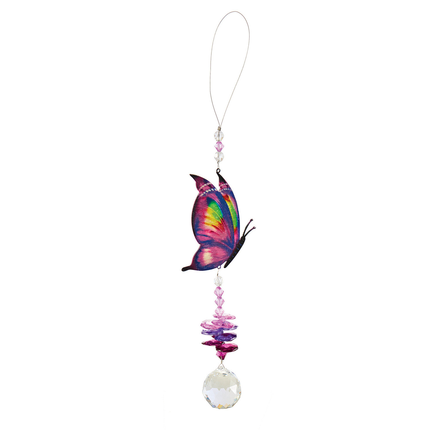 Piękny symbol ciepła i radości życia: filigranowy motyl z kolorowymi koralikami i szklanym brokatem. Wykorzystaj promienie słoneczne, aby uzyskać mieniącą się grę świateł i kolorów - wewnątrz i na zewnątrz. Zawiera oczko do zawieszenia. Stal nierdzewna. Zawiera metalową pętlę do zawieszenia. Do wnętrz i na zewnątrz. Gainsborough.