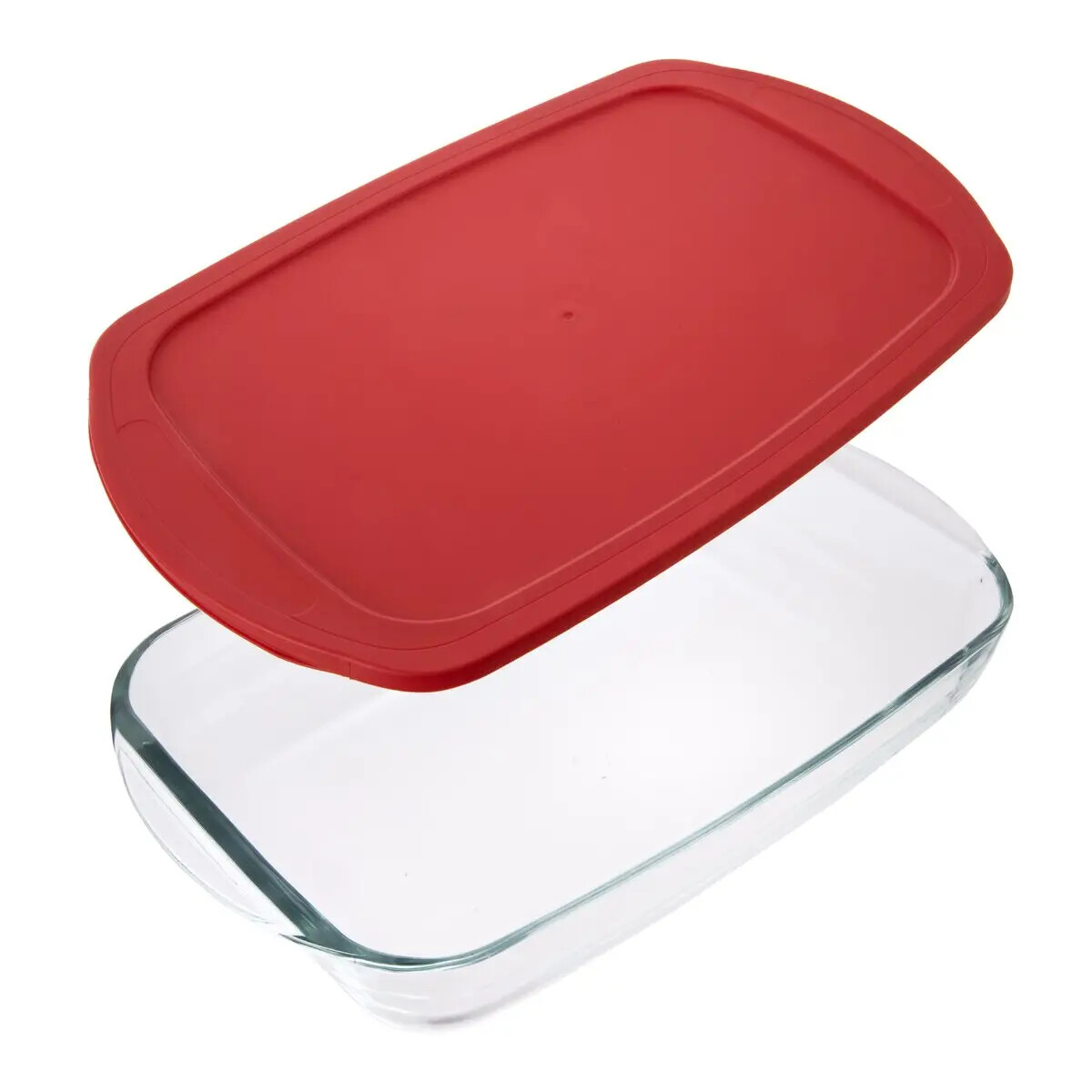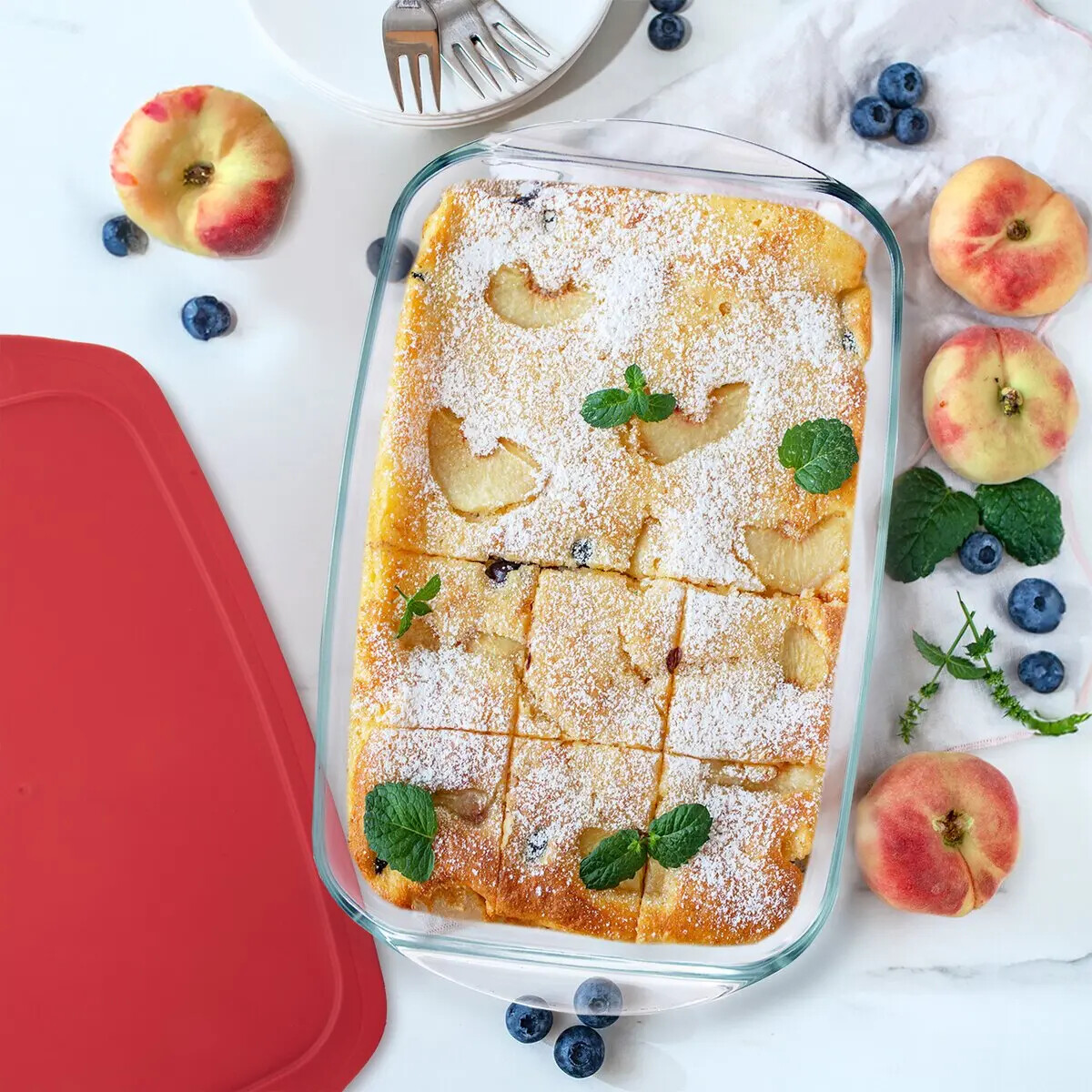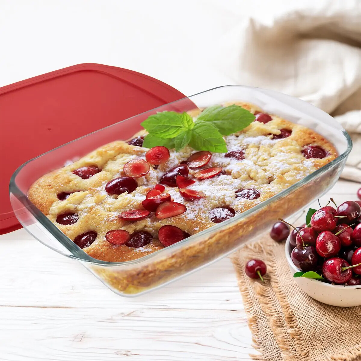 Naczynie żaroodporne z uchwytami umożliwia przygotowanie lasagne, makaronu z szynką, zapiekanki ziemniaczanej, chałki z owocami, ryżu na słodko i wielu innych potraw. Można w nim zapiekać, piec, podawać i przechowywać dania w lodówce. Dzięki pokrywie przygotowane danie można wygodnie transportować i przechowywać zarówno w lodówce, jak i poza nią, a pokrywa zapobiega wysychaniu potraw. Nadaje się również do przygotowania deserów, które wymagają chłodzenia. Produkt należy chronić przed nagłymi zmianami temperatury – szok termiczny może spowodować pęknięcie naczynia. Stosować powolne nagrzewanie i schładzanie, nie wlewać zimnej wody, lecz letnią. Gorące naczynie należy pozostawić do naturalnego wystygnięcia – nigdy nie wlewać do zimnego naczynia gorących lub wrzących płynów i odwrotnie. Nie używać środków czyszczących o właściwościach ściernych. Nadaje się do piekarnika (bez pokrywy), zmywarki i zamrażarki, a bez pokrywy także do mikrofalówki. Materiał: szkło borokrzemowe odporne na wysokie temperatury (-20 °C do +300 °C). Wymiary: 39,5 x 24,5 x 7 cm.