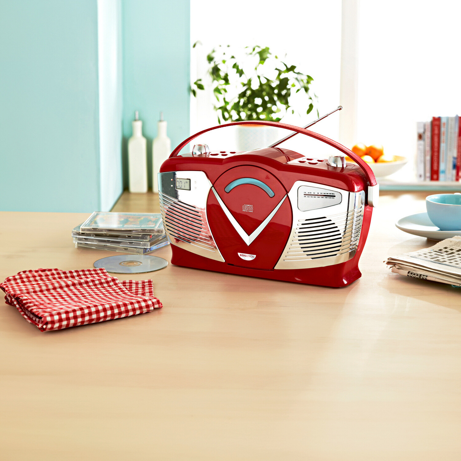 Nostalgiczny wygląd, ultranowoczesny dźwięk i funkcje! Oto odtwarzacz retro z wbudowanymi głośnikami stereo i imponującą mocą dźwięku: analogowe radio AM/FM, odtwarzacz CD i port USB do odtwarzania zapisanych plików MP3. Z łatwym w obsłudze wyświetlaczem LCD i wytrzymałym uchwytem, dzięki któremu będzie zawsze z Tobą! Zasilanie sieciowe i bateryjne (6 baterii C, brak w zestawie).