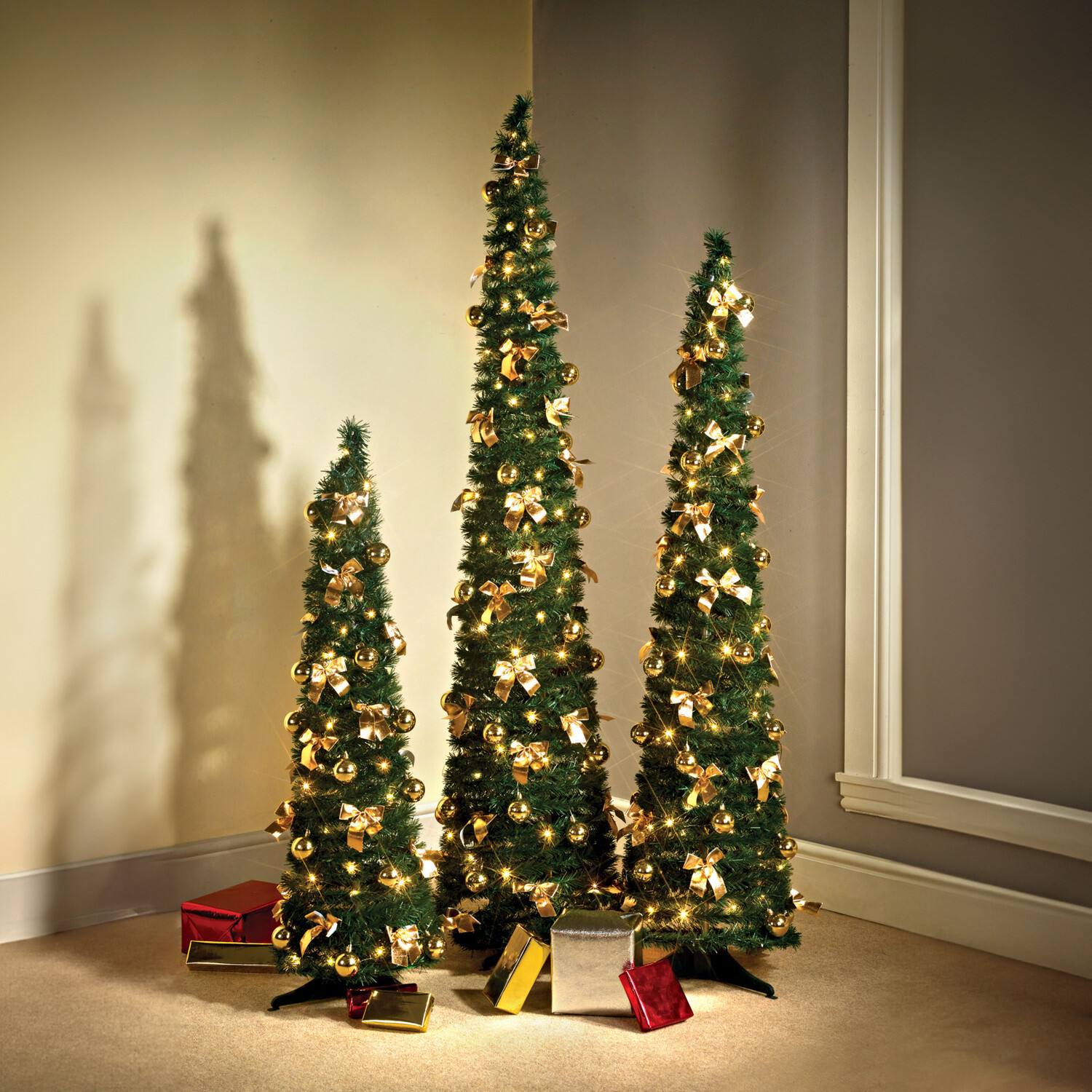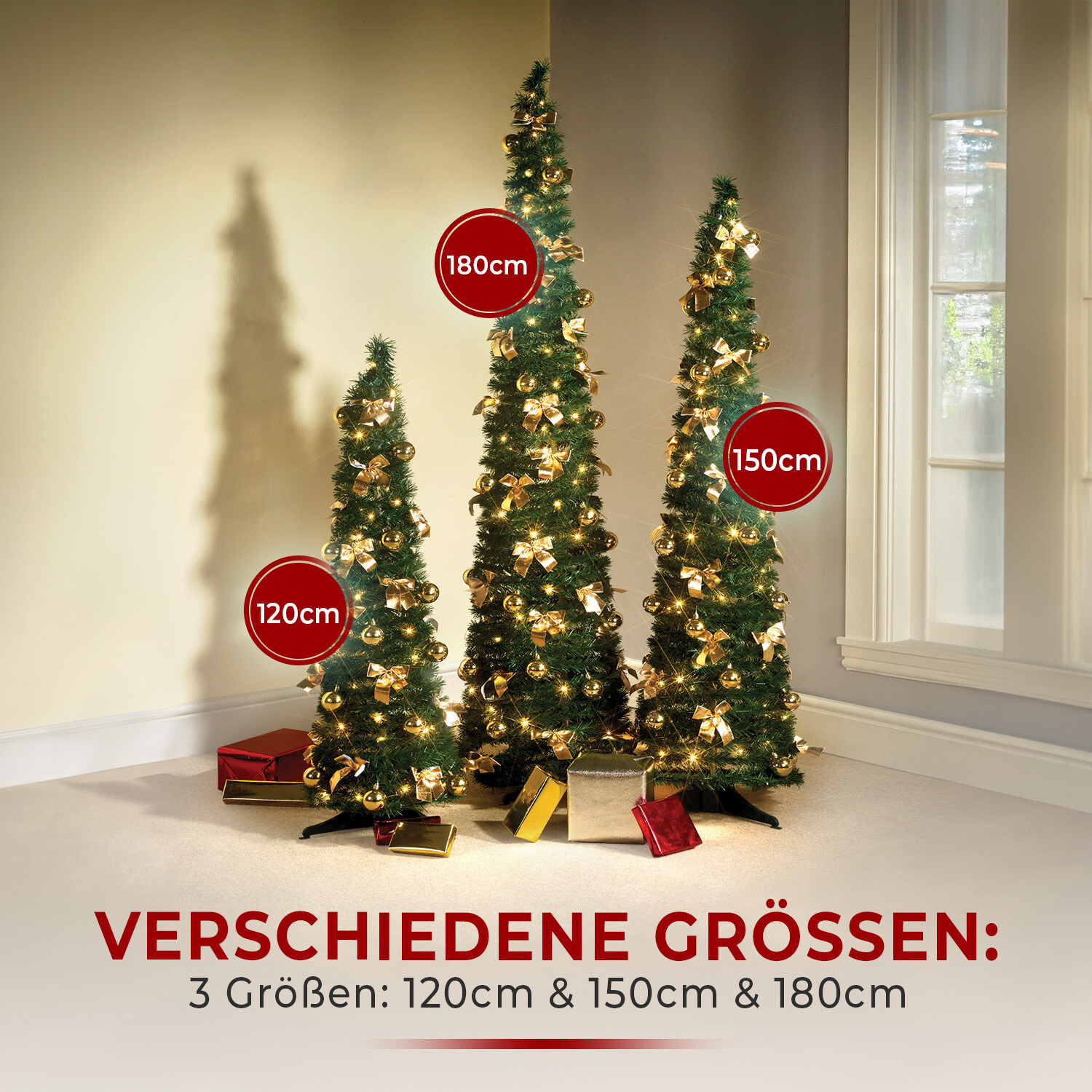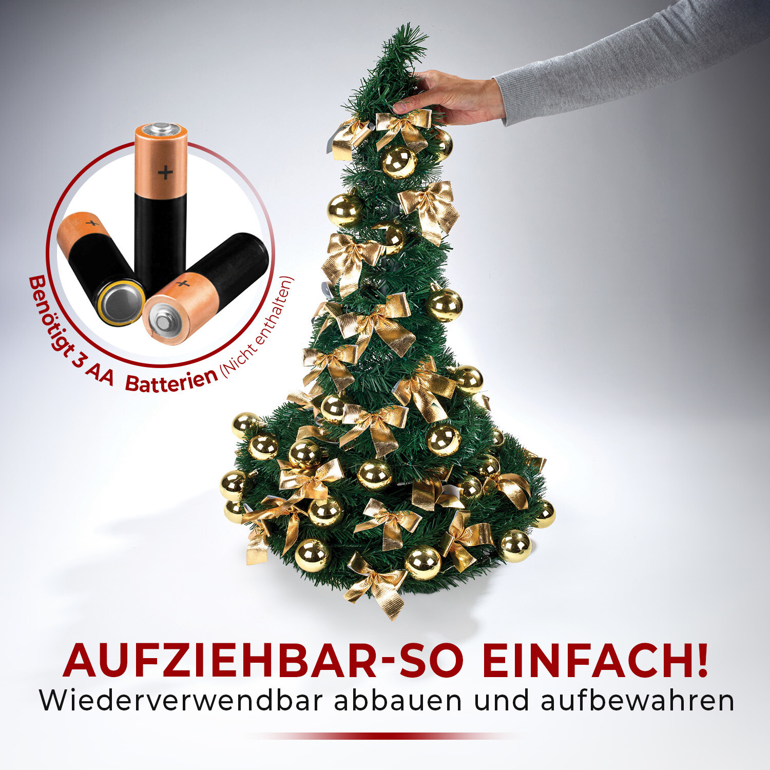Niesamowita choinka z oświetleniem – całkowicie udekorowana i złożona w mgnieniu oka! Wystarczy przymocować stojak do środkowej tyczki i wyciągnąć choinkę do góry. Twoja choinka jest gotowa, już uroczyście udekorowana ozdobnymi kokardkami, lampkami i bombkami. Wysuwany, oszczędza miejsce przez cały rok. Ustawienie choinki – jednym ruchem! Gotowa + udekorowana świątecznymi kokardkami + lampkami. Składana + zajmująca mało miejsca. Wielokrotnego użytku. Zasilanie bateryjne. Zamów również: 8 baterii AA, 1,5 V 416260.