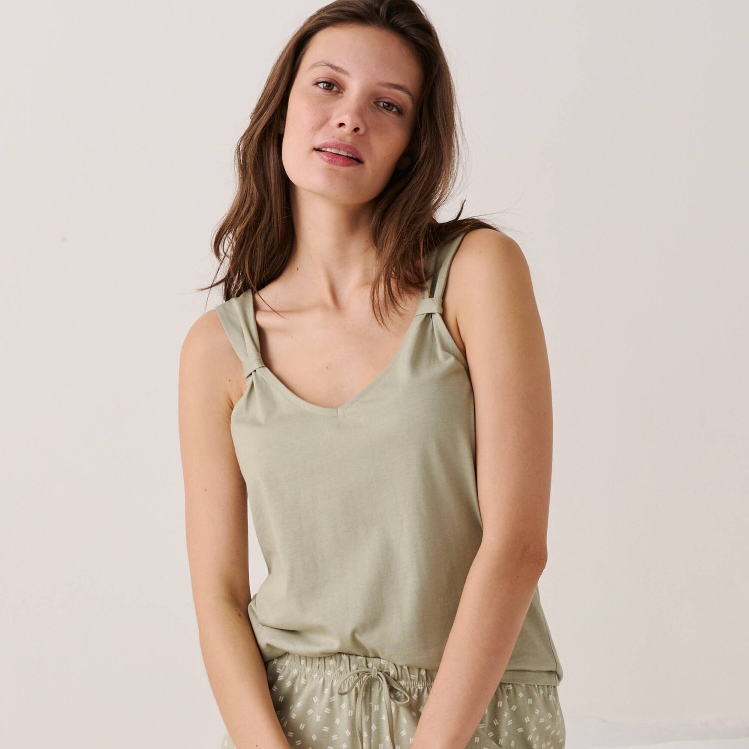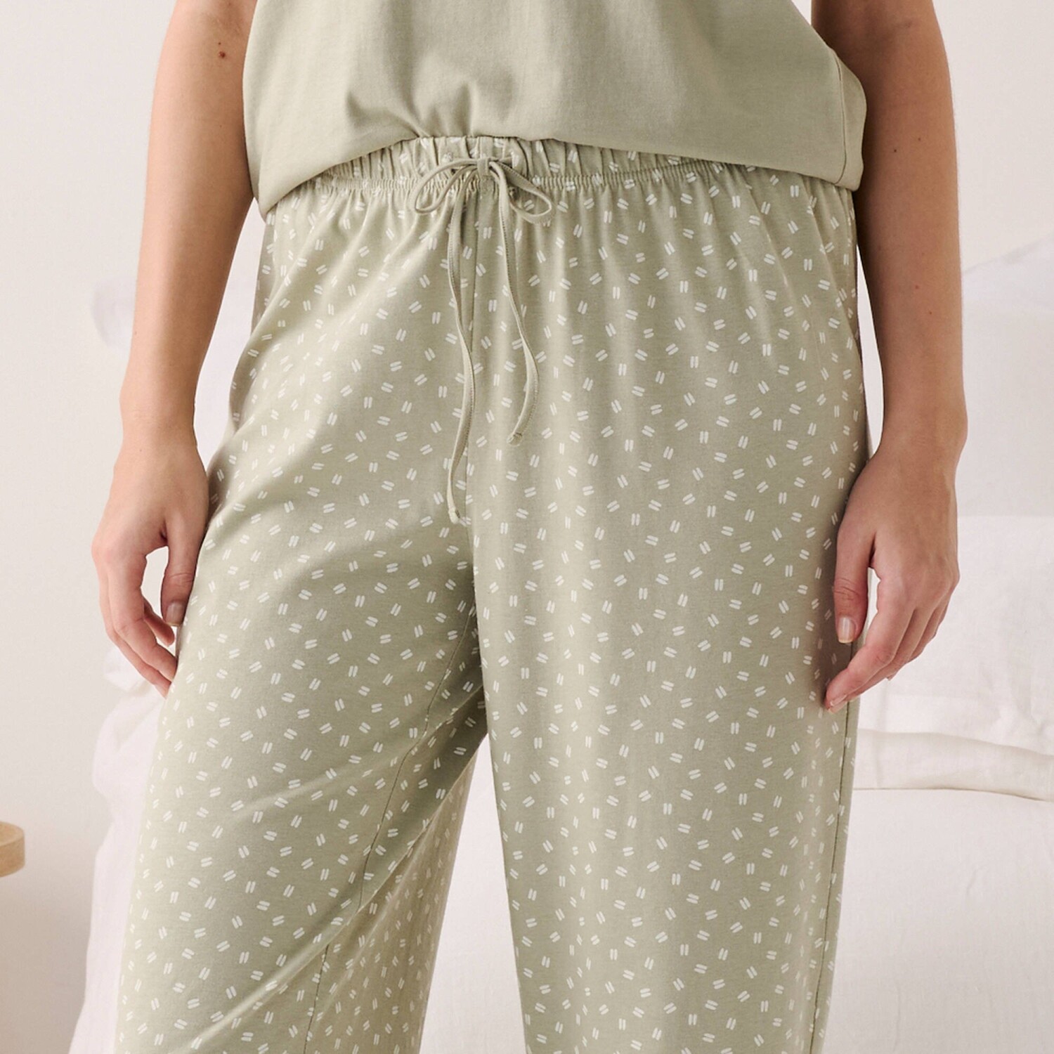 Ty również pokochasz piżamę z minimalistycznym nadrukiem. Góra w jednolitym kolorze. Zaokrąglony dekolt w serek. Szerokie ramiączka z przodu zwężane szlufką. Prosty tył. Prosty dół. Spodnie 7/8 z minimalistycznym wzorem. Gumka w pasie ze sznurkiem. Długość 7/8. Szerokie nogawki. Wygodna bawełna. Standard 100 według Oeko-Tex (nr CQ 1216 / 3 IFTH). Ten znak oznacza produkty tekstylne poddane testom laboratoryjnym na obecność szerokiej gamy substancji szkodliwych, a produkt jest bezpieczny w stopniu wykraczającym poza obowiązujące normy. Można prać w pralce.