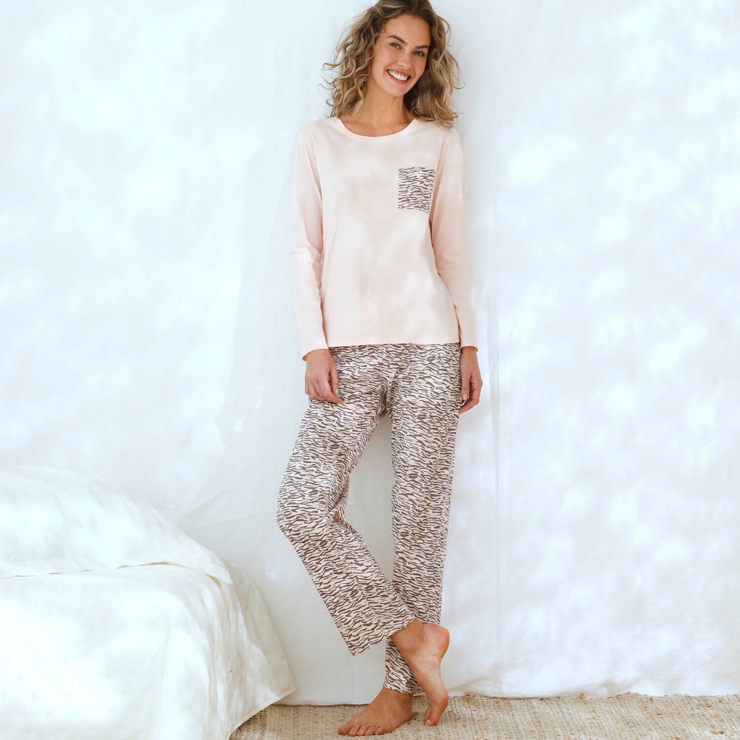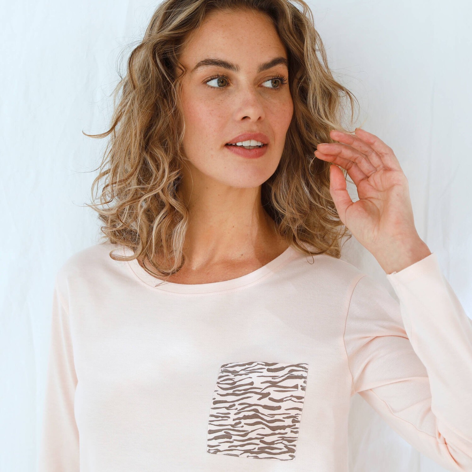 Przewiewny dżersej, kolorowy nadruk i wyjątkowy komfort: piżama z nadrukiem zebry wie, jak się podobać. T-shirt. Długie rękawy. Nadrukowana naszywana kieszeń na piersi. Prosty dół. Spodnie z nadrukiem: elastyczny pas ze sznurkiem ściągającym. Proste nogawki. Oeko-Tex Standard 100 (nr CQ 1216 / 3 IFTH). Znak ten identyfikuje produkty tekstylne, które zostały poddane testom laboratoryjnym pod kątem szerokiej gamy szkodliwych substancji, a produkt jest bezpieczny poza obowiązującymi normami. Można prać w pralce.