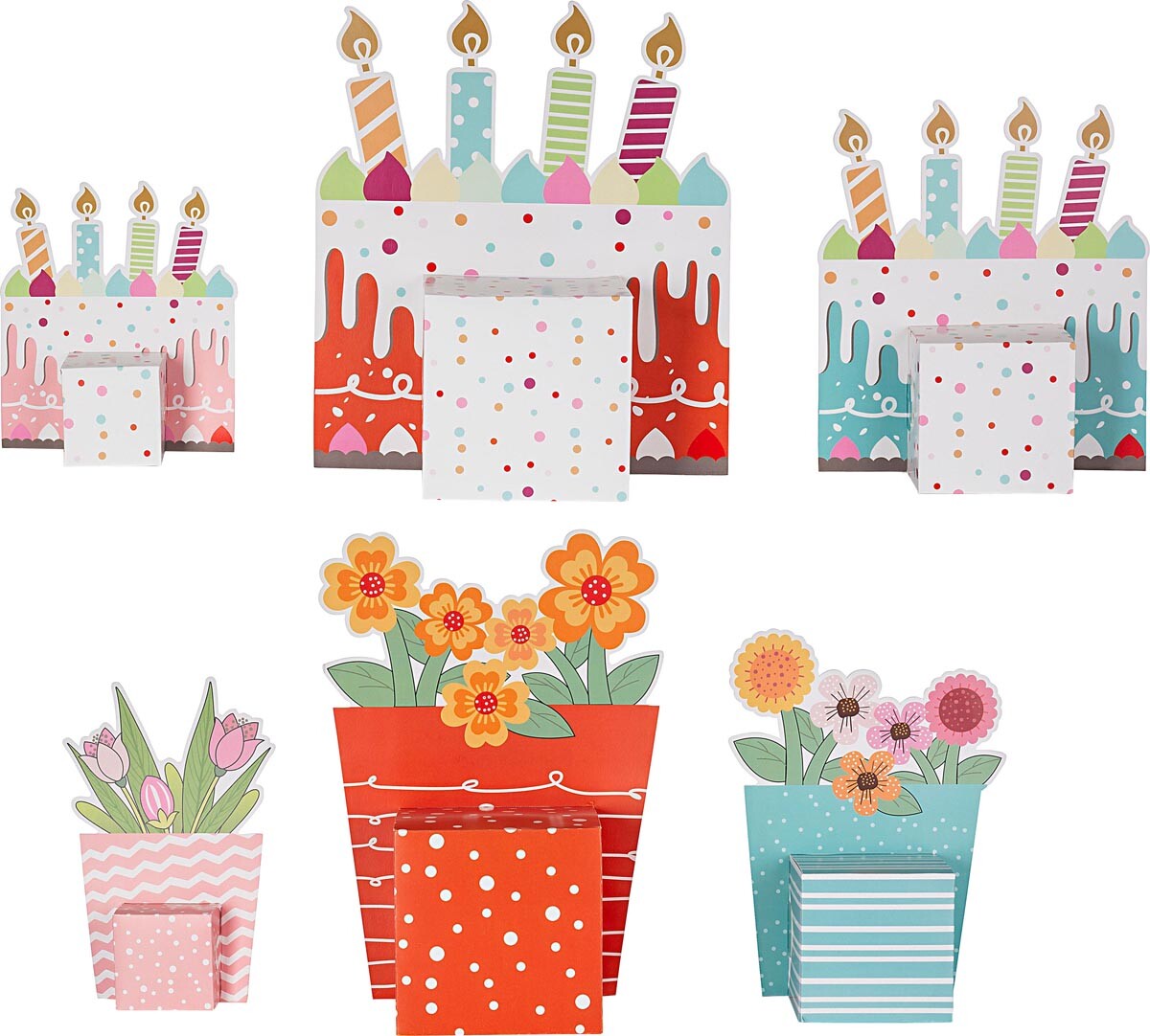 Zestaw 6 pudełek upominkowych w 3 rozmiarach – solidne, składane, z wesołymi motywami urodzinowymi. Łatwe do złożenia, szybkie do zapakowania i ozdobienia dzięki zintegrowanym uchwytom. Idealne rozwiązanie, gdy chcesz podarować pięknie wyglądający prezent bez zbędnych przygotowań. Materiał: papier. Wymiary: 6 x 6 x 6 cm, 9 x 9 x 9 cm, 12 x 12 x 12 cm – po 2 sztuki z każdego rozmiaru.