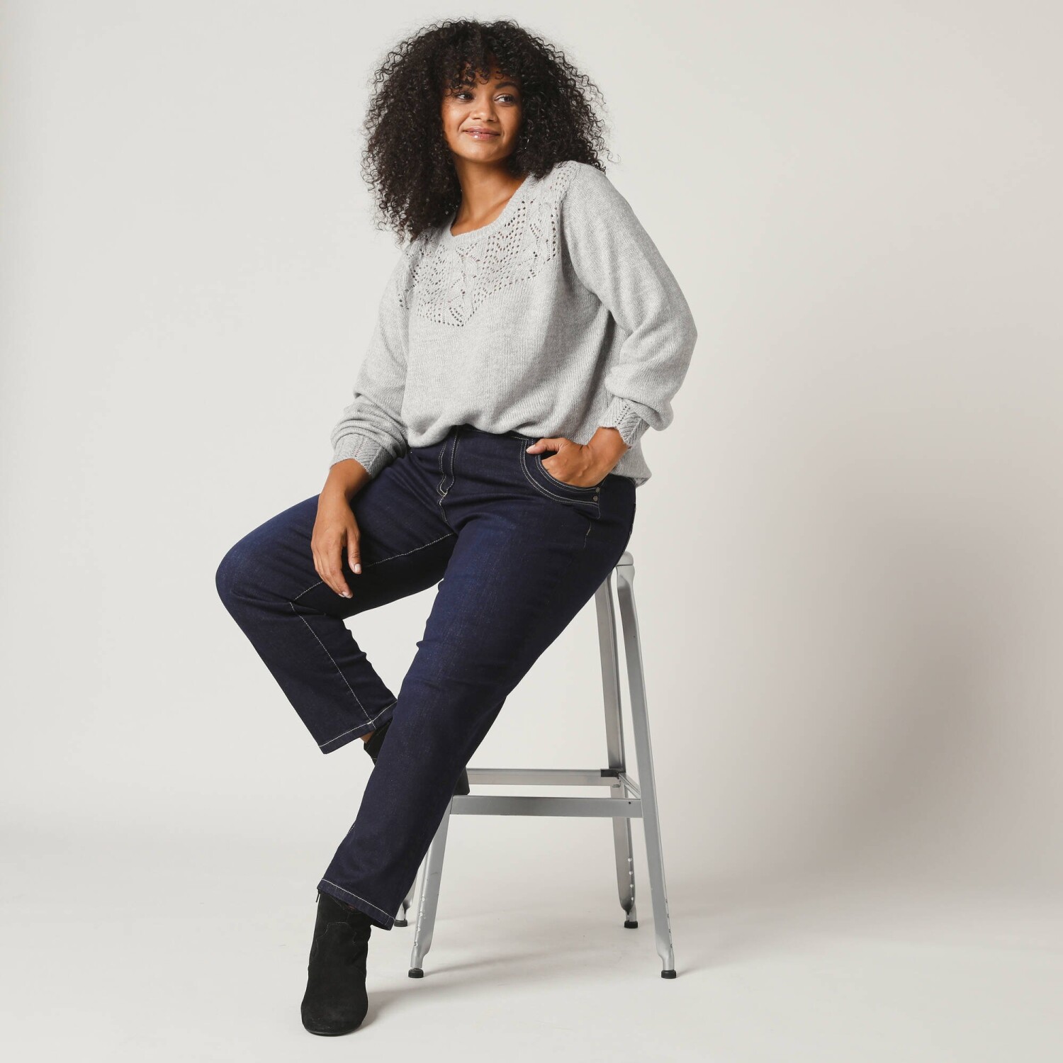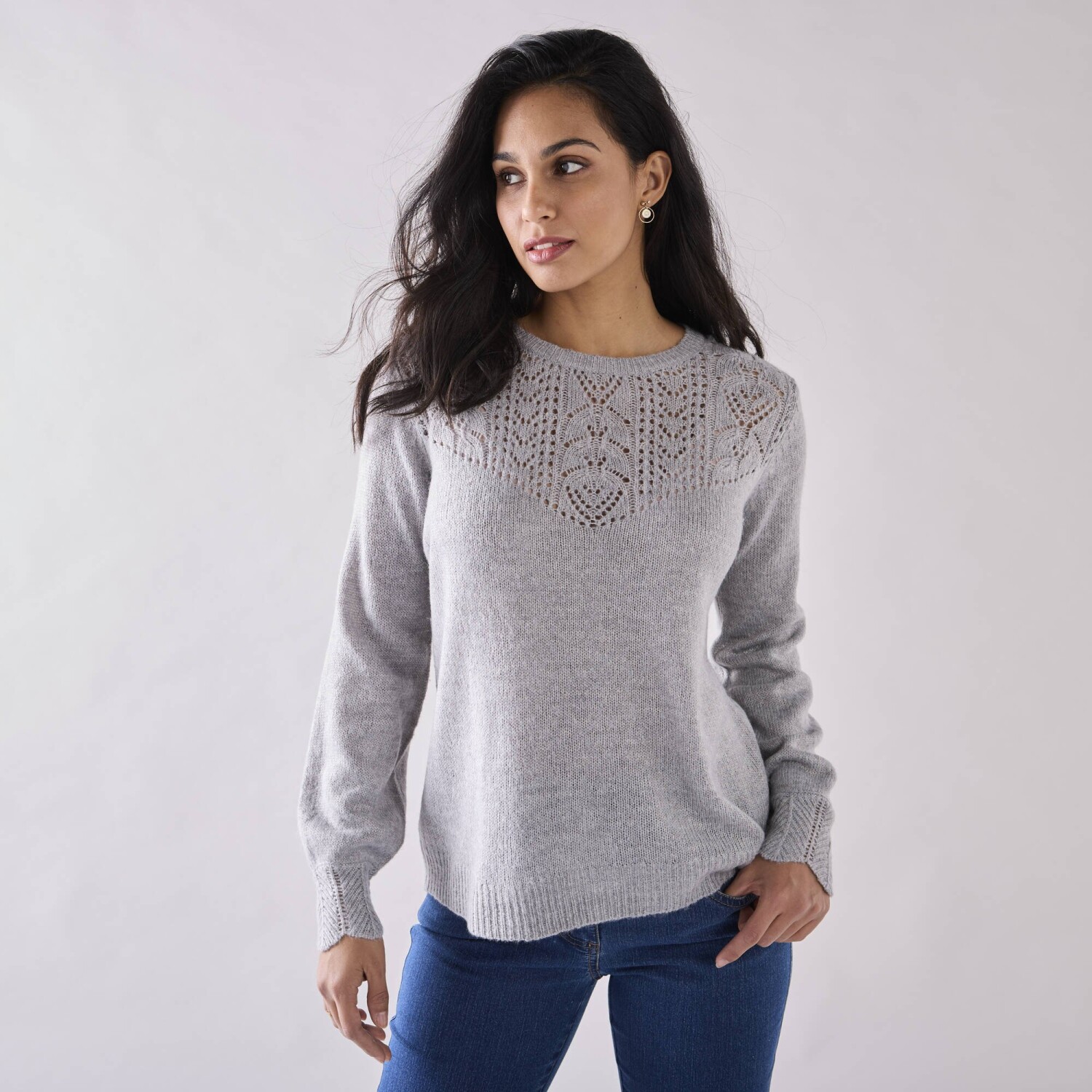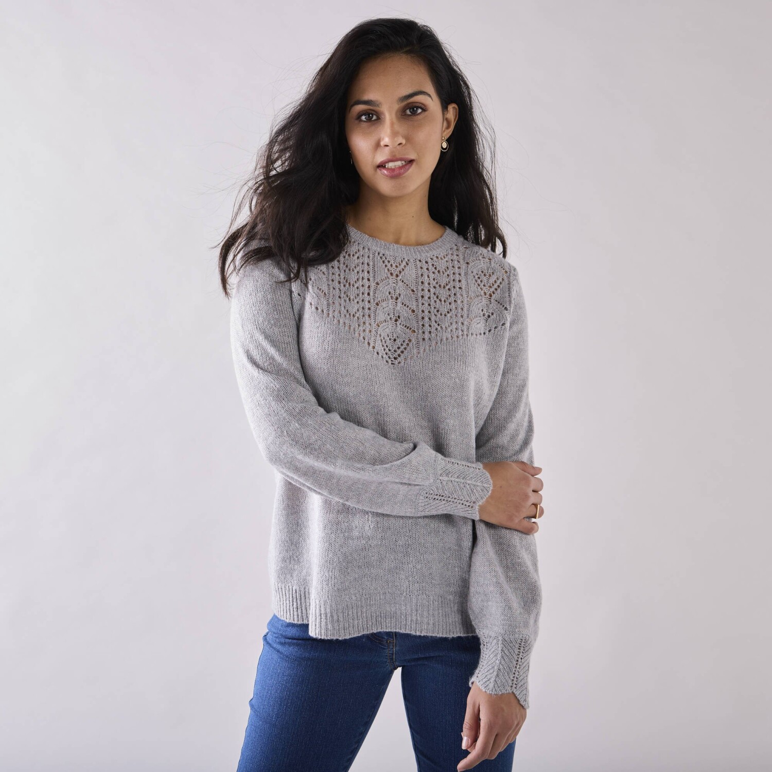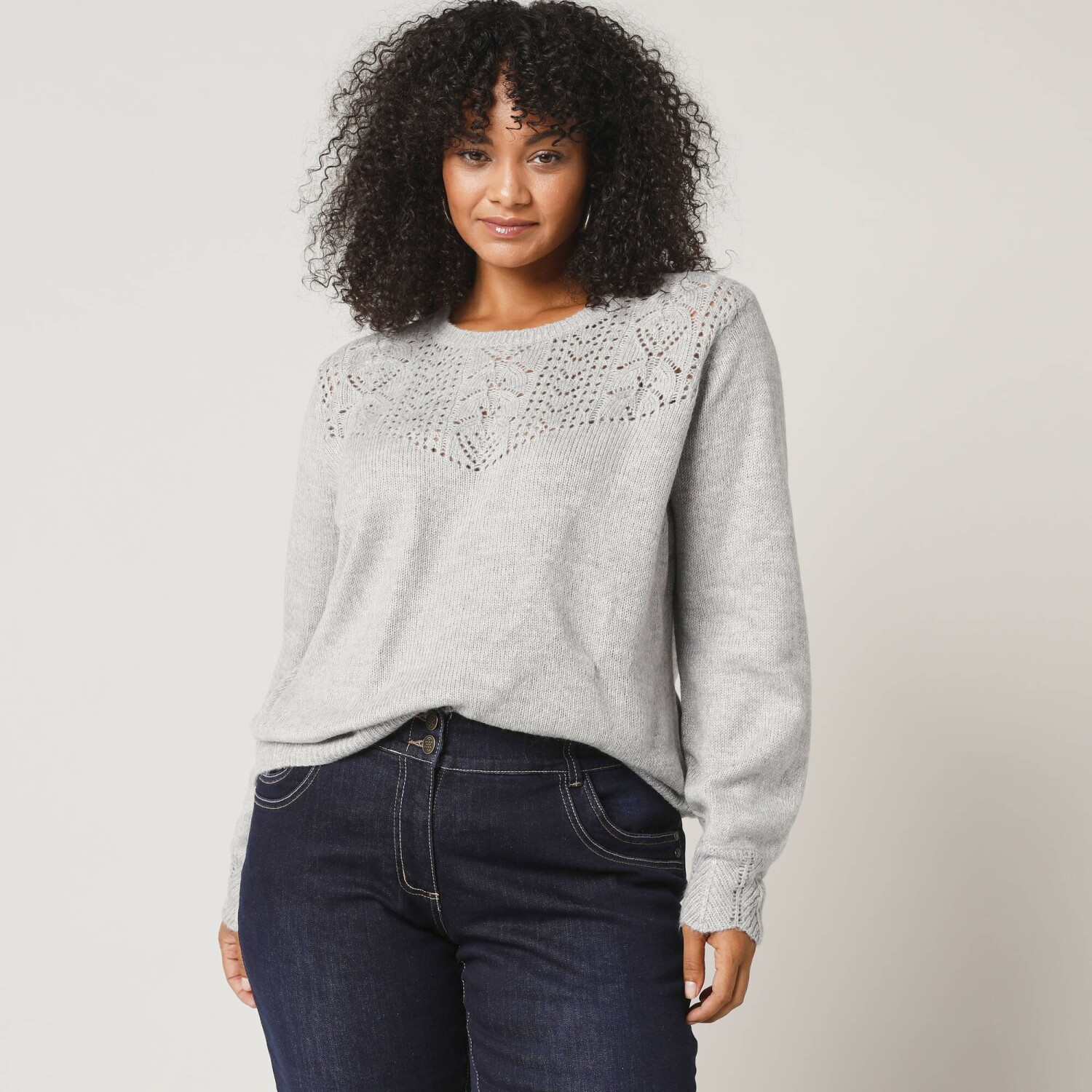 Sweter z koronkowym wzorem i dekoltem tuniki zapinanym na guziki