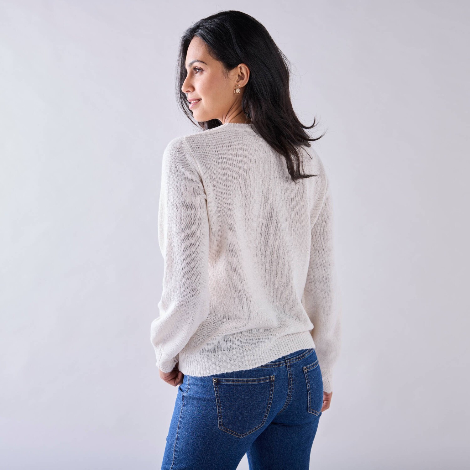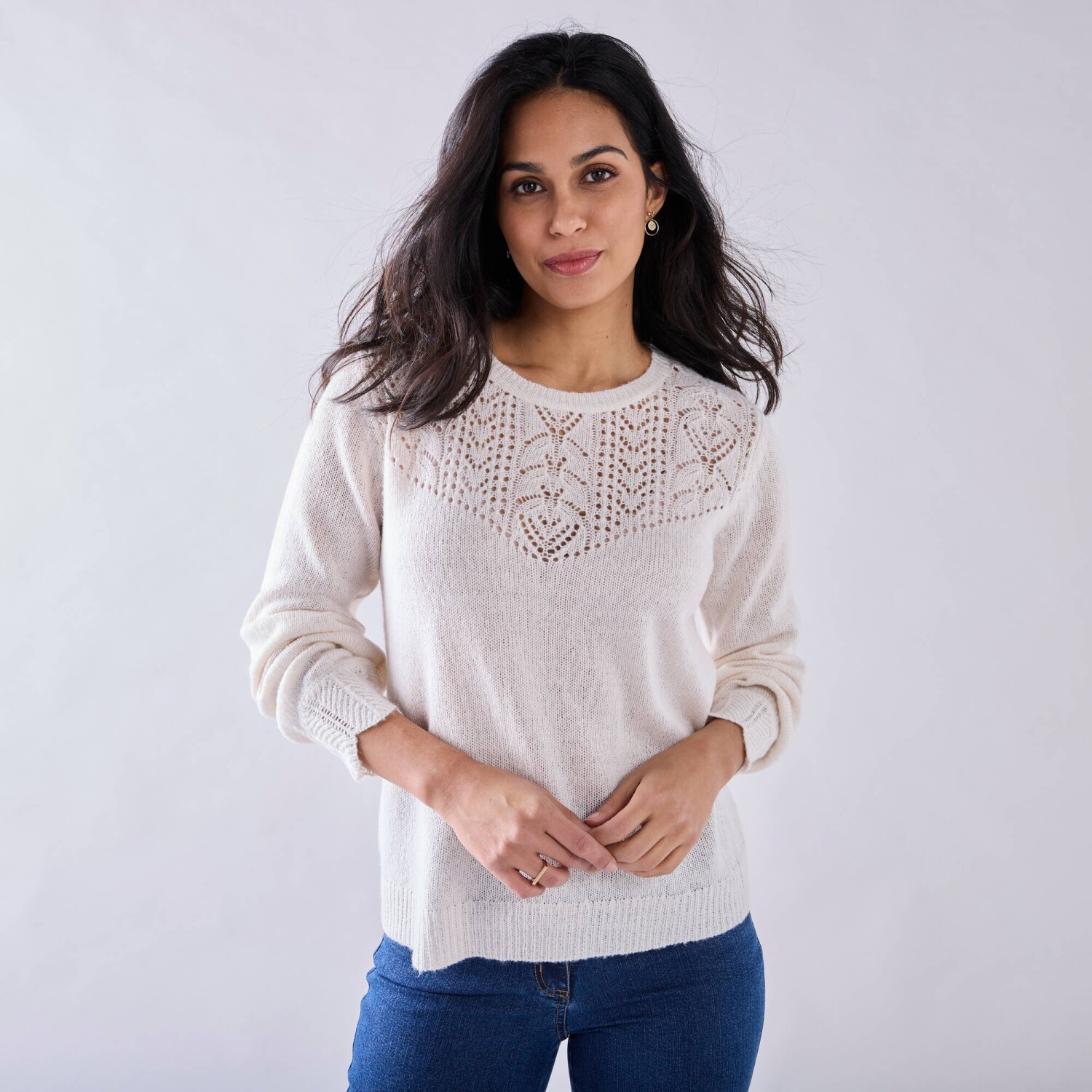 Damski sweter ociepli Twoją zimową stylizację. Miękki w dotyku. Odwrócony dżersej i koronkowe detale z przodu. Okrągły dekolt z ażurowym wykończeniem. Długie rękawy bluzki. Mankiety z falistym wykończeniem i ażurowym wzorem. Prosty dół. Można prać w pralce.
