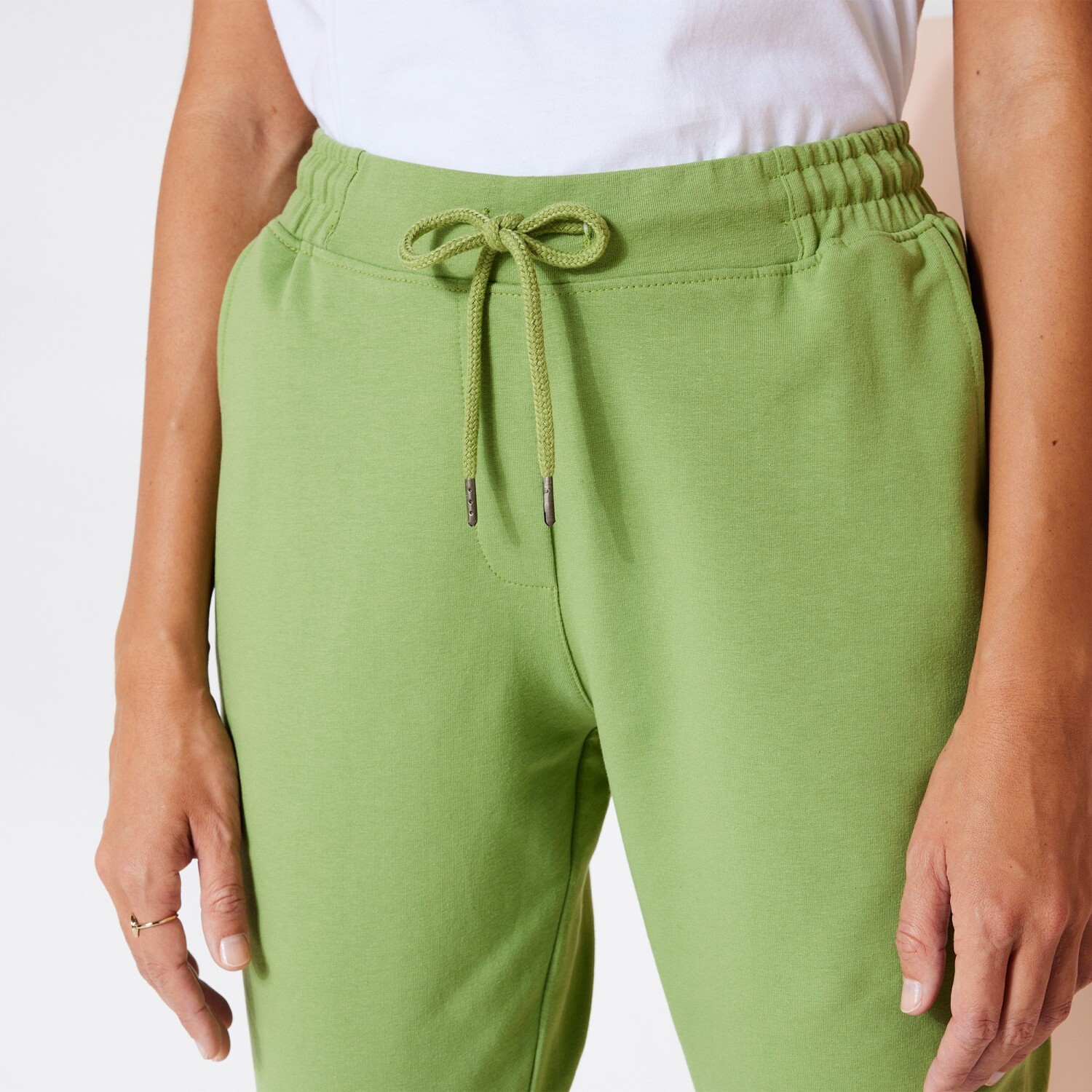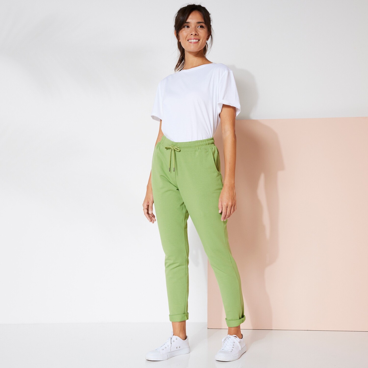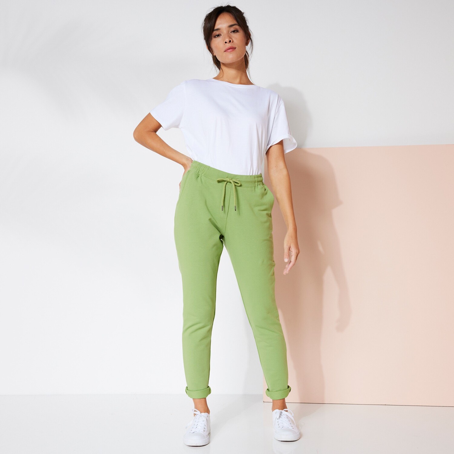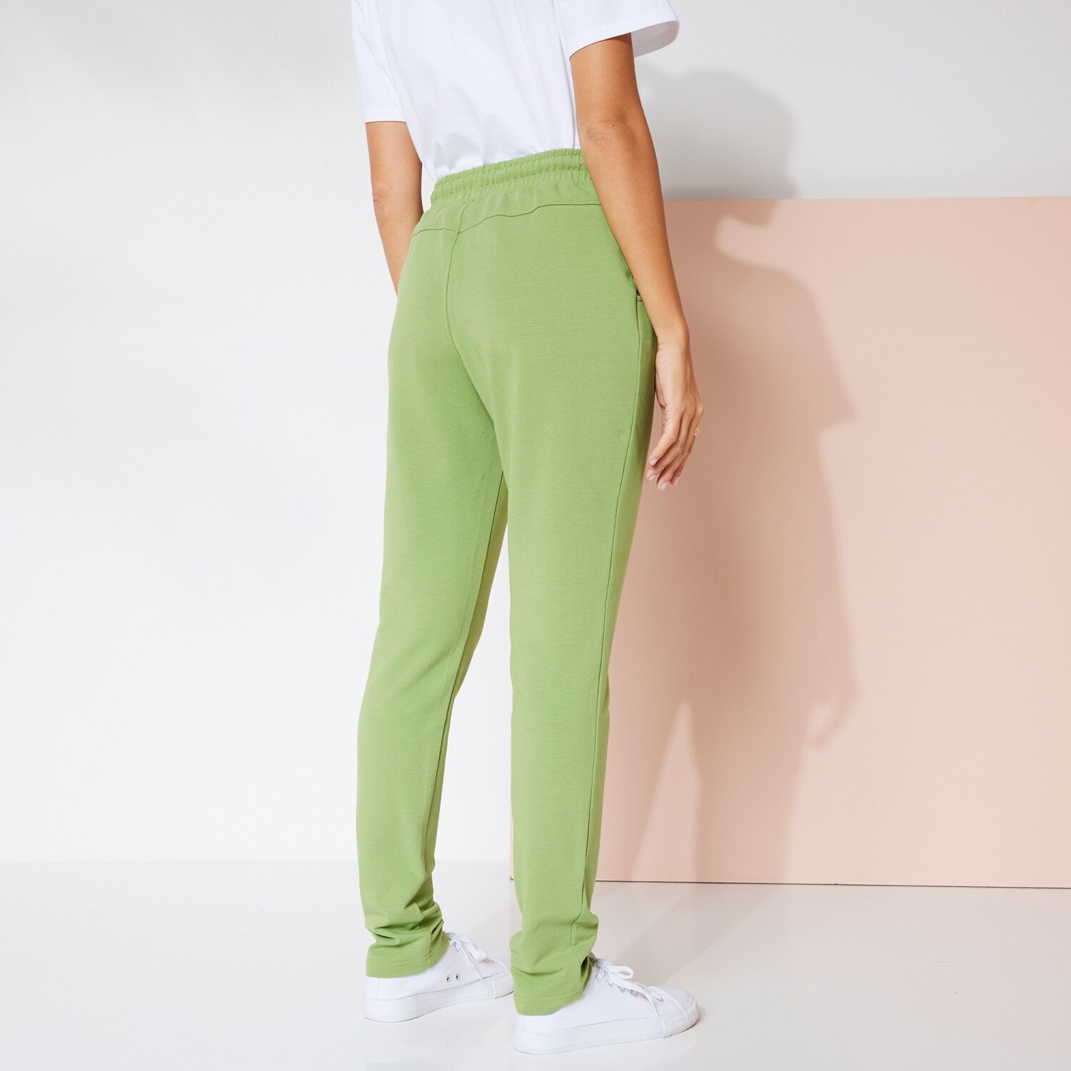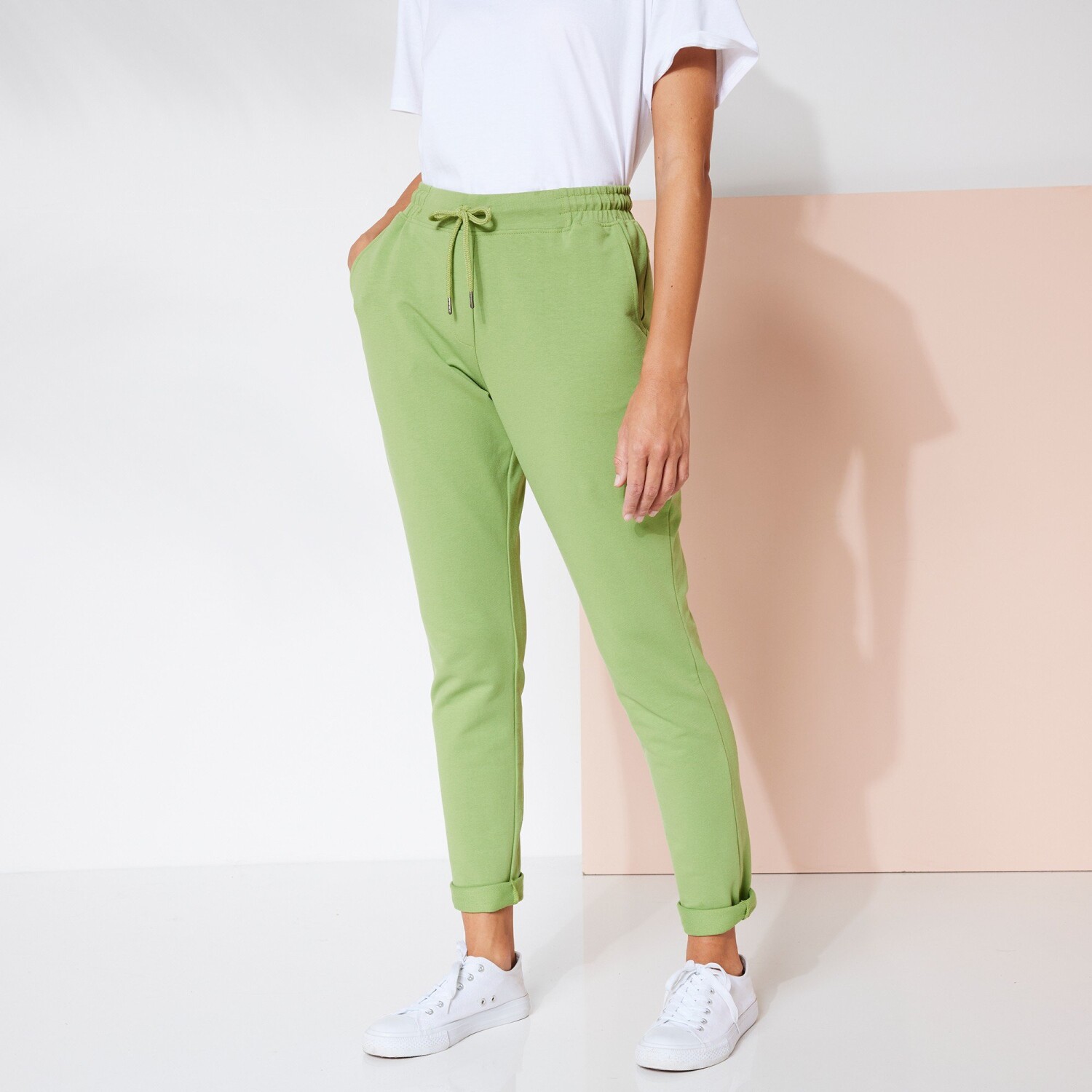 Spodnie cargo z dzianiny Milano świetnie sprawdzą się w połączeniu ze sneakersami i sandałami na obcasie. Dzianina Milano. Szeroki, płaski pas z przodu, gumka z tyłu. Sznurek w pasie. 2 przednie kieszenie ze ściągaczem. 5 szlufek na pasek. 2 fałszywe kieszenie ze ściągaczami z tyłu. Spodnie z elastycznymi zwężeniami na końcach. Można prać w pralce.