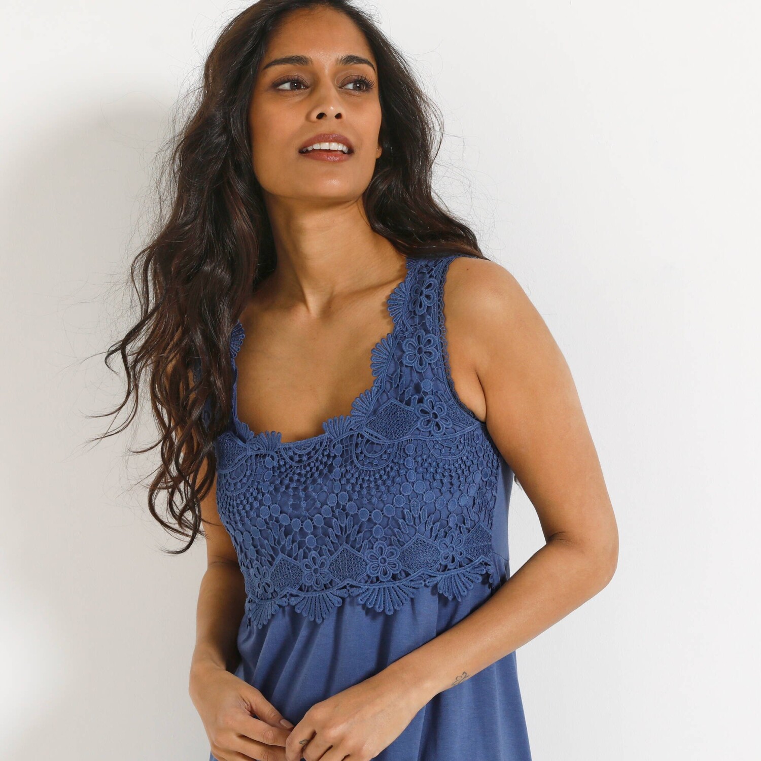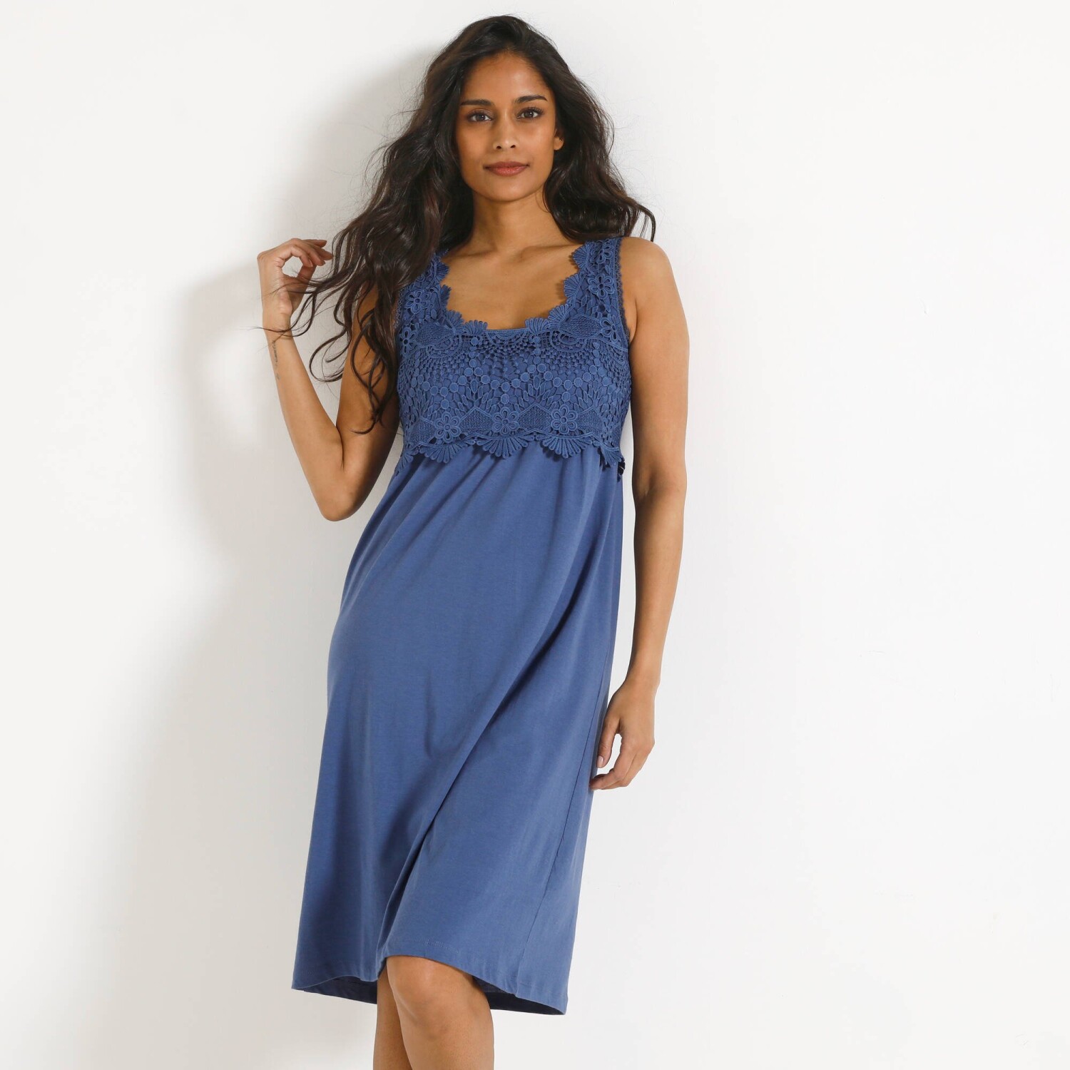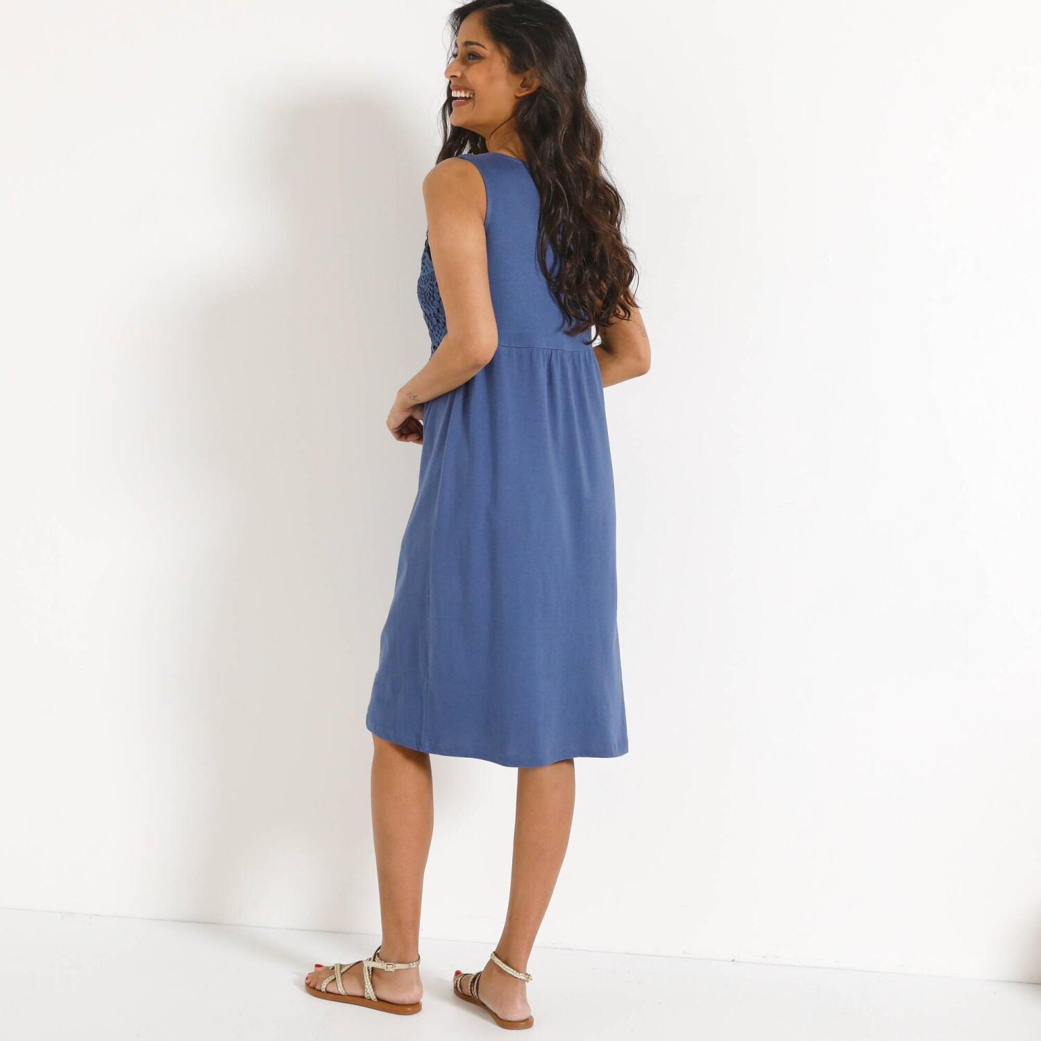 Rozkloszowana sukienka z falbanami i nadrukiem zapewni absolutną swobodę ruchów. Okrągły dekolt z rozcięciem i 2 sznurkami ściągającymi. Przód pod biustem. Rozcięcie z tyłu. Rękawy 3/4 z elastycznymi mankietami. Szeroka falbana u dołu. Przedłużony krój. Można prać w pralce.