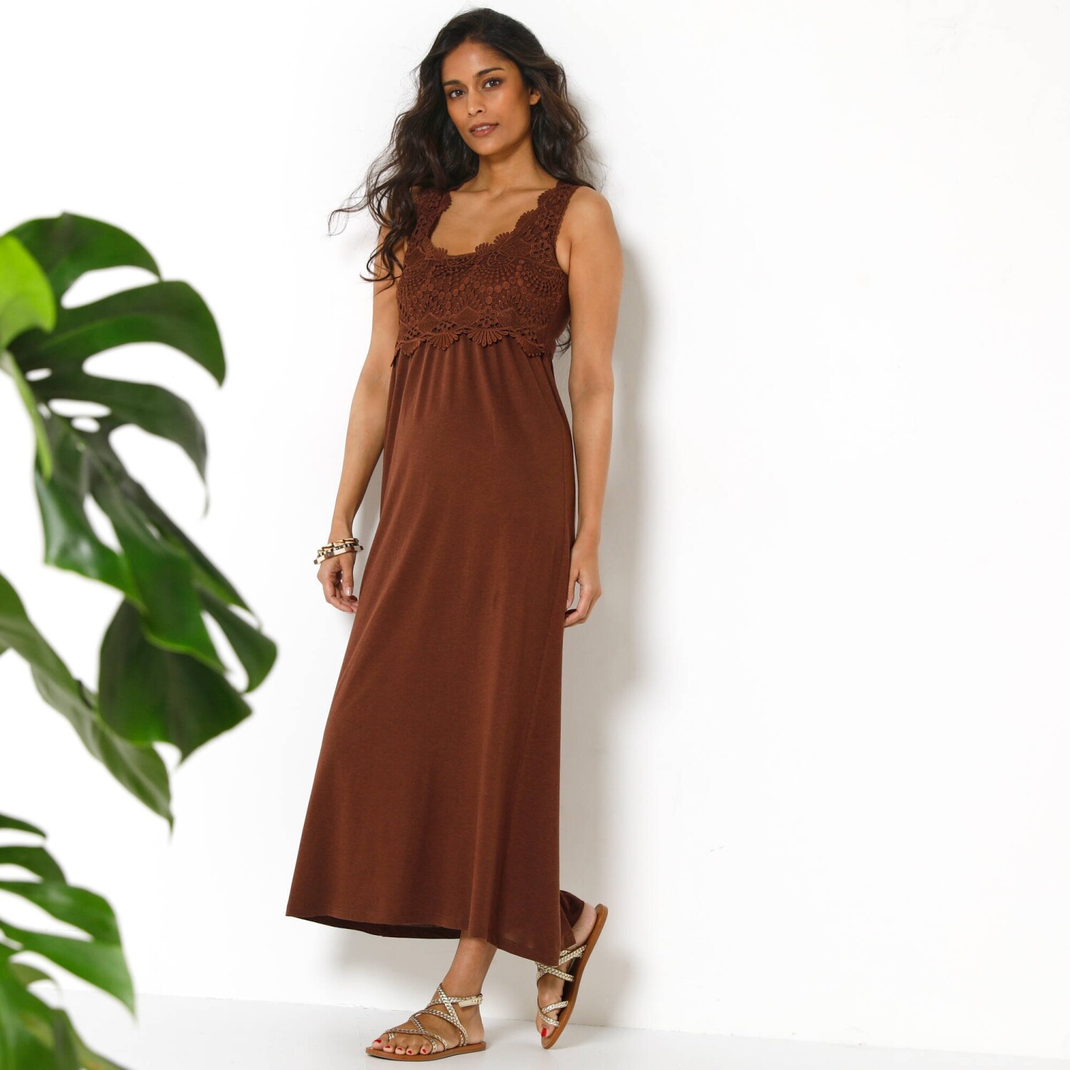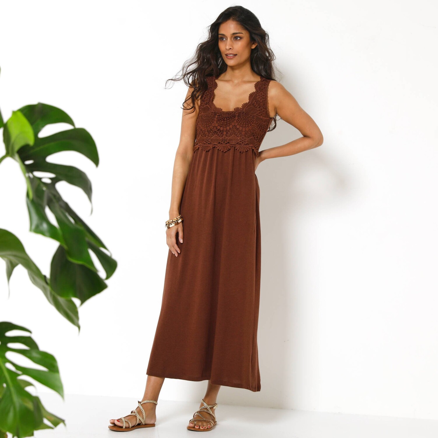 Ta sukienka midi z gorsetem makramowym i zwiewnym krojem doda Ci kobiecego wyglądu. Okrągły dekolt z gorsetem makramowym. Wycięcia z przodu i z tyłu oraz marszczenia. Szerszy dół. Wygodna długość. Produkt został wykonany z wiskozy Lenzing™ EcoVero™. Ekologiczna wiskoza to materiał wytwarzany z pulpy pochodzącej ze zrównoważonych lasów. Proces produkcji zużywa mniej wody i energii. Można prać w pralce.