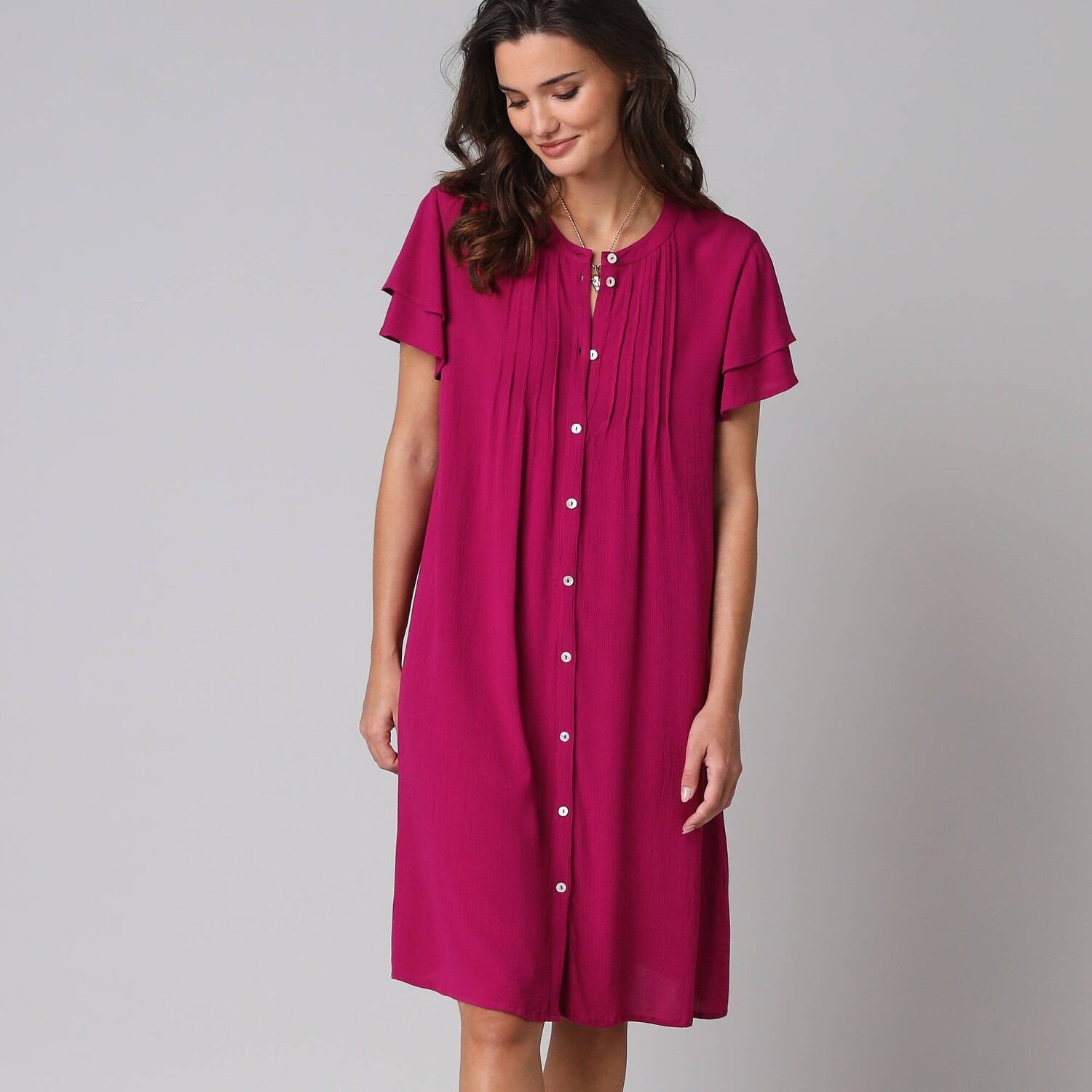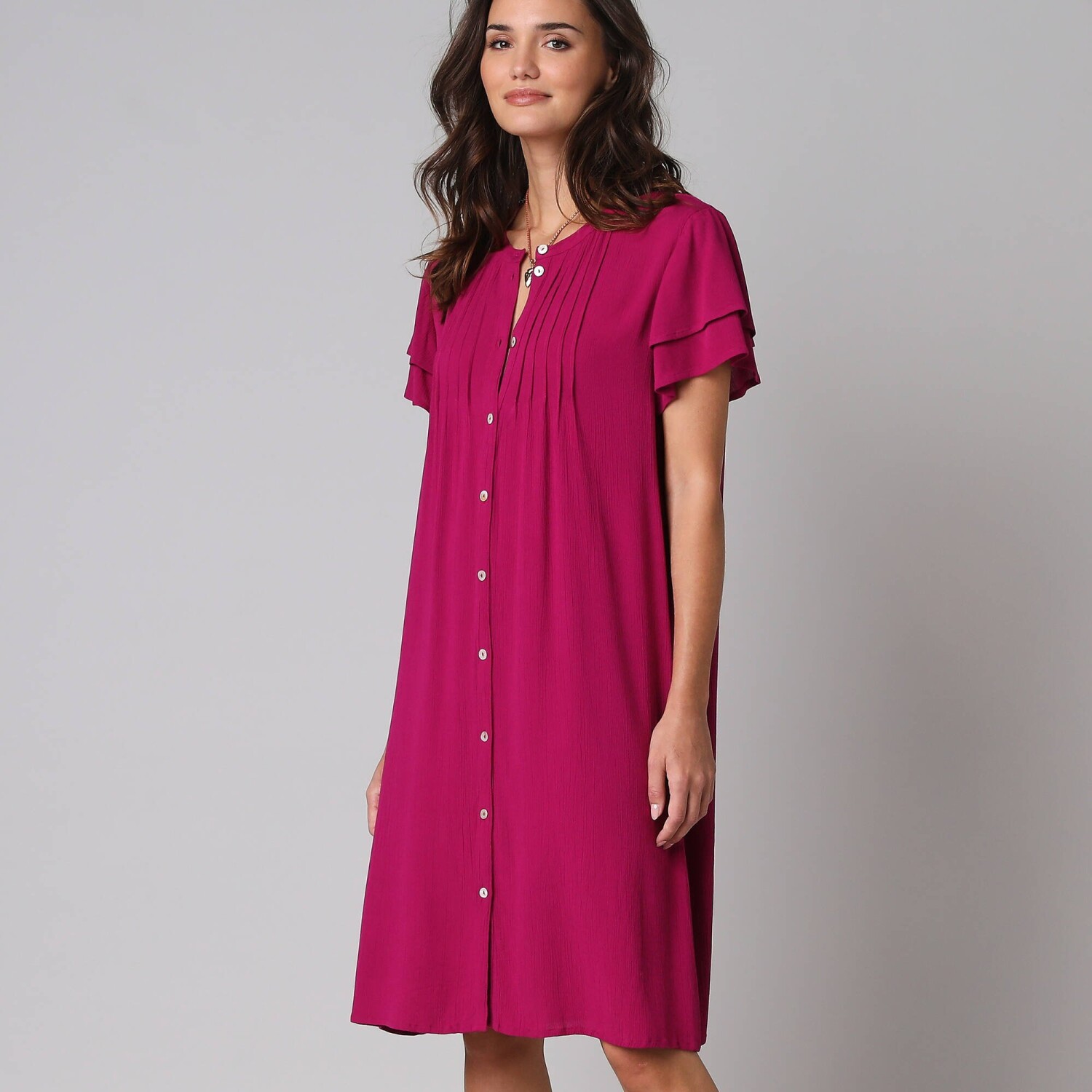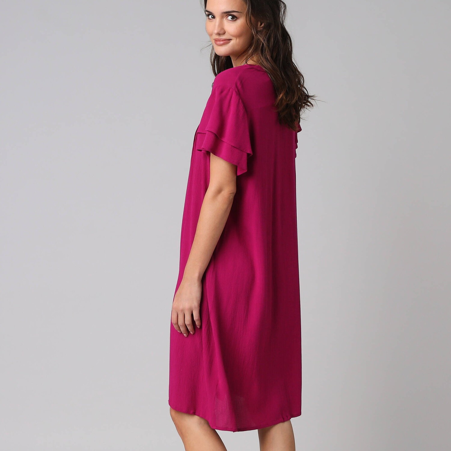 Rozkloszowana sukienka z falbanami i etnicznym dwukolorowym wzorem to bezpieczny wybór. Dekolt tuniki i zapięcie na guziki w talii. Rękawy 3/4. Rozkloszowany dół z falbanami. Długość przed kolano. Dwukolorowy etniczny nadruk. Można prać w pralce.