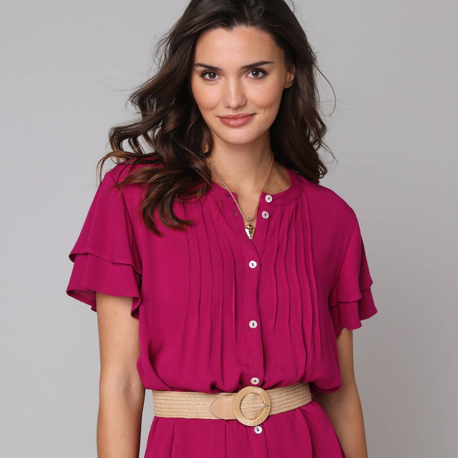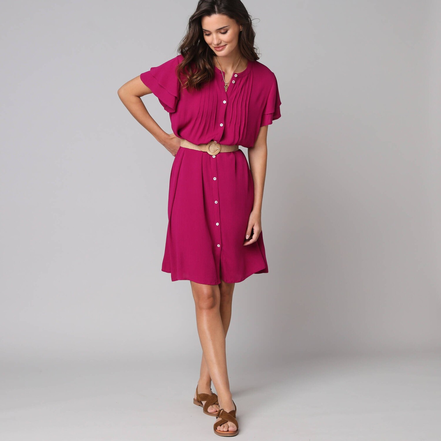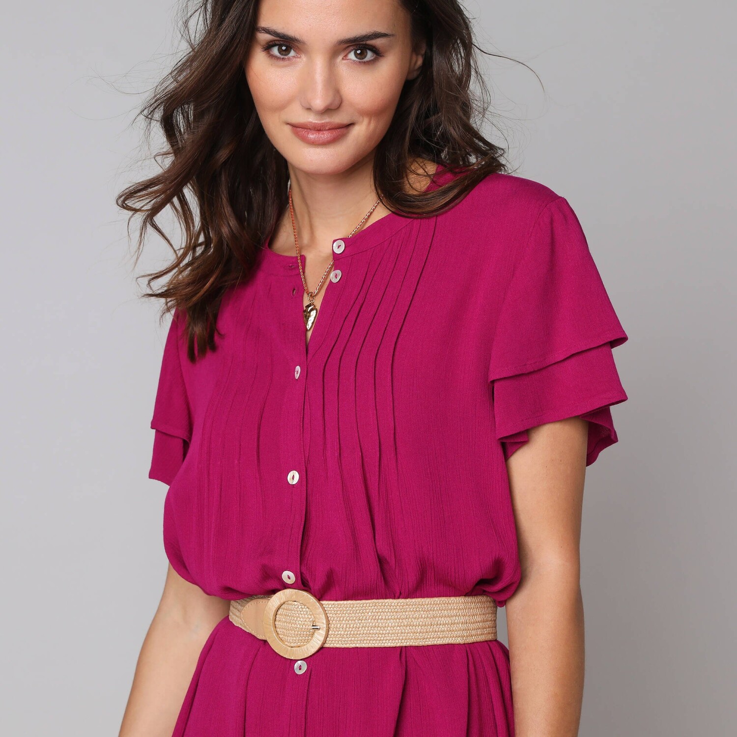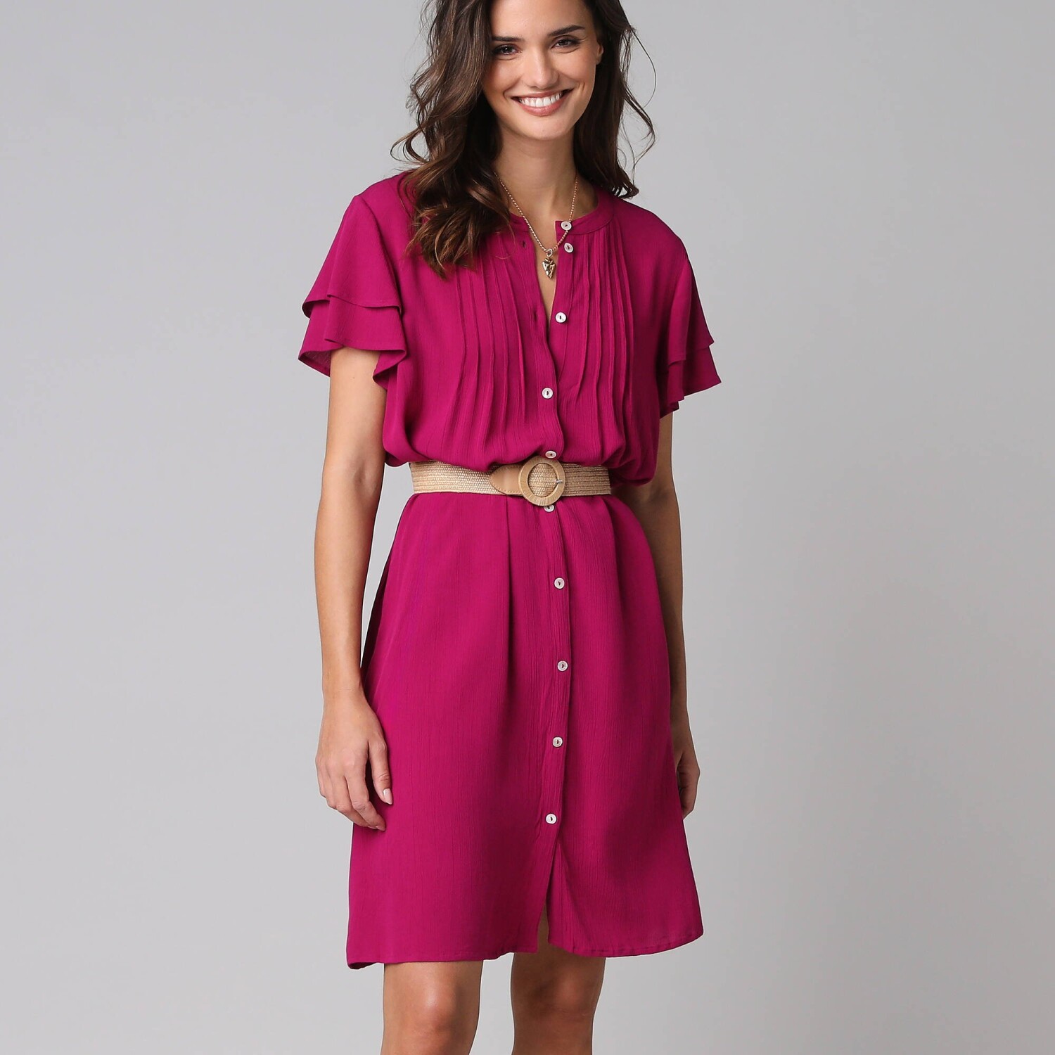 Rozkloszowana sukienka z falbanami i etnicznym dwukolorowym wzorem to bezpieczny wybór. Dekolt tuniki i zapięcie na guziki w talii. Rękawy 3/4. Rozkloszowany dół z falbanami. Długość przed kolano. Dwukolorowy etniczny nadruk. Można prać w pralce.