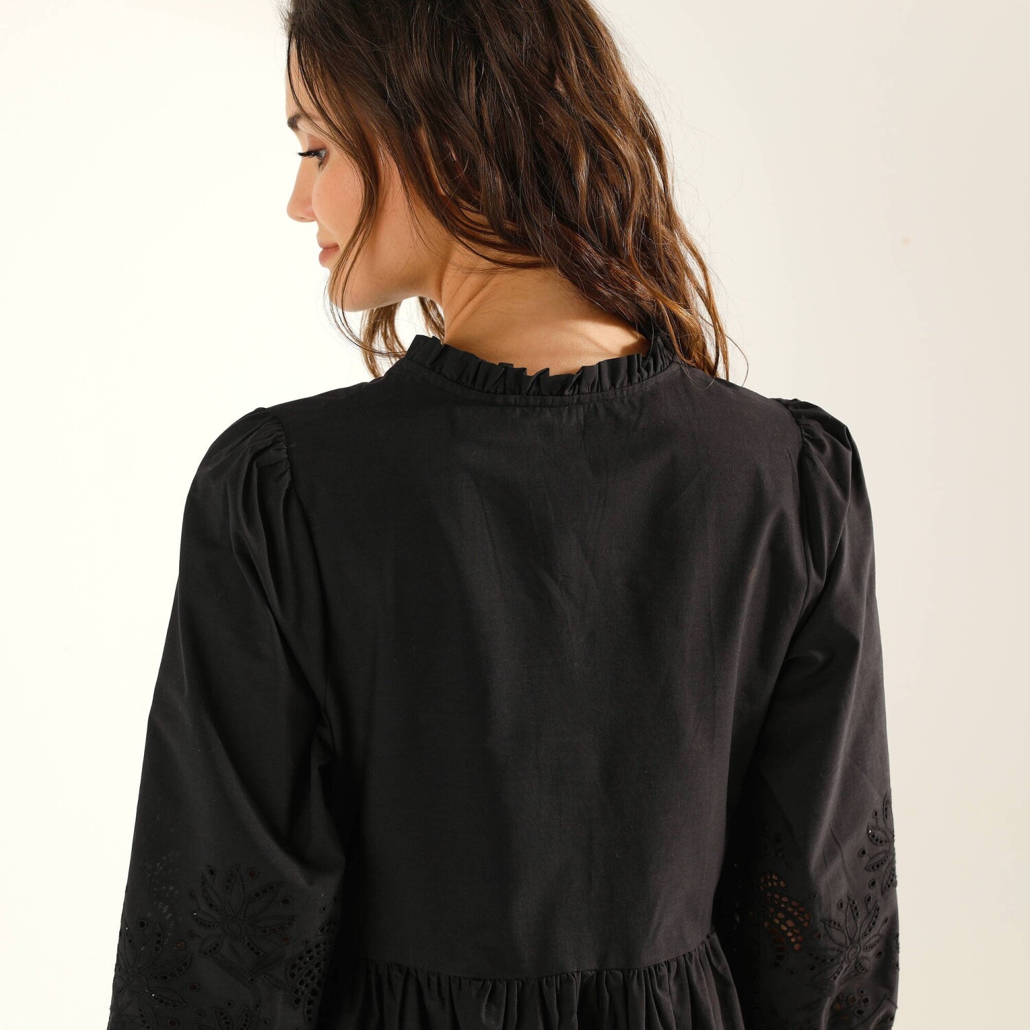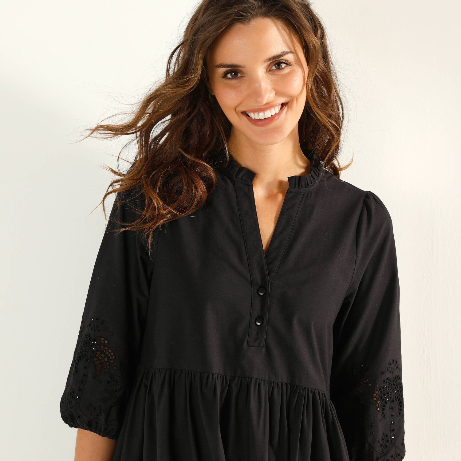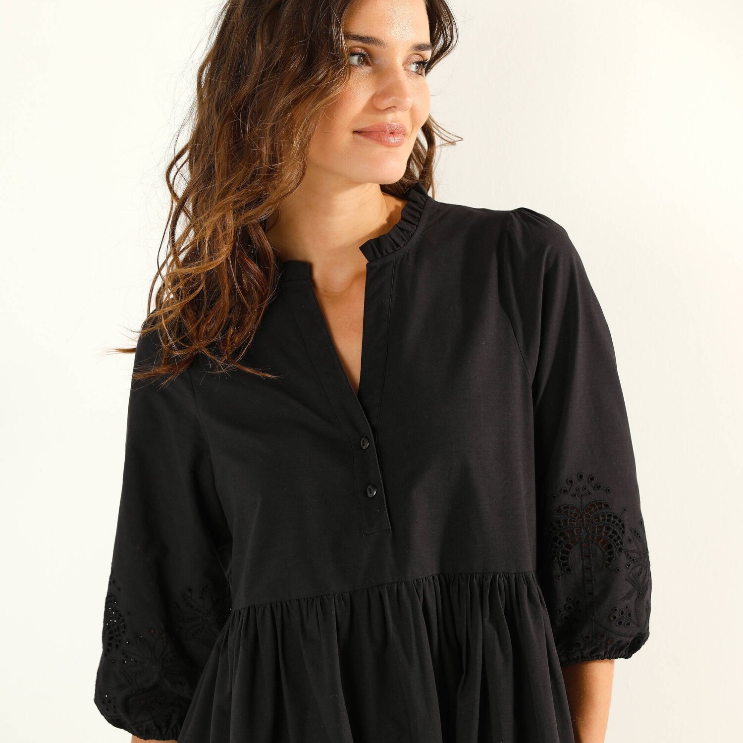 Ta krótka biała sukienka jest idealna na lato: dzięki uwodzicielskiemu dekoltowi, makramie i koronkowym zdobieniom wyróżnia opaloną skórę. Długość przed kolano. Głęboki dekolt V z makramą. Krótkie koronkowe rękawy. Makramowy pasek w talii + marszczenie. Rozcięcie z tyłu i marszczenia. Prosty dół. Można prać w pralce.