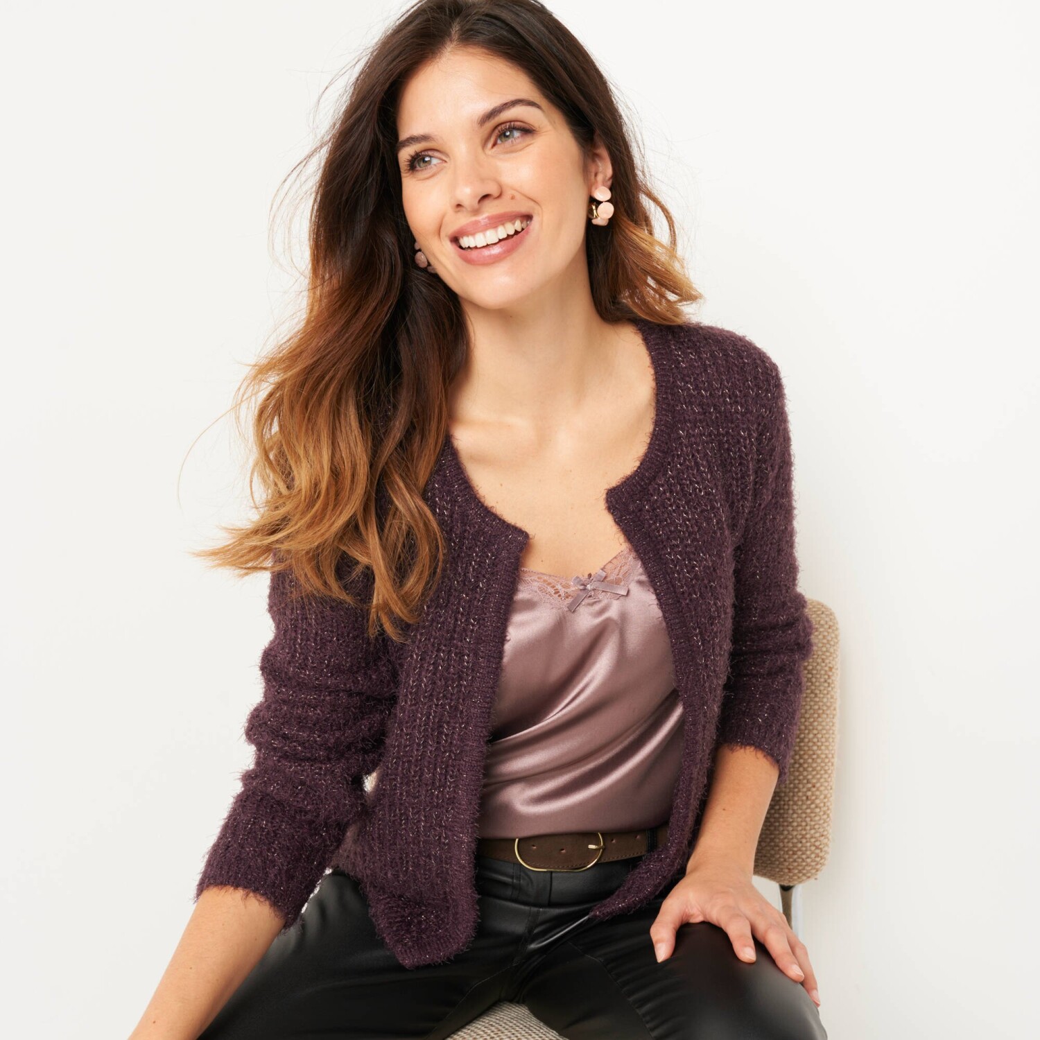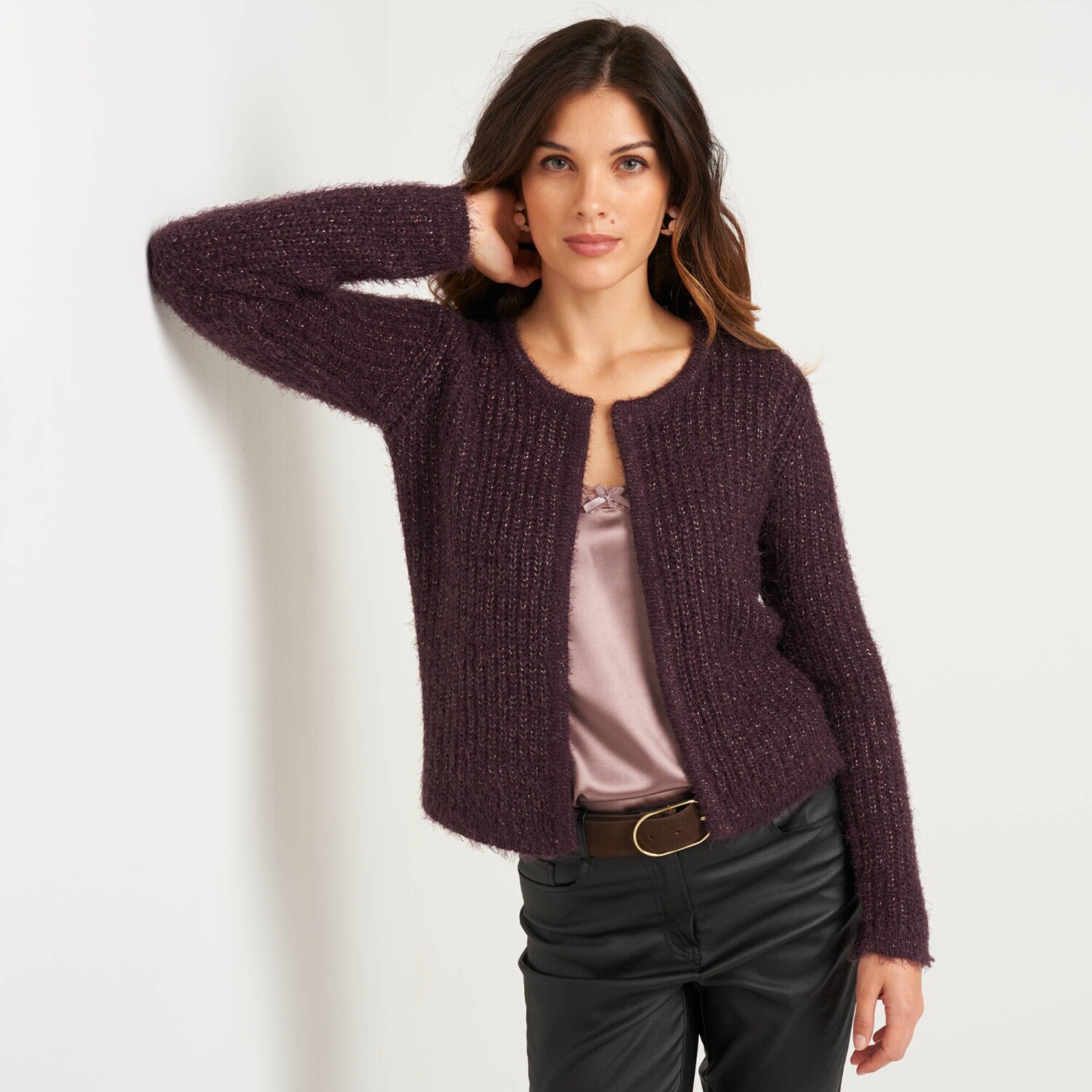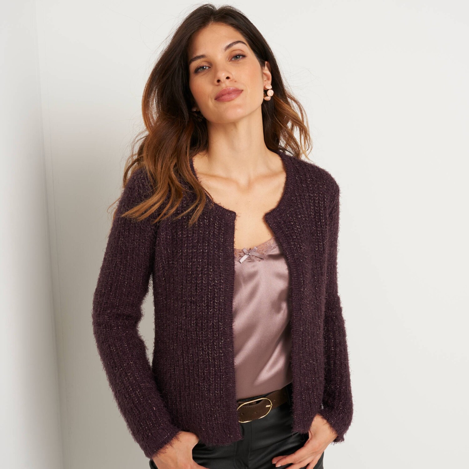 Krótki kardigan na drobną sylwetkę, wykonany z dzianiny z meszkiem