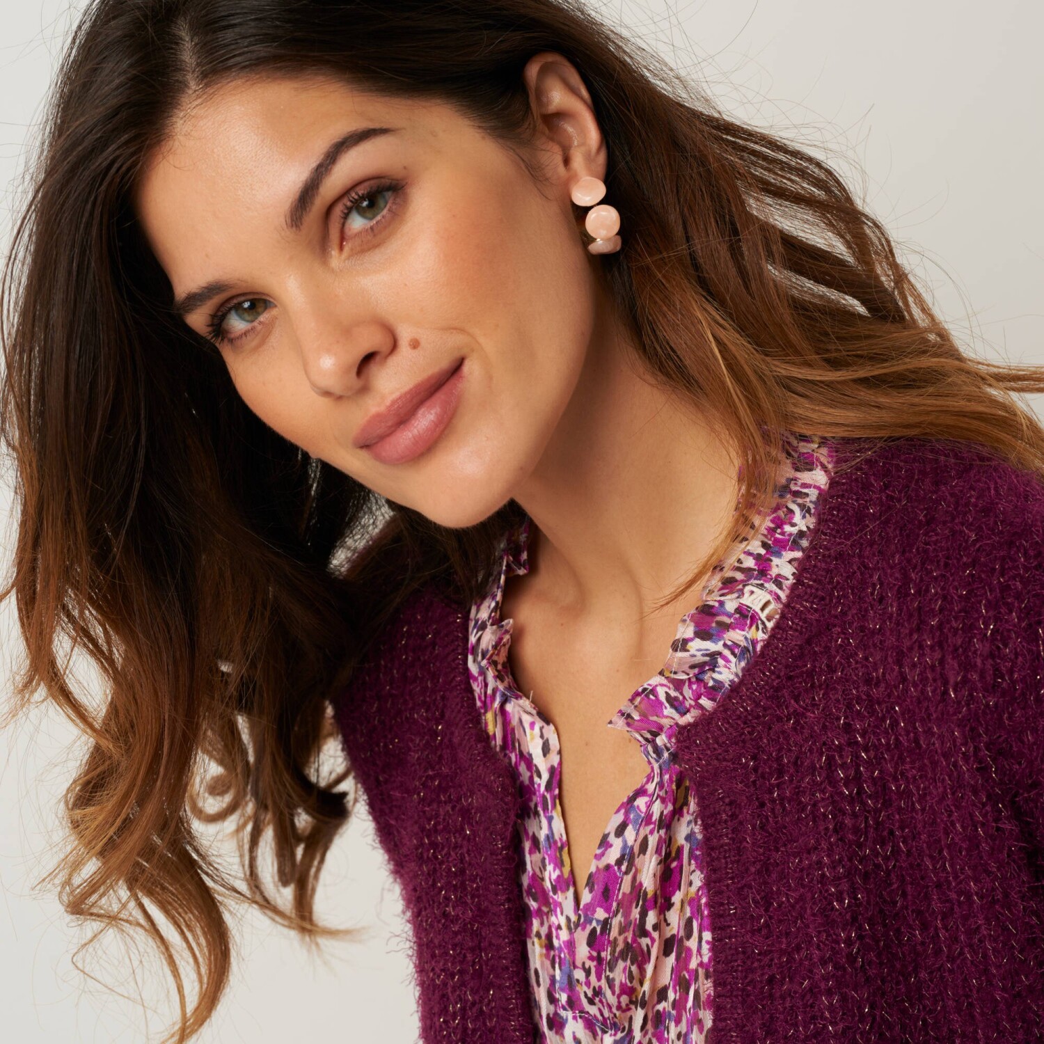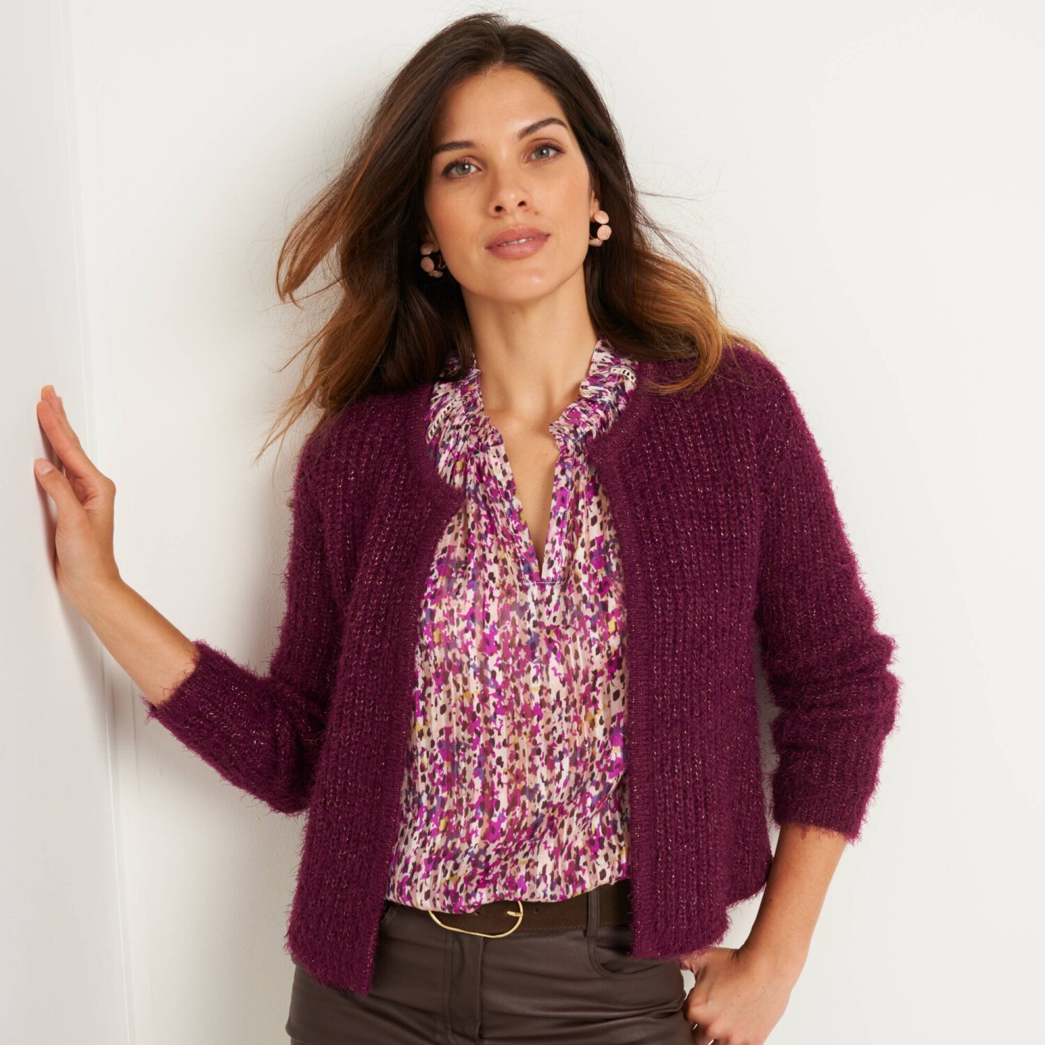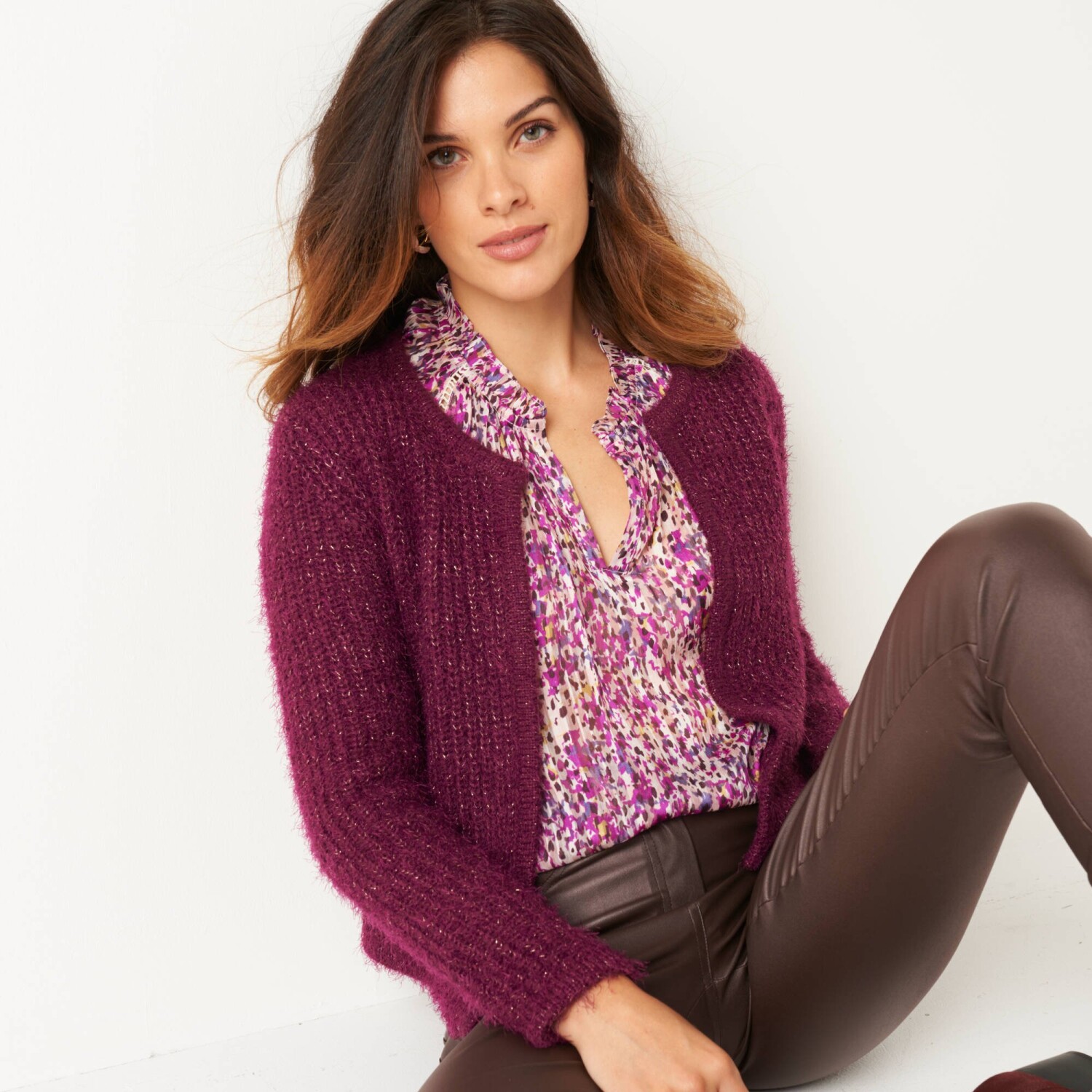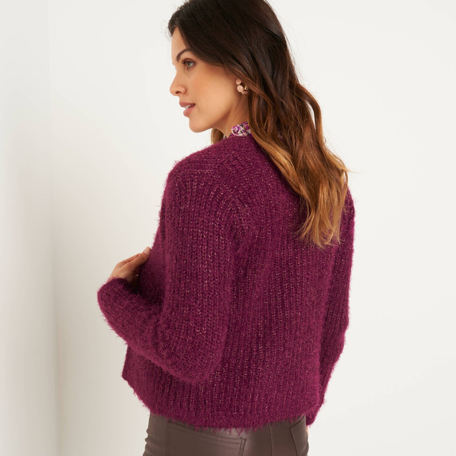 Dekolt w serek z makramowym zdobieniem. Bez zapięcia. Długie, proste rękawy ze ściągaczami. Prosty, ściągaczowy dół. Można prać w pralce.