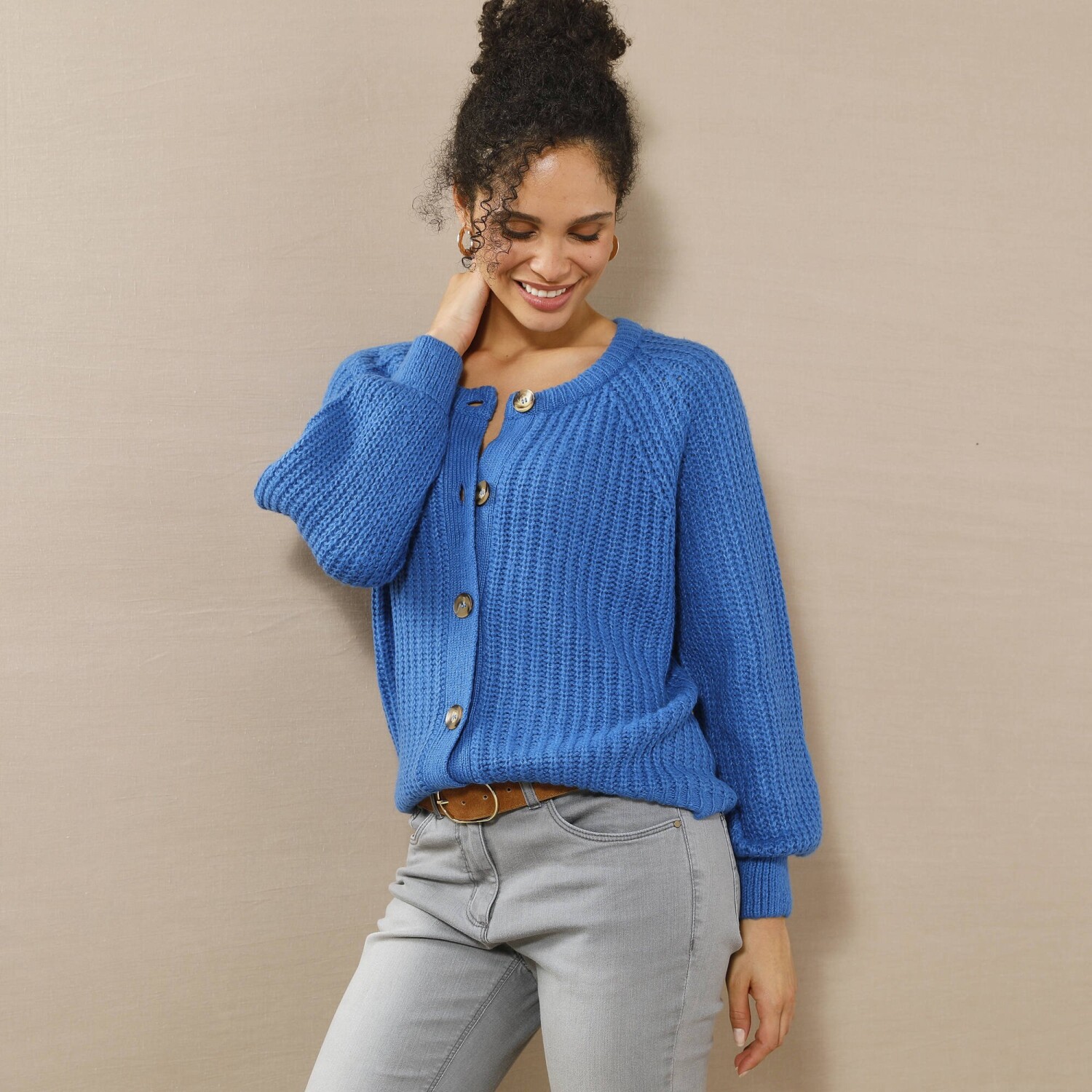 Miękki sweter o gładkiej dzianinie ma luźny krój i pasuje do każdej sylwetki. Okrągły dekolt. Duże guziki w kształcie rogu. Długie, lekko bufiaste rękawy z raglanowymi otworami na ramiona. Prosty dół. Można prać w pralce.