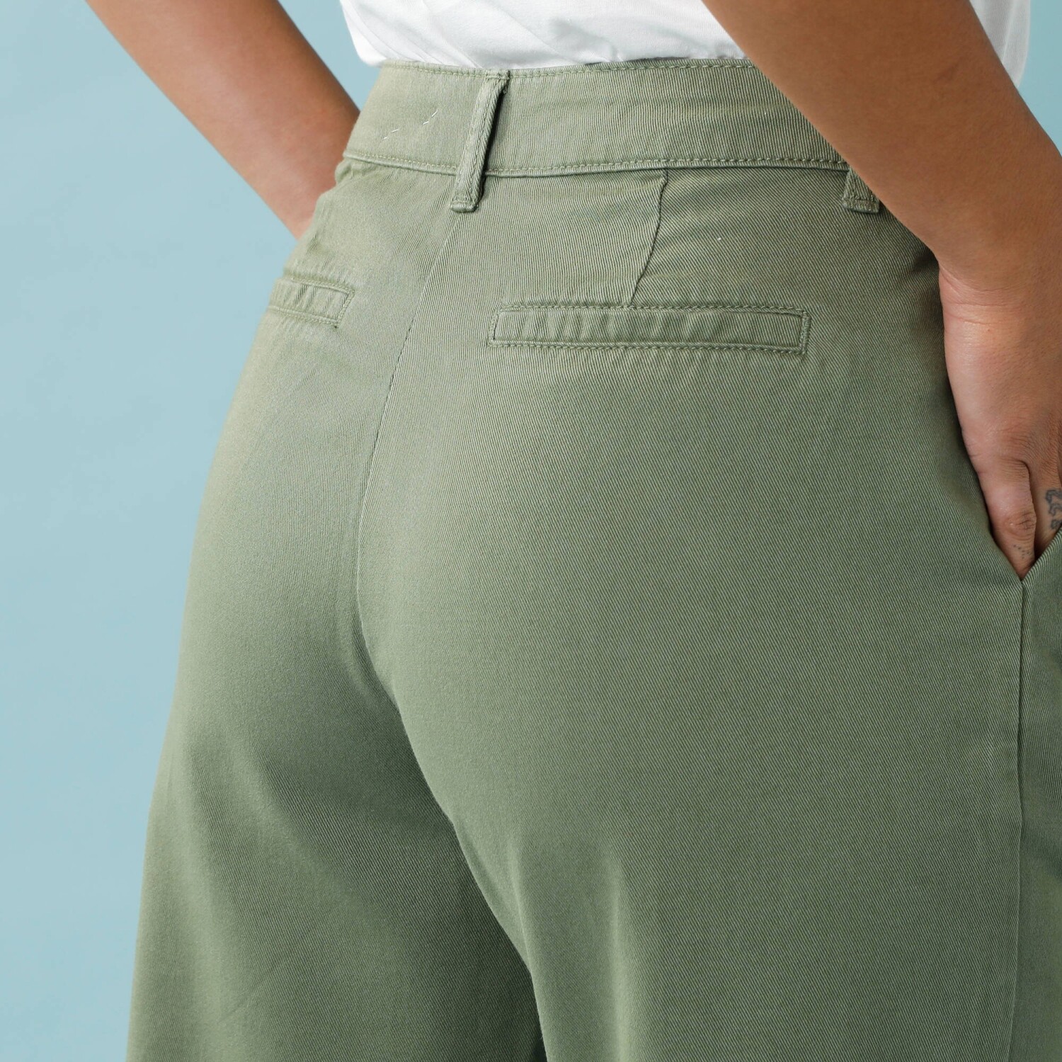 Noś zwiewne spodnie w tym sezonie! Oferujemy je w skróconej długości i z wygodnego materiału. Przewiewna, miękka wiskoza. Normalna wysokość talii. Wyprofilowana talia ze szlufkami. Zapięcie na suwak + guzik z przodu. 2 kieszenie ze ściągaczem. 2 naszywane kieszenie z tyłu. 2 naszywane kieszenie z tyłu. Fałdy u dołu nogawek. Spodnie wykończone obszyciem z podwójnym guzikiem. Ten produkt został wykonany z wiskozy Lenzing™ EcoVero™. EcoViscose to materiał wykonany z pulpy pochodzącej z lasów zarządzanych w sposób zrównoważony. Proces produkcji zużywa mniej wody i energii. Można prać w pralce.