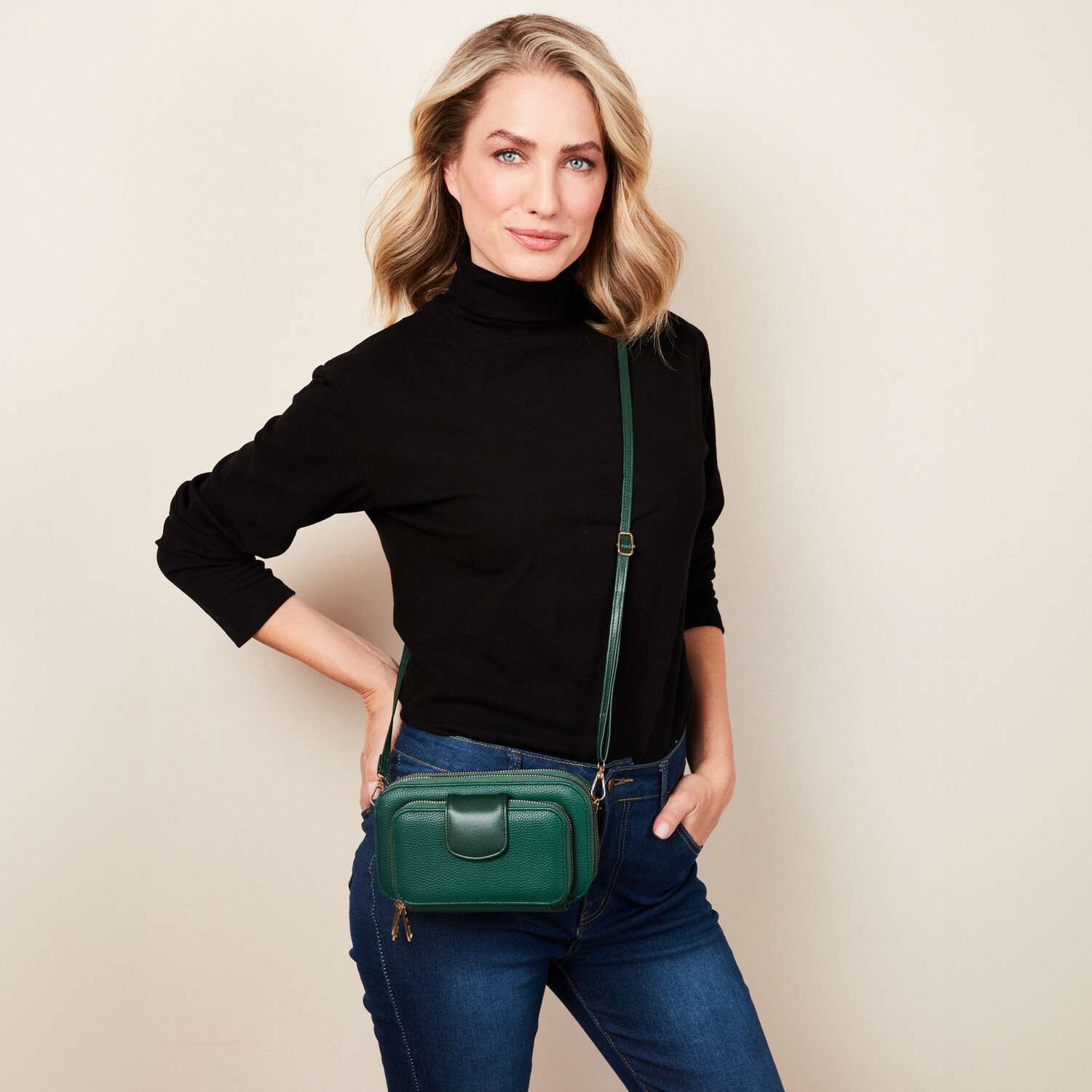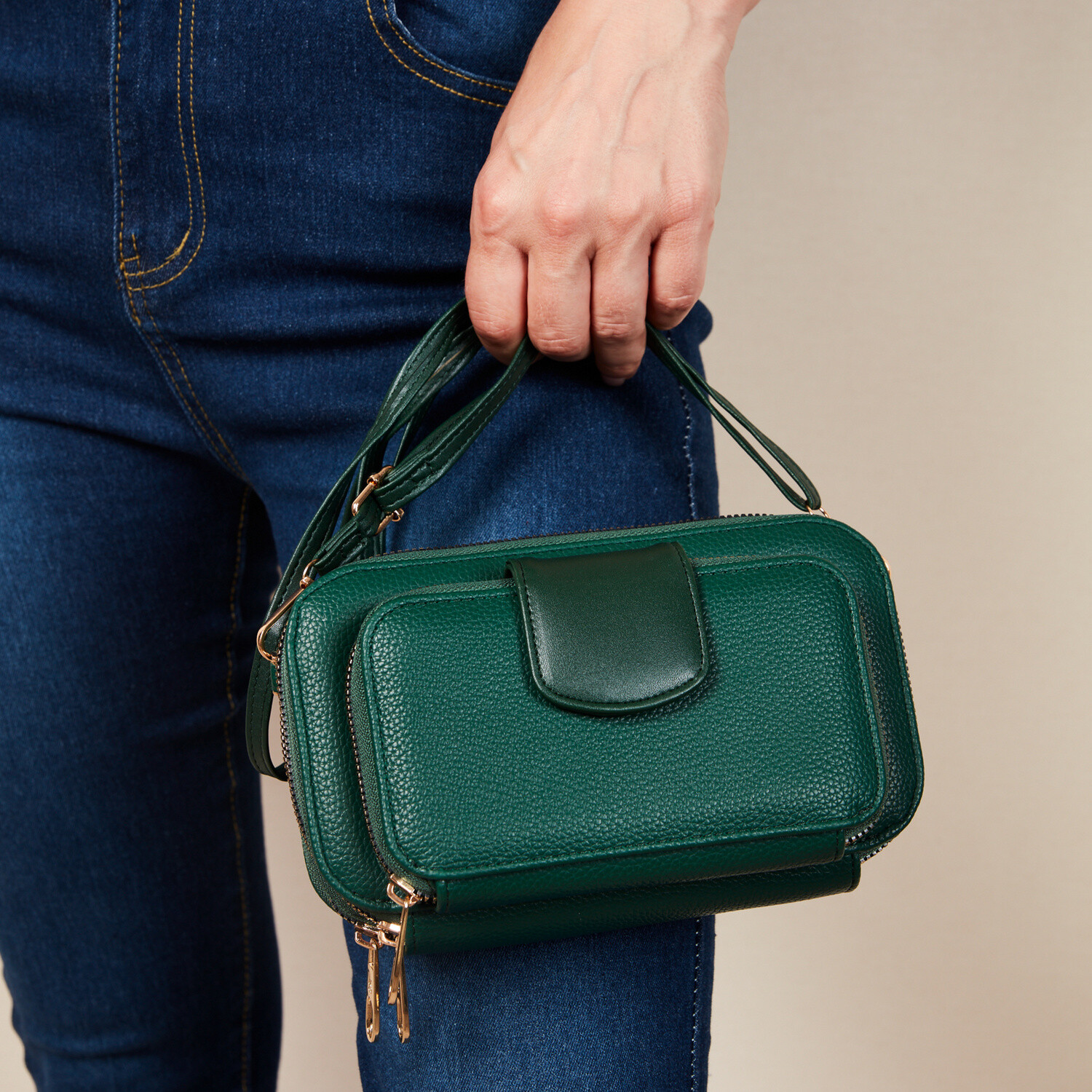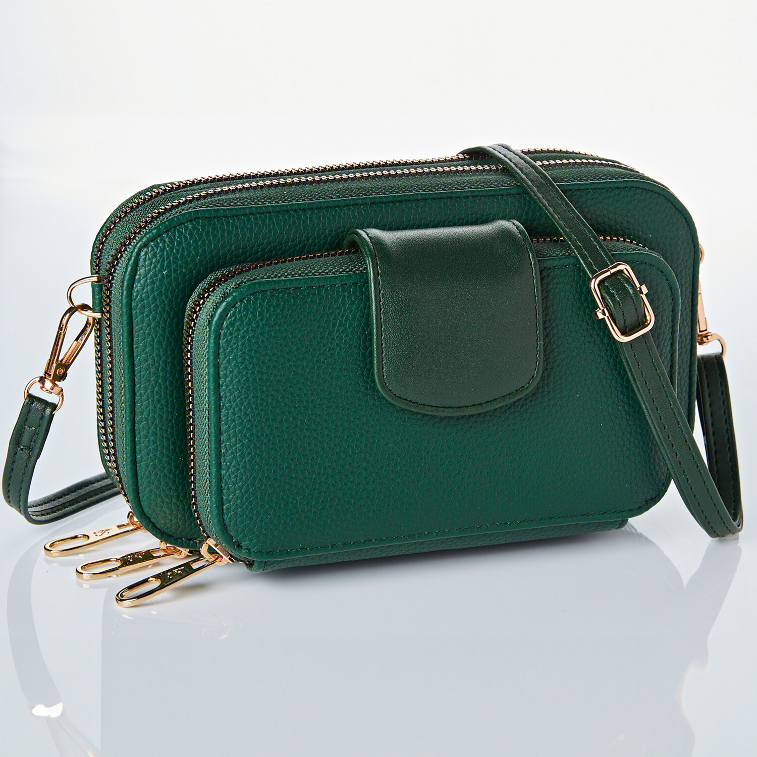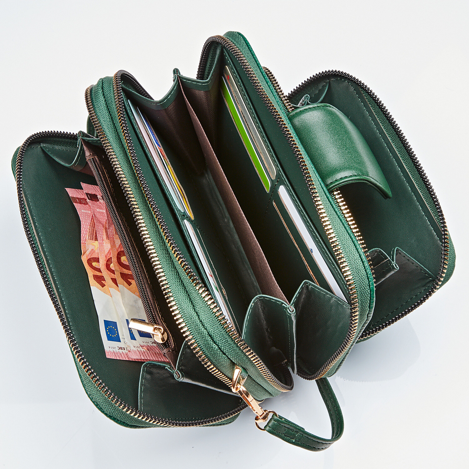 Podwójnie praktyczna: portmonetka z przegrodami na monety, banknoty i karty, a z tyłu torebka z 2 przestronnymi przegrodami na suwak, dodatkowymi miejscami na karty i kieszenią na telefon komórkowy. Elegancka imitacja skóry, z odpinanym paskiem na ramię, może być również noszona jako kopertówka.