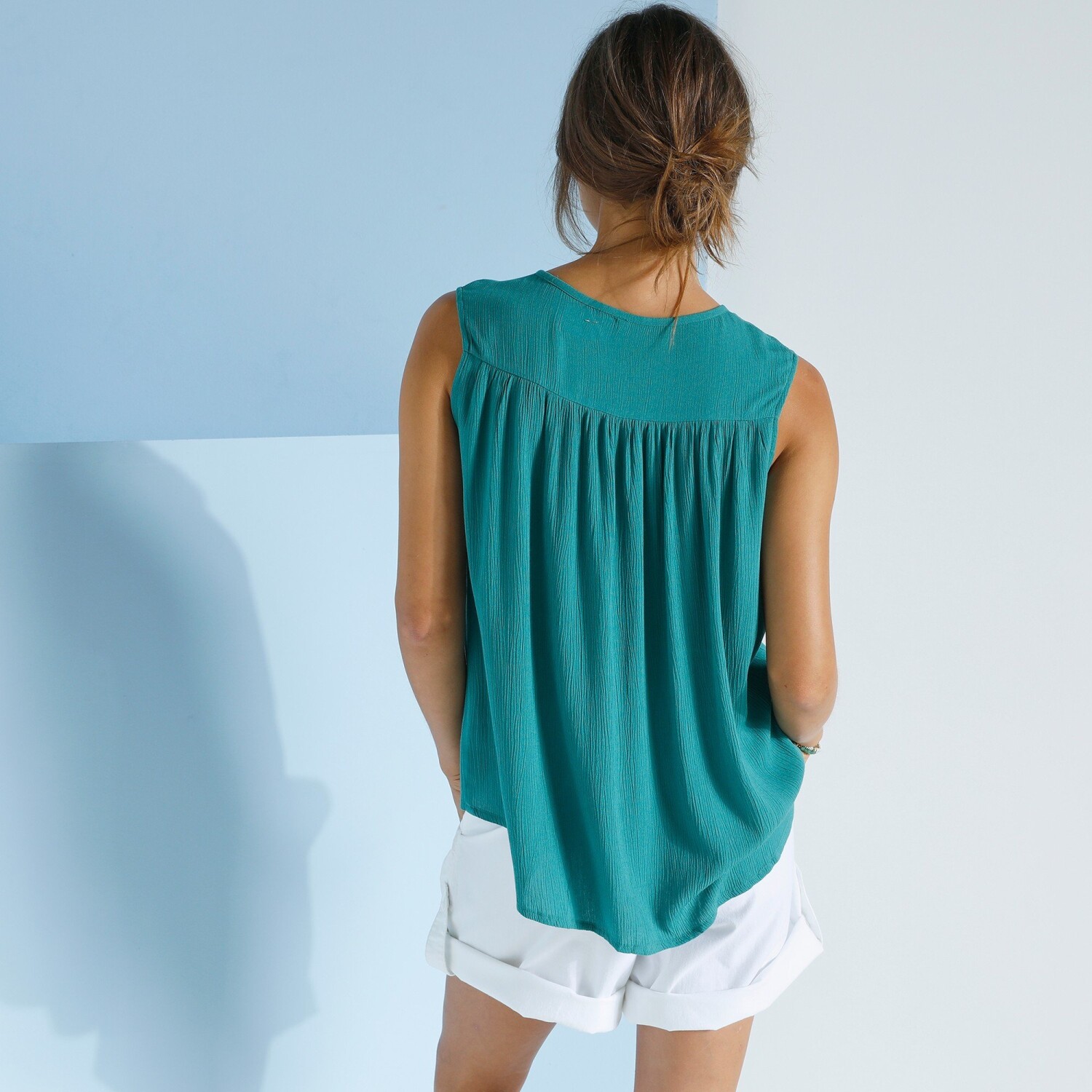Minimalistyczny nadruk zapewniający efekt maxi, to stylowa tunika. Okrągły dekolt z wycięciem. Krótkie rękawy z wywinięciem. Zaokrąglony dół z przodu i z tyłu. Oddychający materiał krepowy, który jest wygodny w noszeniu. Można prać w pralce.