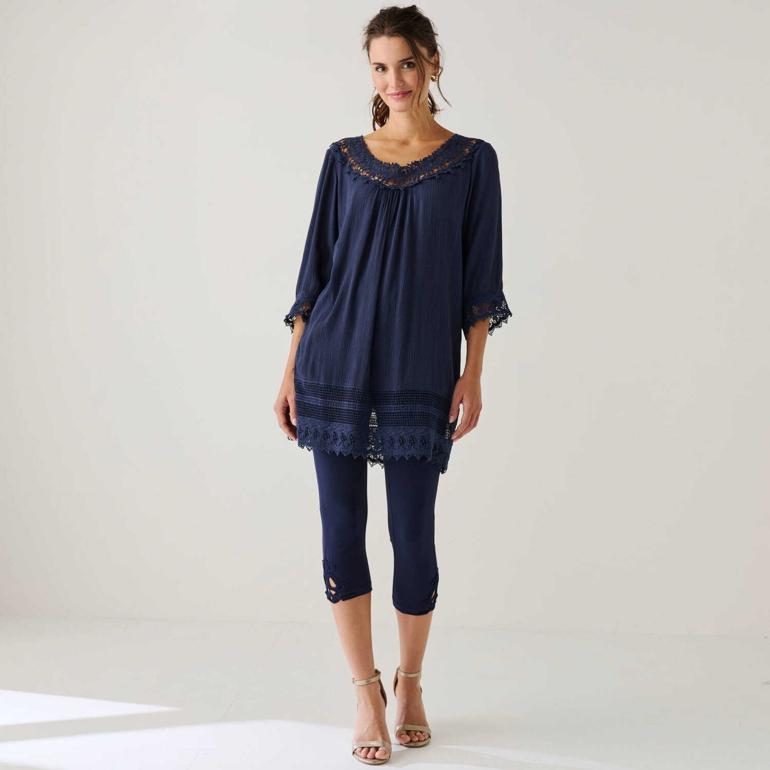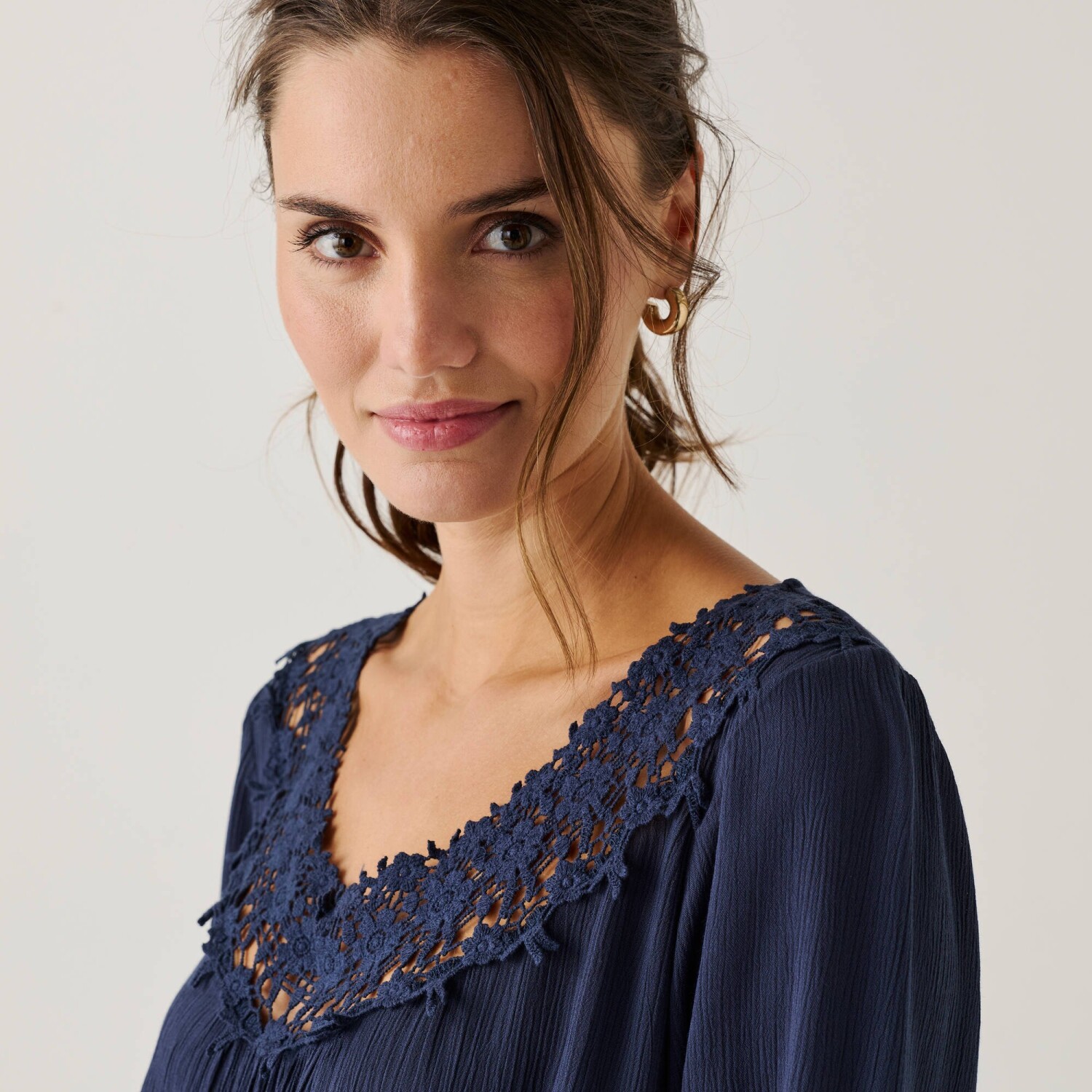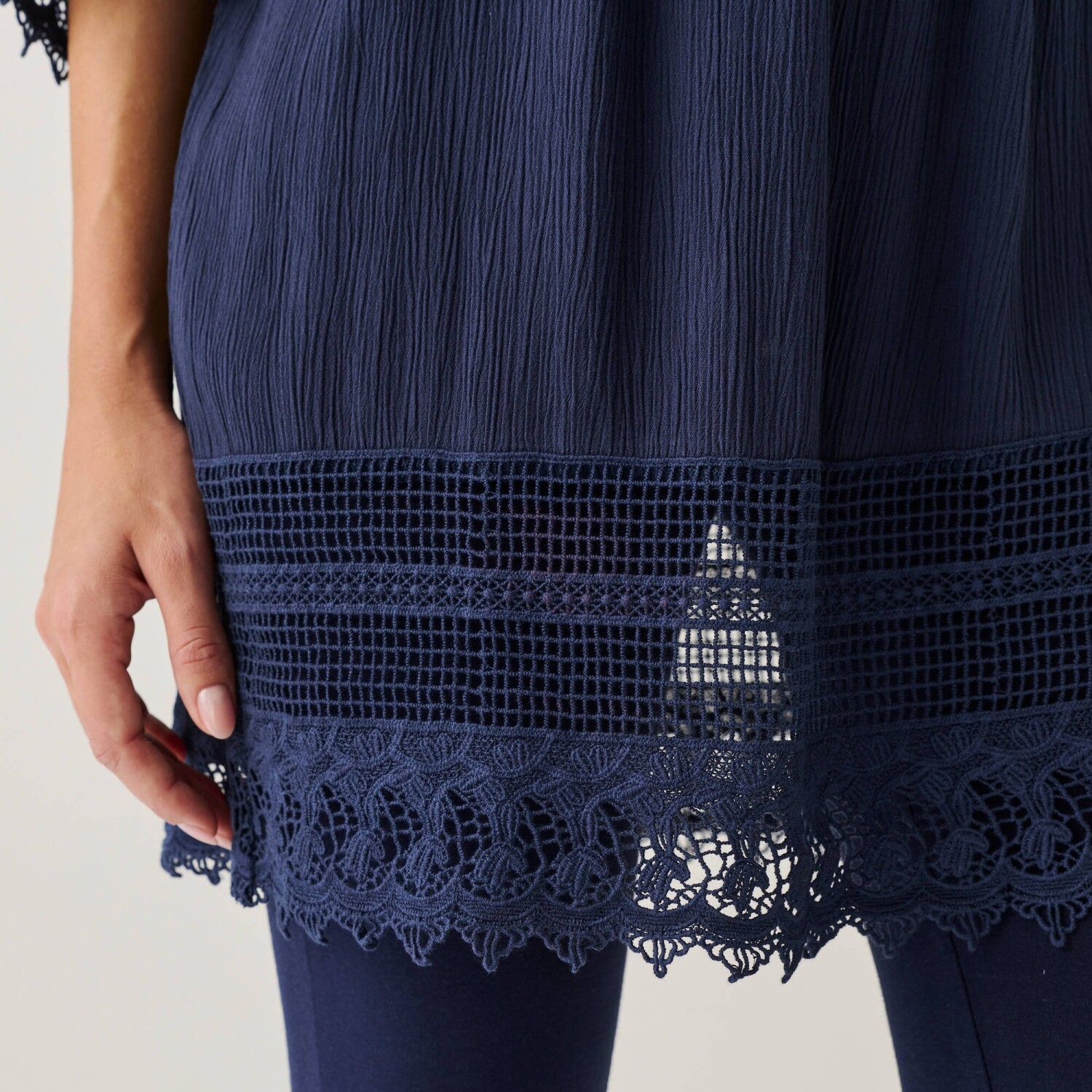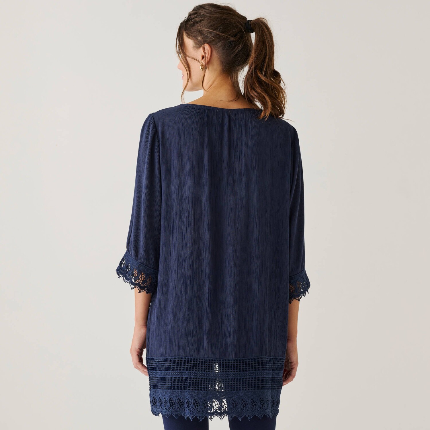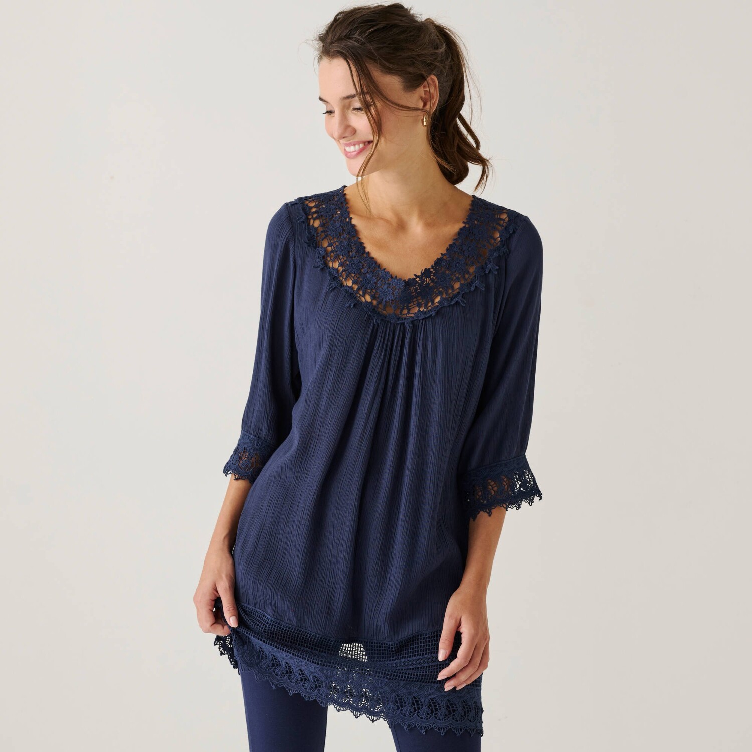 Wygodna szerokość, drobne zakładki i piękny wzór makramy: ta modna tunika przyciągnie Twoją uwagę. Okrągły dekolt. Zapięcie na guziki z oczkami z przodu. Przeszywane zakładki z przodu. Rękawy 3/4 z wstawką z makramy. Prosty dół. Można prać w pralce.