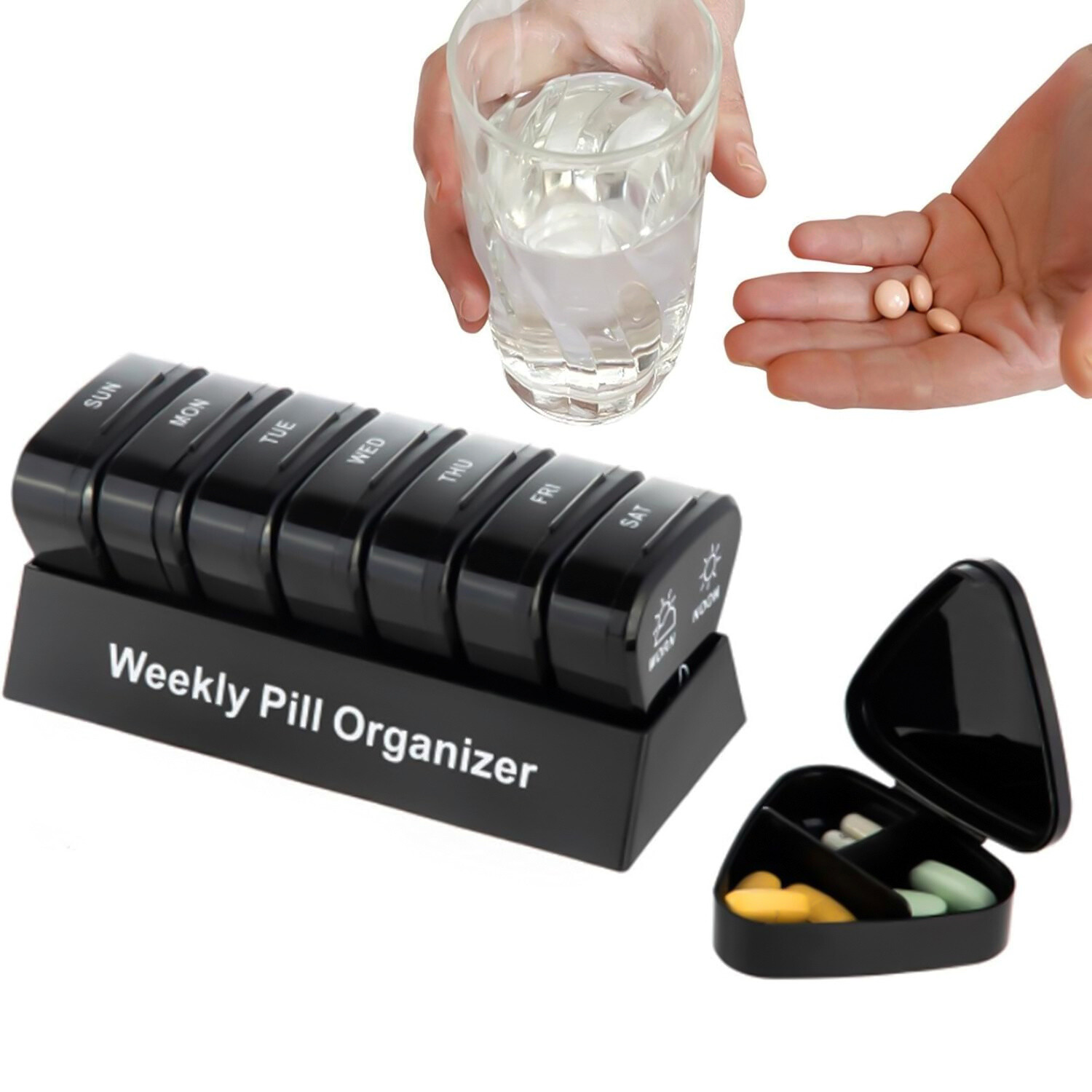 Przygotuj się na cały tydzień: 7 pudełek na tabletki na każdy dzień tygodnia. Każde z 3 przegródkami na poranek, południe i wieczór. Idealne w podróży – przejrzyste przy regularnym stosowaniu. Optymalnie przygotowane do użycia. Większa przejrzystość. Kieszonkowy rozmiar.