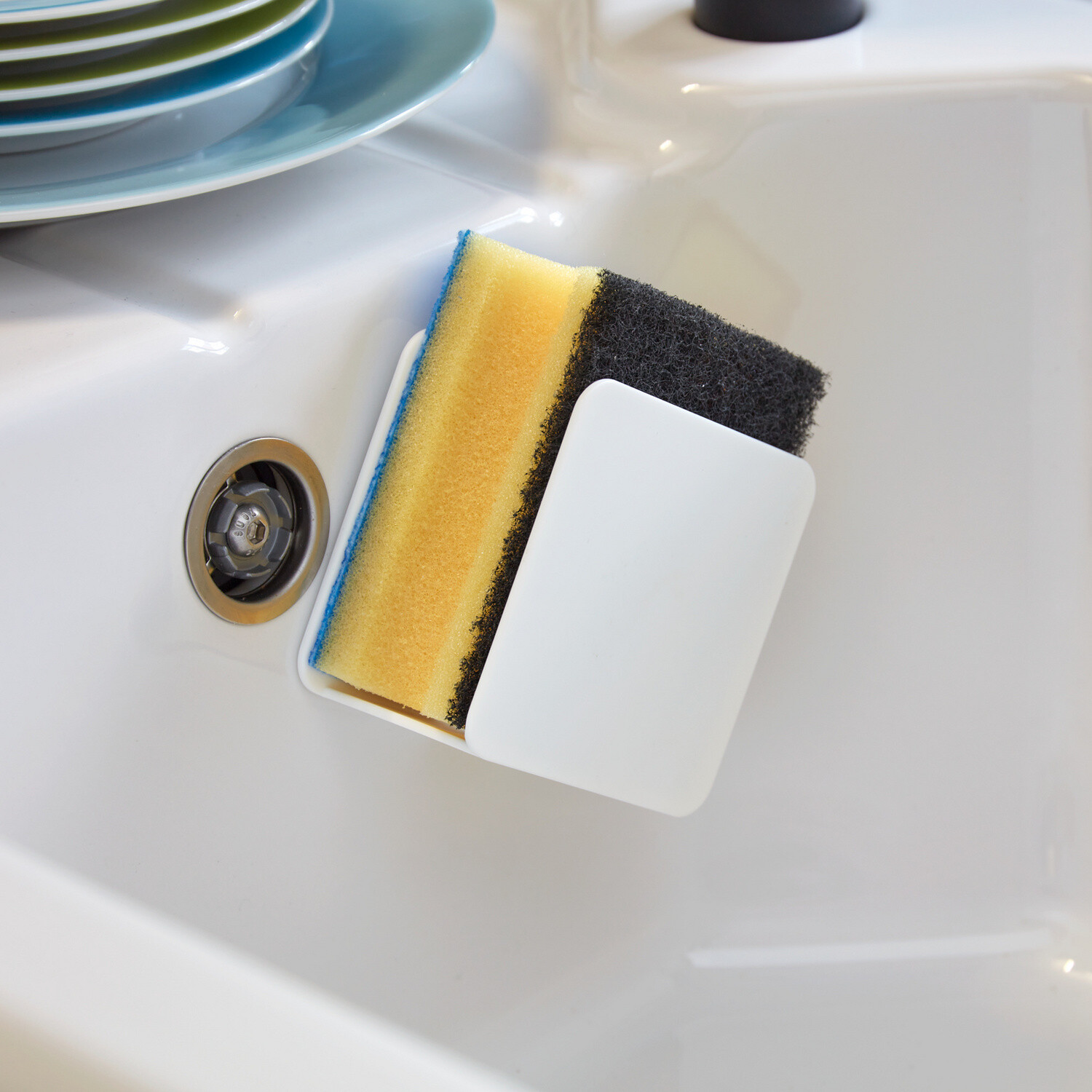 Praktyczny uchwyt na gąbkę, który utrzymuje ją nawet gdy jest mokra. Woda może odpłynąć, a gąbka do naczyń wysycha szybciej!