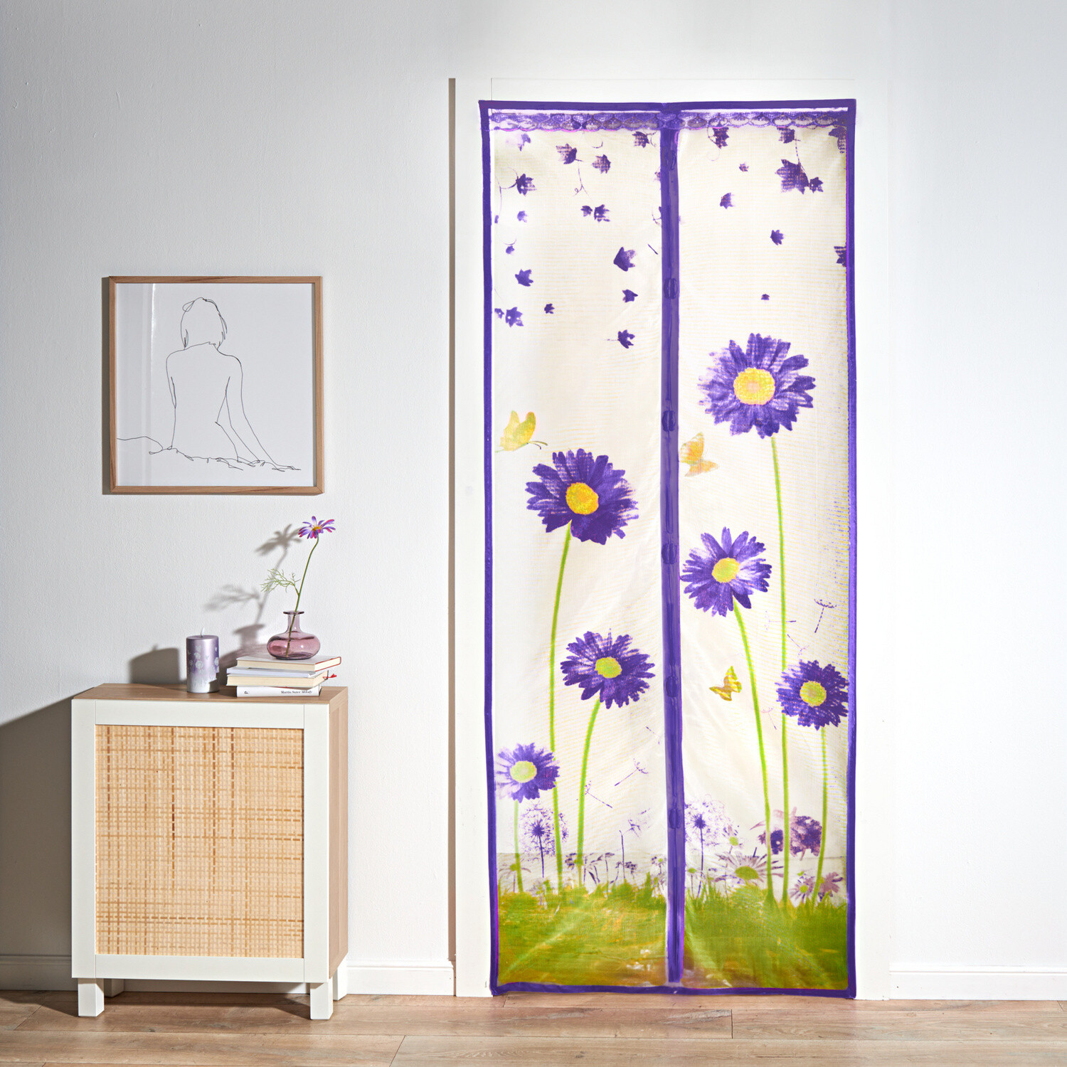 Ciesz się latem przy otwartych drzwiach - z dala od owadów i ciekawskich spojrzeń. Dekoracyjna moskitiera o drobnych oczkach przepuszcza powietrze i zamyka się automatycznie za pomocą magnesów. Łatwa do zamocowania, taśma samoprzylepna i pinezki są w zestawie.