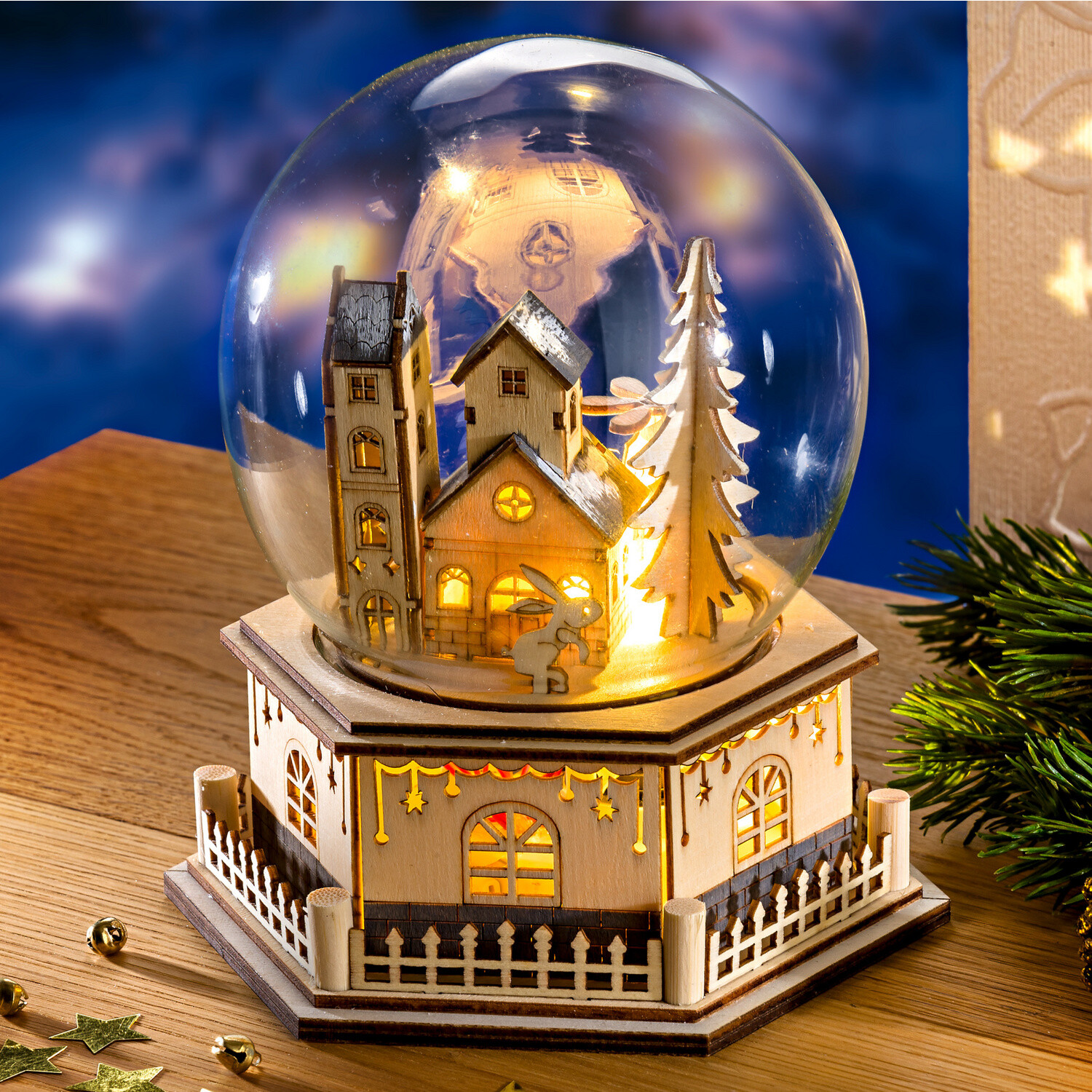 Nasza perfekcyjnie wykonana szklana kula z uroczystym oświetleniem odtworzy 8 najpopularniejszych melodii bożonarodzeniowych. Światło i muzykę można regulować osobno.