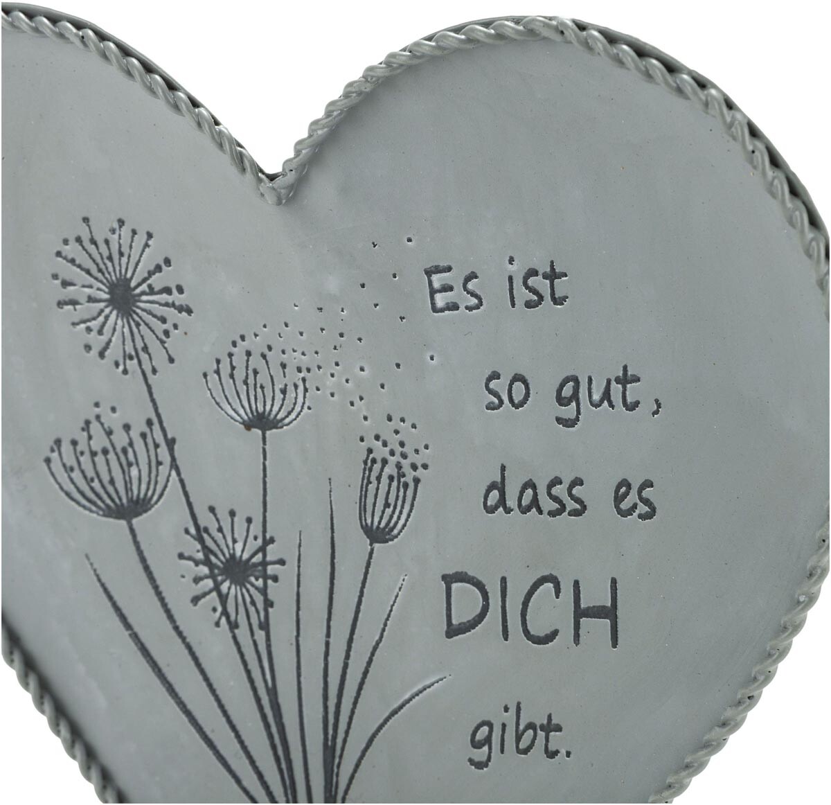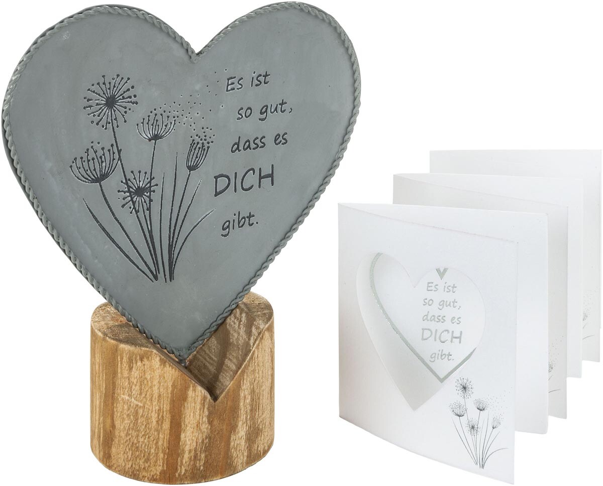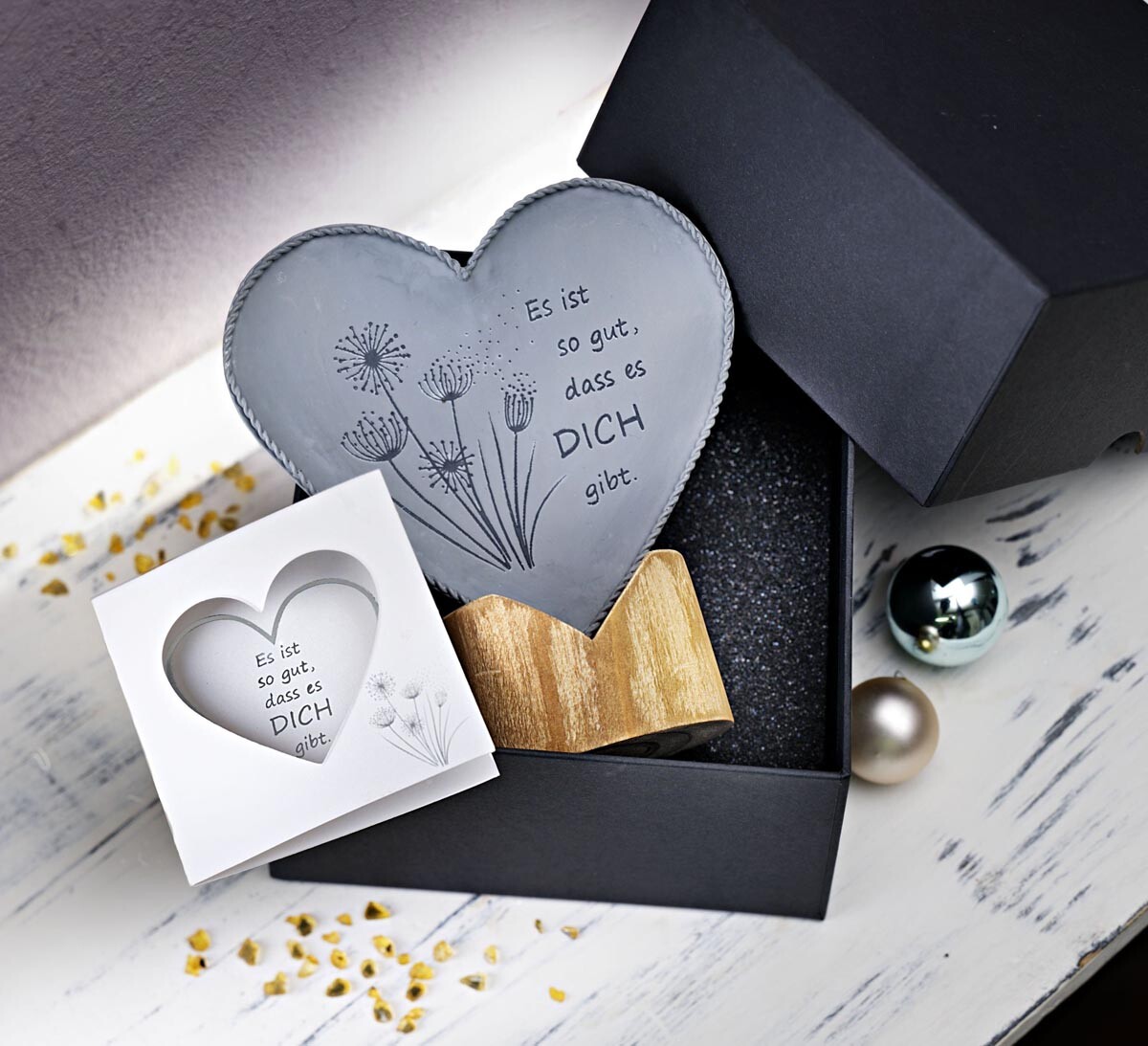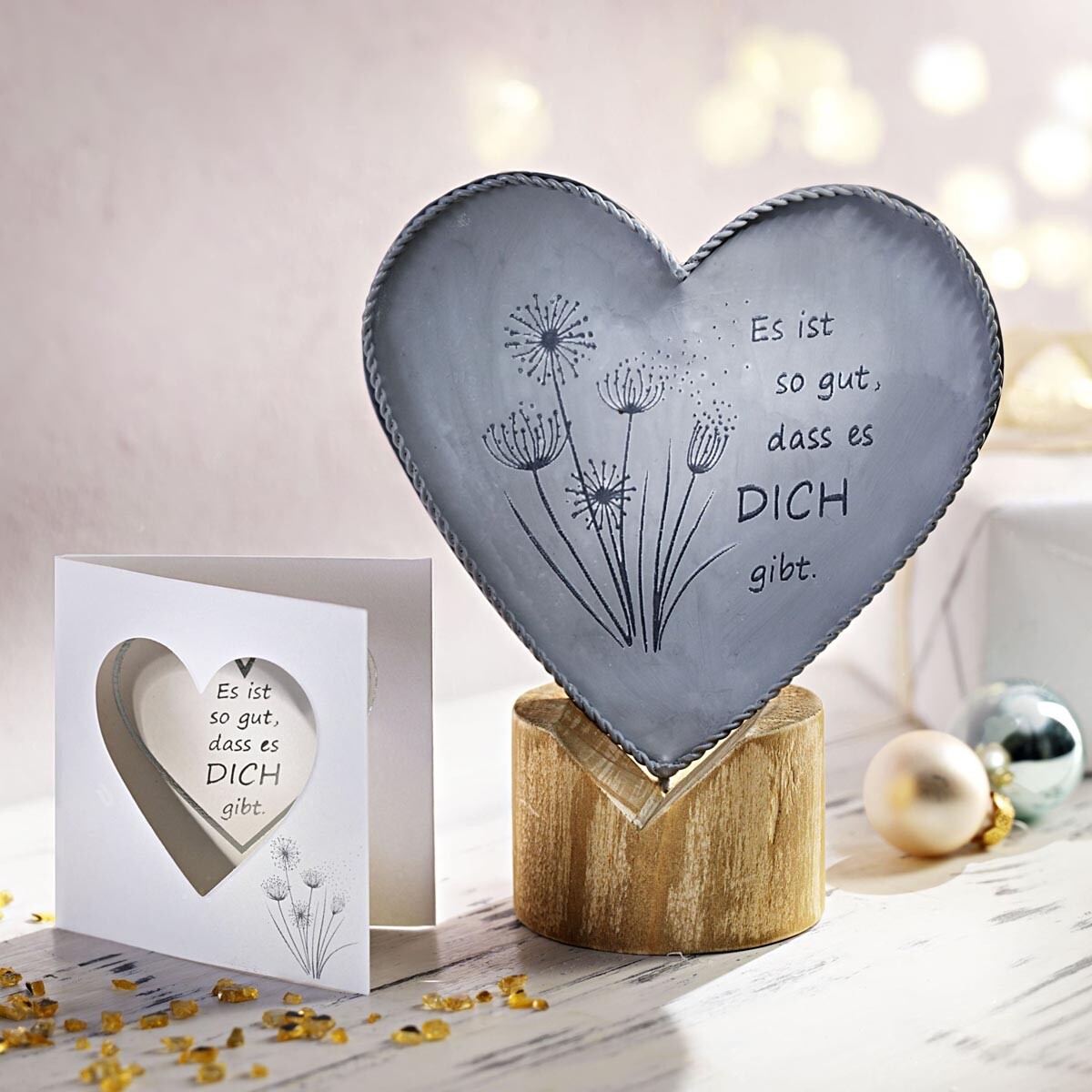 Piękna metalowa dekoracja w kształcie serca na drewnianej podstawie z delikatnym motywem kwiatowym i uroczym napisem w języku niemieckim. W zestawie znajduje się dopasowana kartka z tym samym motywem i tekstem. Idealny, serdeczny prezent dla wyjątkowej osoby – na urodziny, Boże Narodzenie lub po prostu z miłości czy wdzięczności. Materiał: metal, drewno. Wysokość: 14 cm.