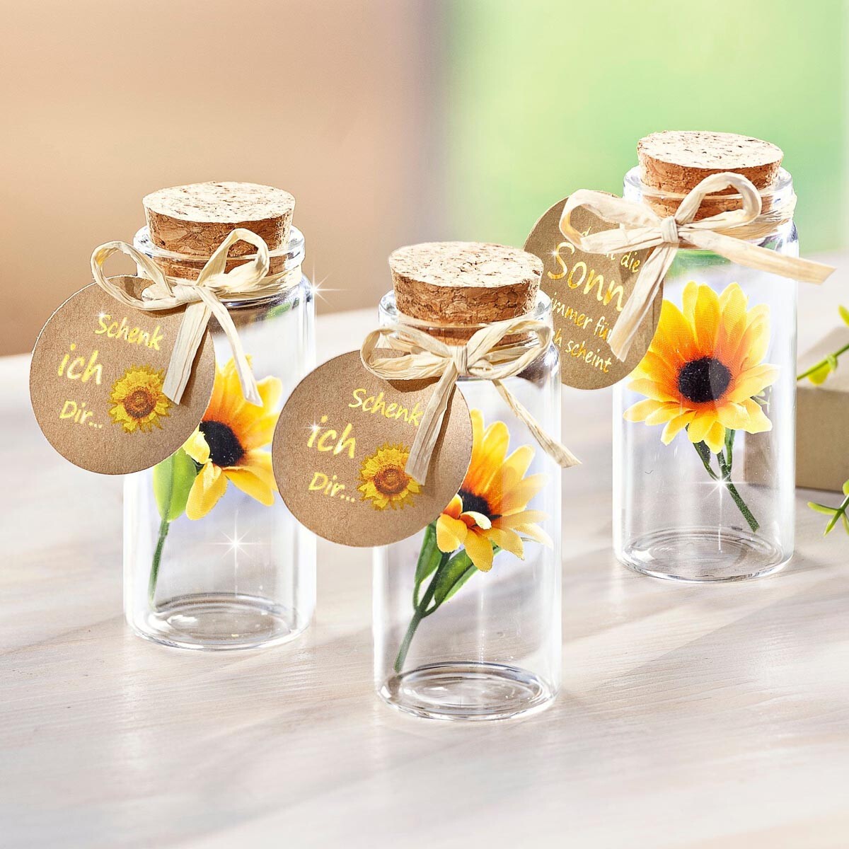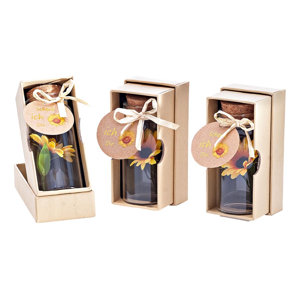 Trzy eleganckie słoiczki z korkowym zamknięciem, z których każdy kryje w sobie promienny sztuczny słonecznik – symbol radości i pozytywnej energii. Uzupełnione stylową zawieszką ze złotym napisem i rafią. Ta mała szklana dekoracja jest idealna na drobne upominki, pieniądze, biżuterię lub jako miłe podziękowanie. Każdy słoiczek jest osobno zapakowany w ozdobne pudełko. Doskonały prezent dla tych, na których ci zależy. Materiał: szkło, tworzywo sztuczne. Wymiary: wysokość 8 cm, średnica 3,5 cm.